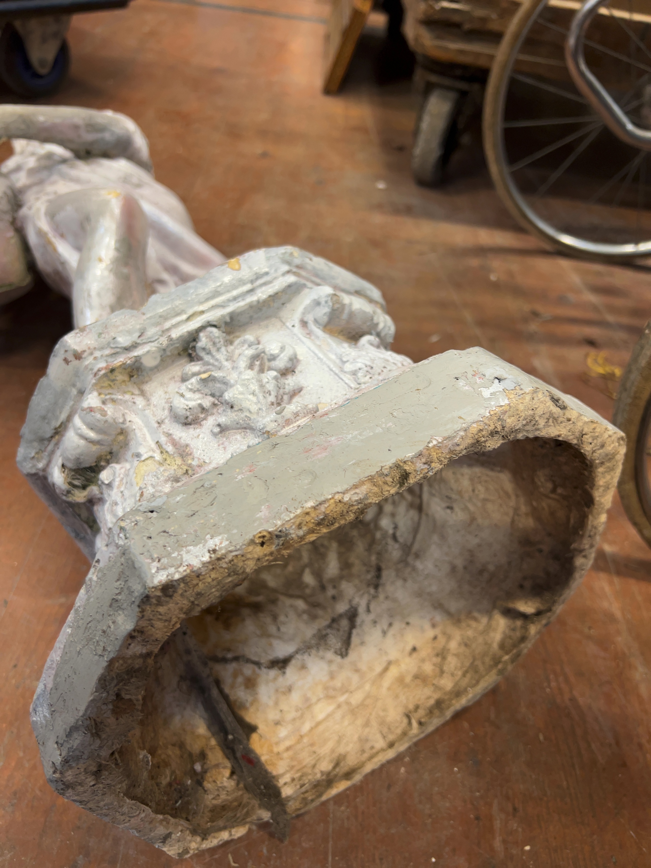 The statue exhibits significant weathering and age-related wear. The painted off-white finish is extensively flaked and peeling across the entire surface, revealing the composition material beneath. There are minor chips and abrasions to the cast stone, primarily along the edges of the octagonal base and on some of the higher-relief areas of the drapery. No major structural cracks or repairs are visible.
