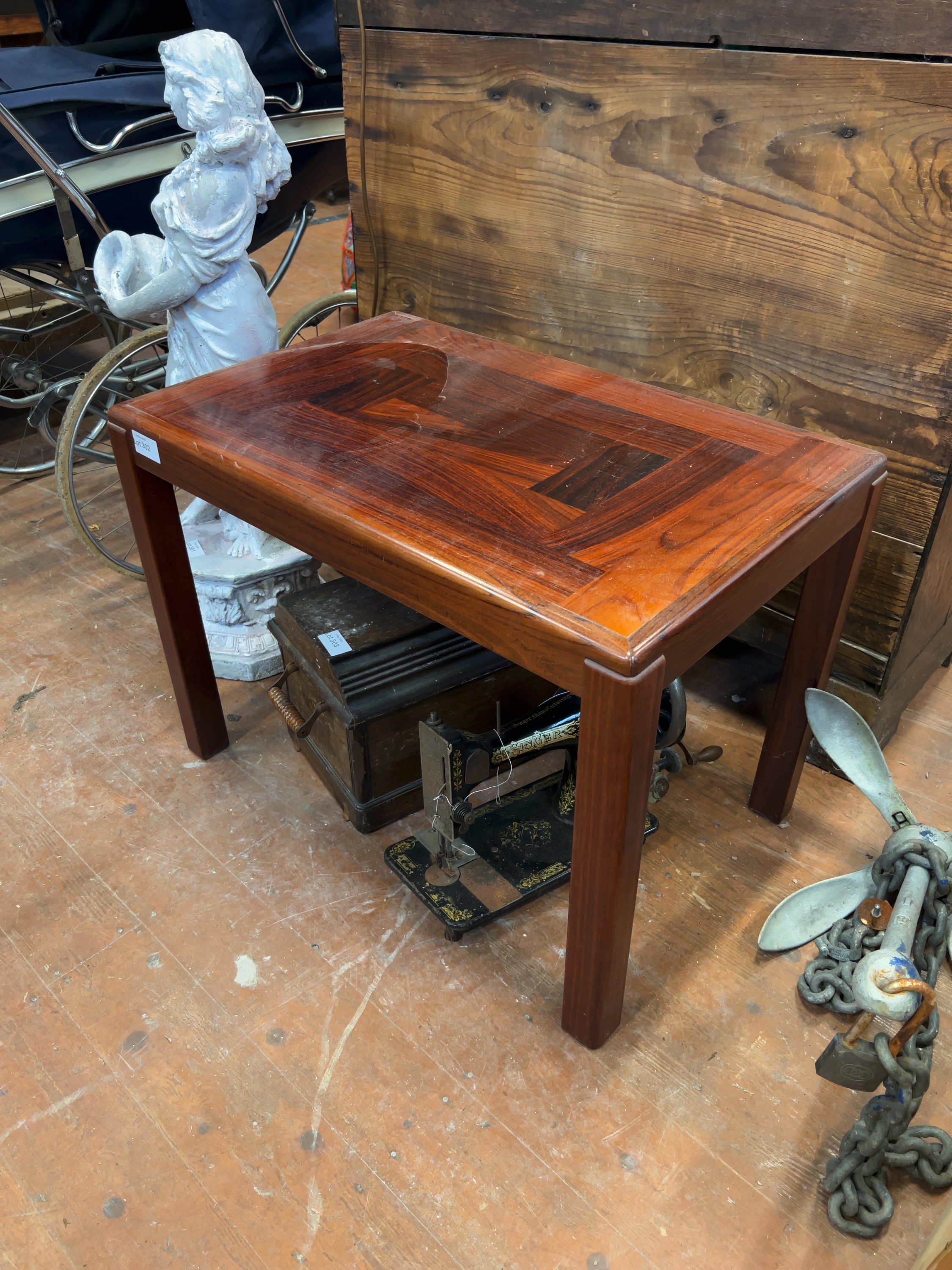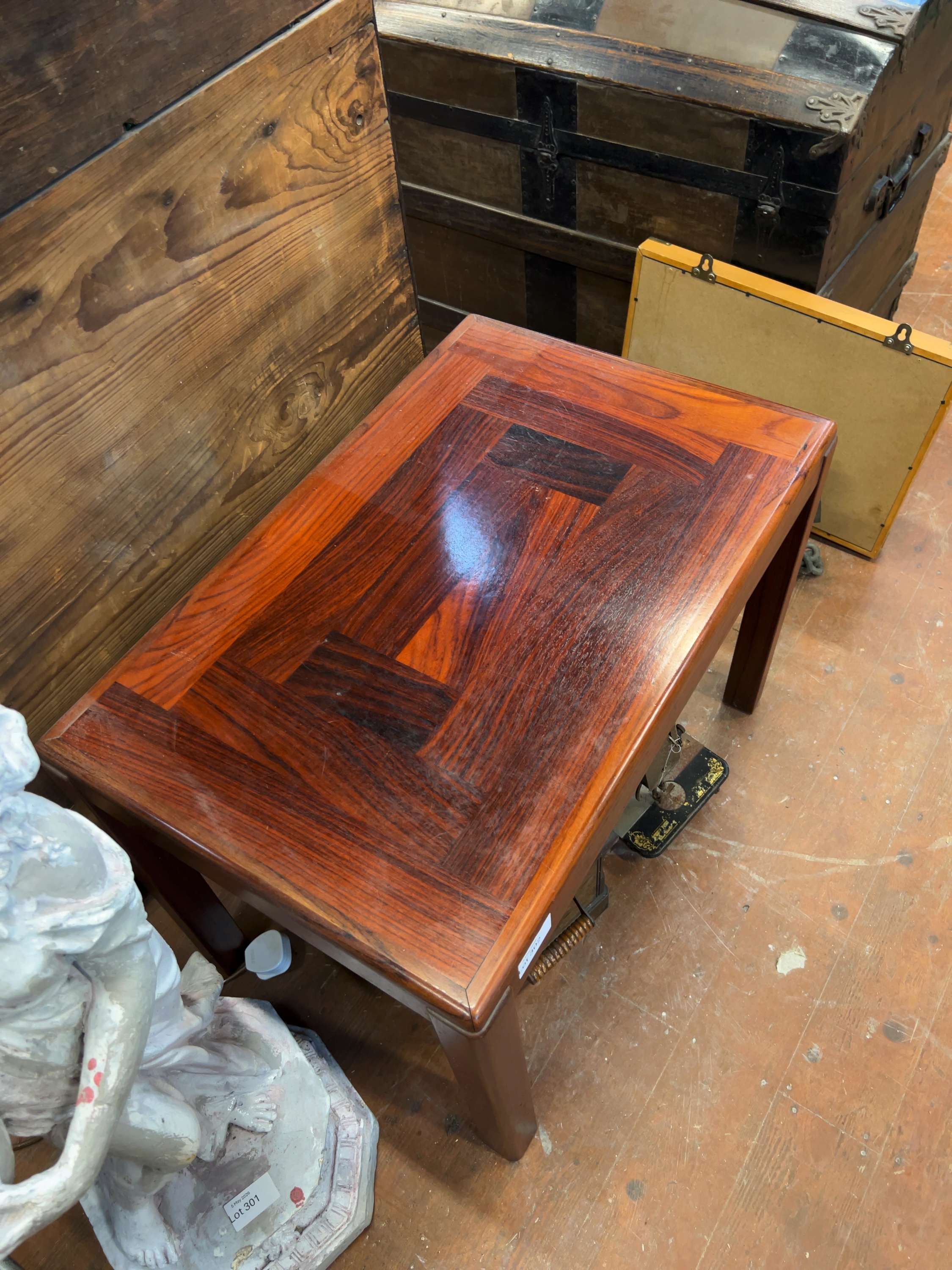 The table is in good structural condition. The rosewood top exhibits a rich colour and grain but shows visible signs of age and use, including several surface scratches, minor scuffs to the edges, and faint circular watermarks. The finish would benefit from polishing.