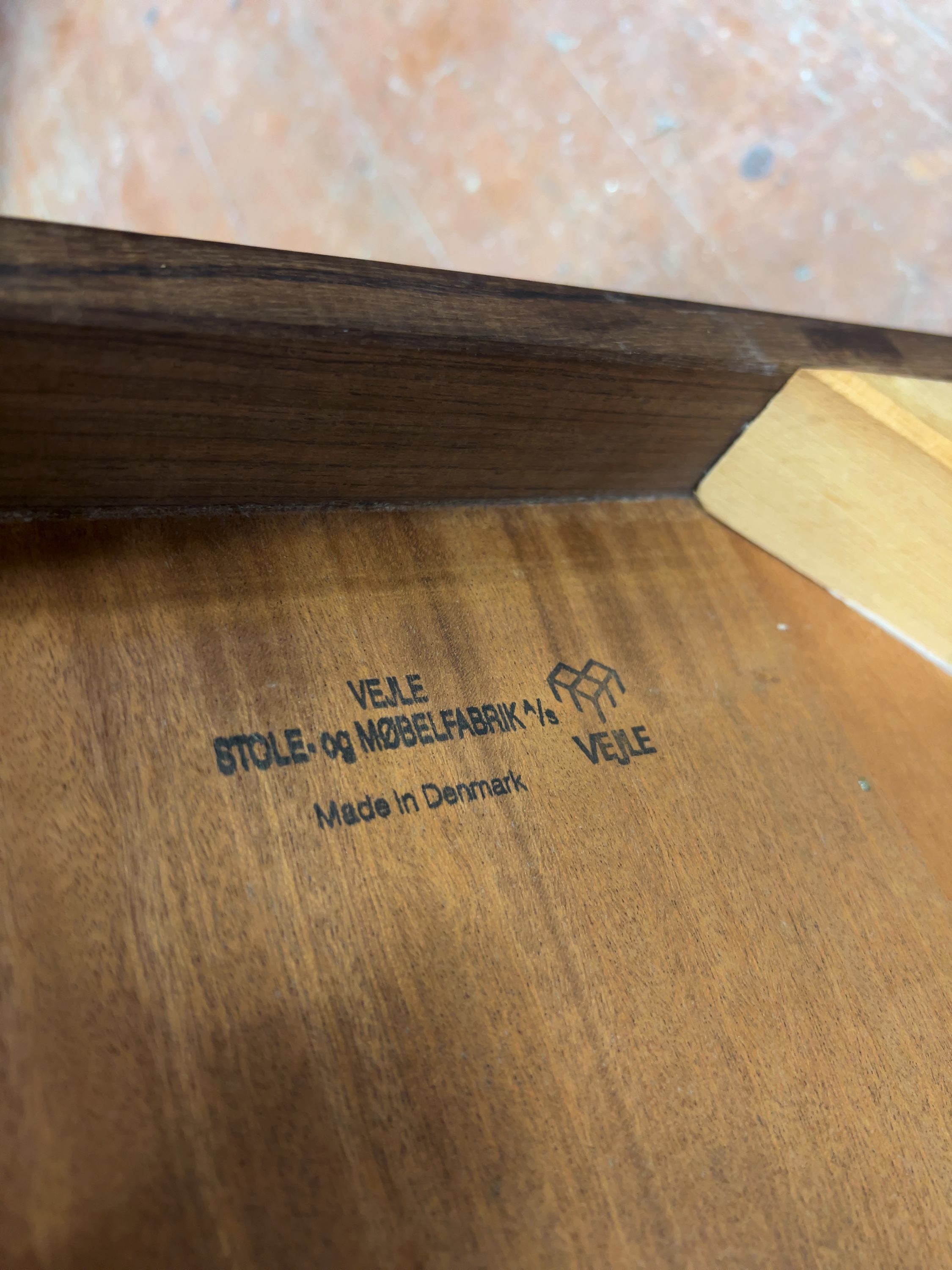 A Danish mid-century modern side table manufactured by Vejle Stole- og Møbelfabrik.The underside of the top bears a printed black mark stating VEJLE STOLE- og MØBELFABRIK A/S Made in Denmark accompanied by a stylized logo of furniture frames.