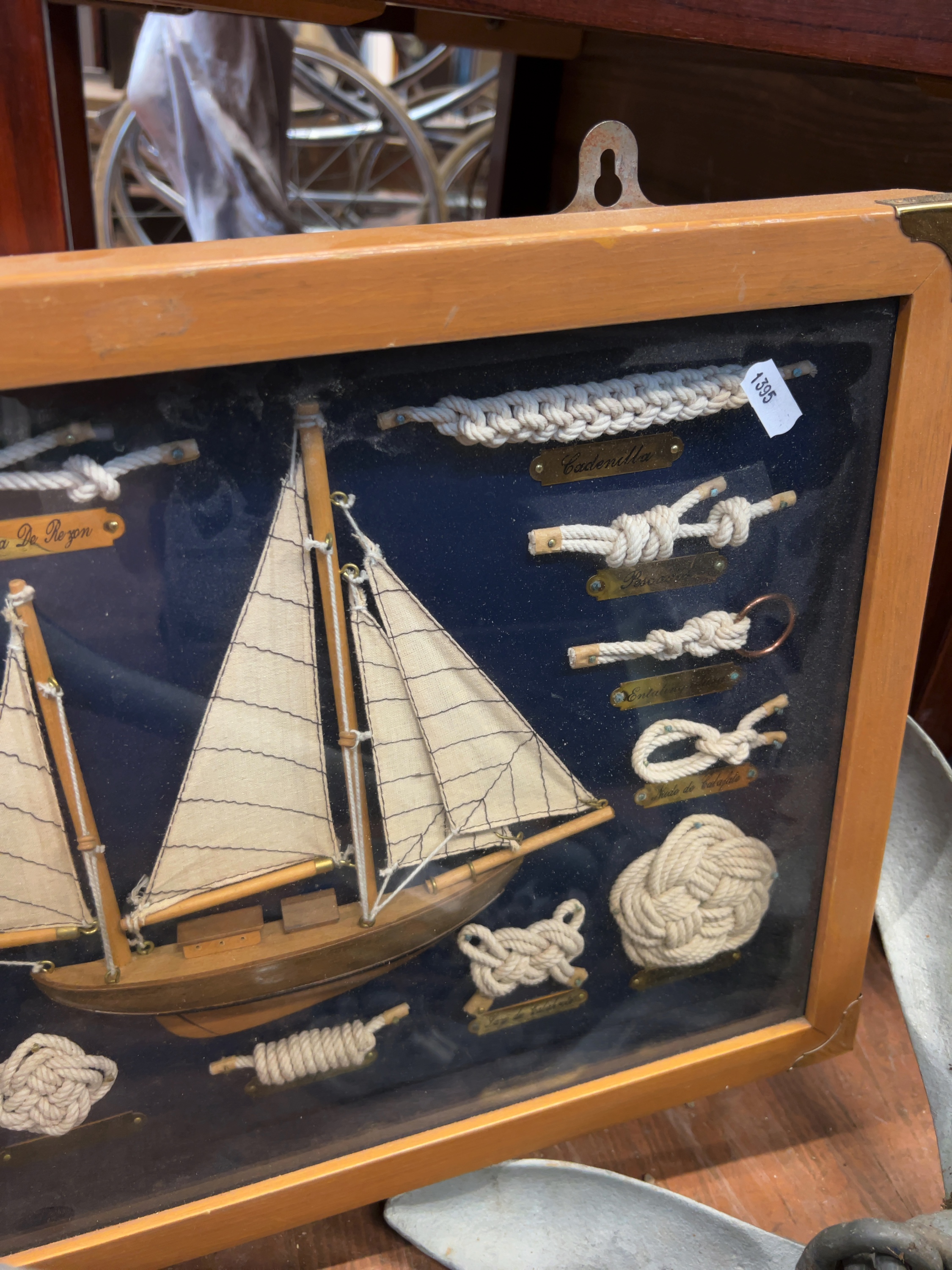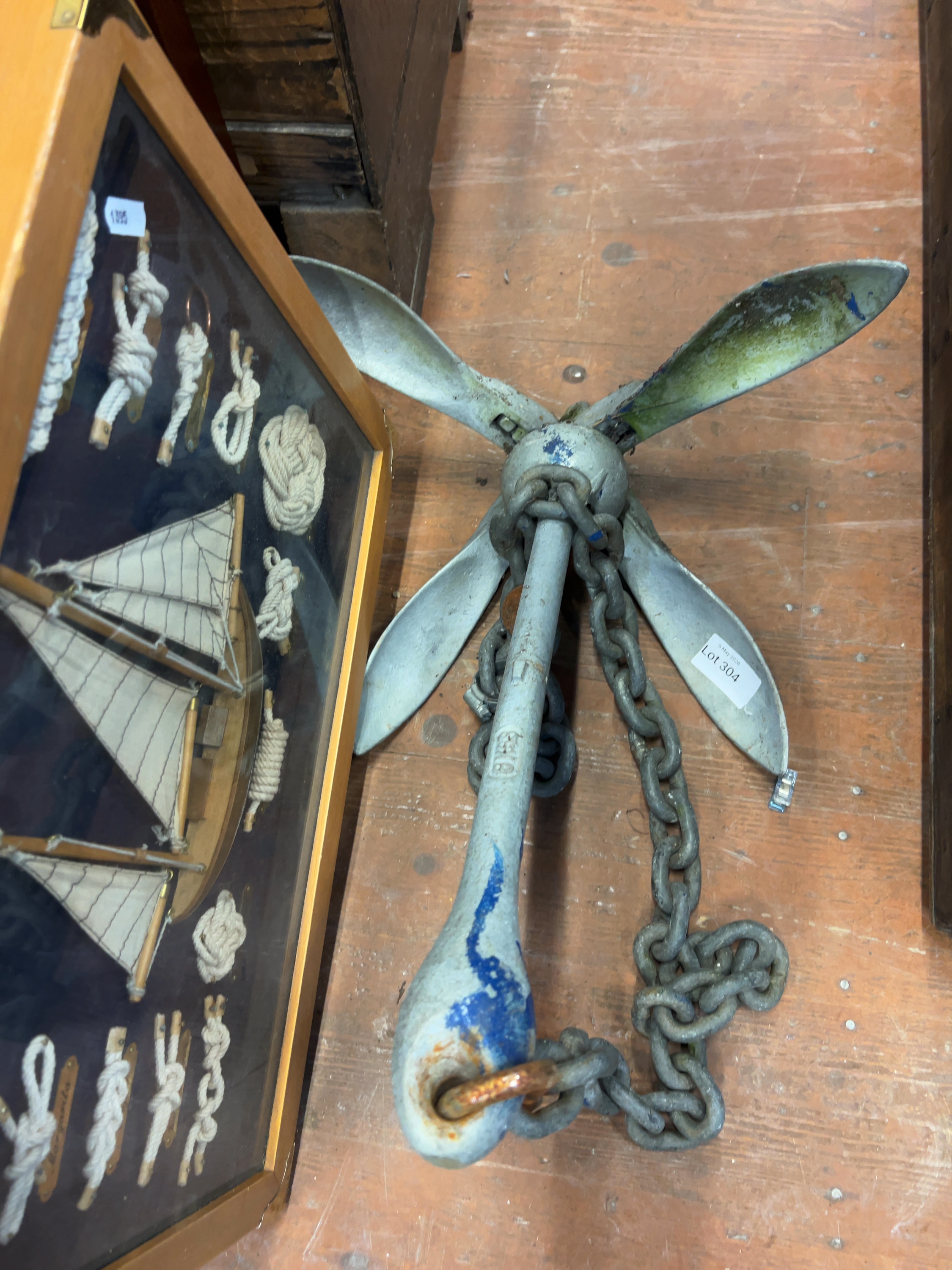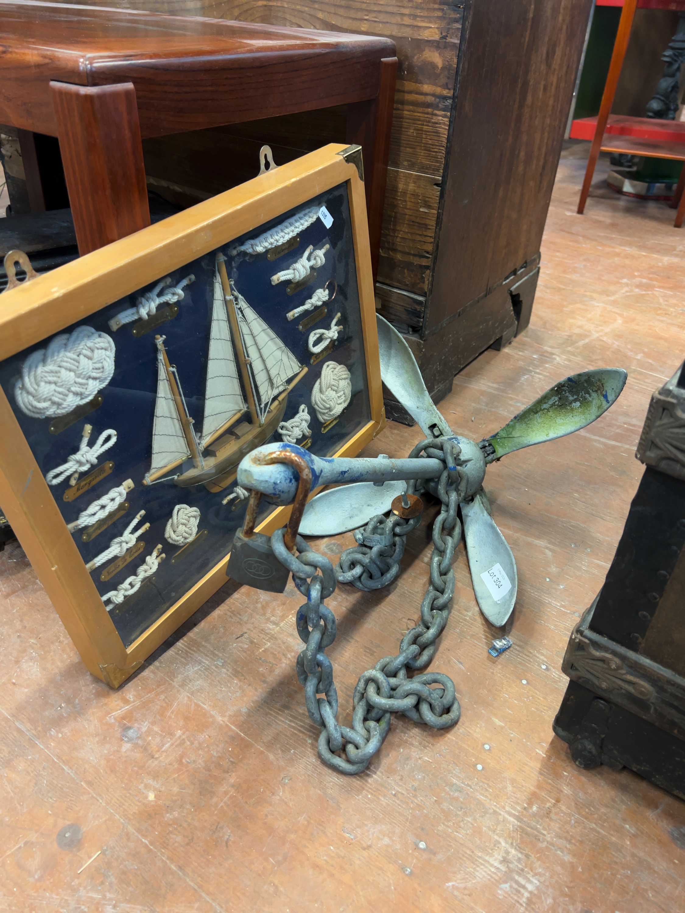 A collection of two nautical-themed items consisting of a decorative shadow box and a folding grapnel anchor.
