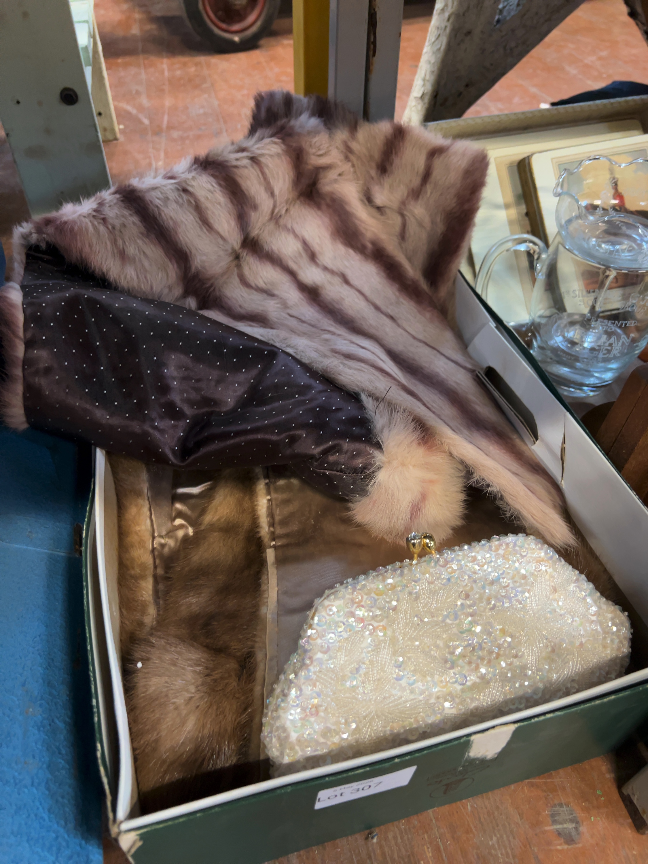 This collection features an assortment of vintage ladies’ evening accessories dating from the mid-20th-century, approximately the 1950s to 1960s. The lot includes two fur stoles and two evening bags. One stole is composed of brown fur, likely mink or a similar short-pile fur, and is finished with a tonal satin lining featuring a woven damask floral pattern. The second stole is crafted from fur, possibly rabbit, displaying horizontal dark brown and grey stripes against a pale cream ground. The interior of this stole is lined with a dark brown fabric decorated with a small white polka-dot pattern.