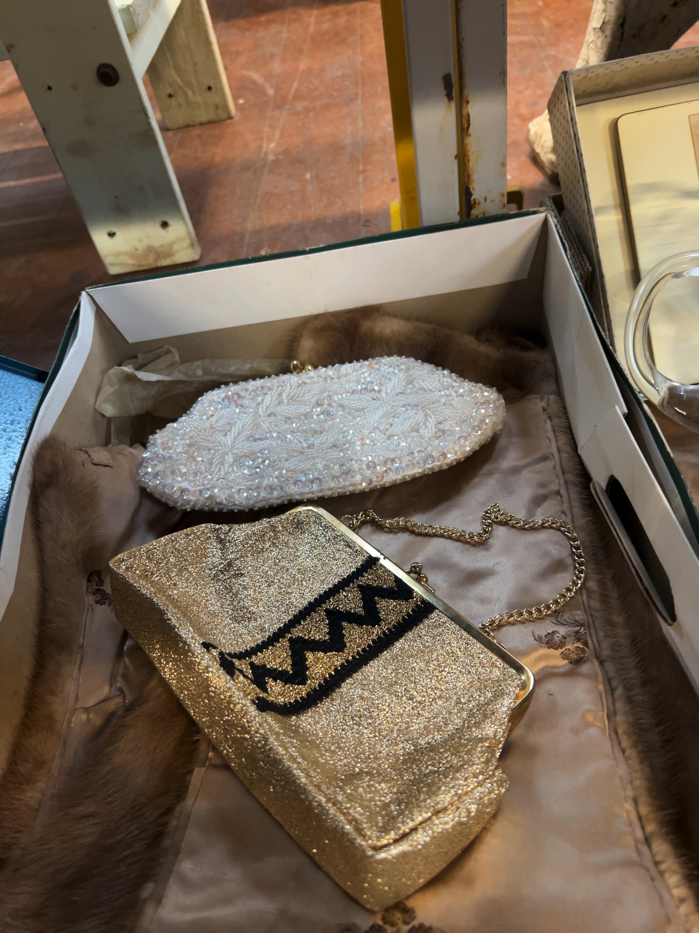 The evening bags consist of a white sequined bag and a gold metallic bag. The white bag is heavily embellished with iridescent white sequins and beads arranged in foliate and scroll motifs. It features a gold-tone metal frame with a kiss-clasp set with two faux pearls or stones. The interior is lined in cream-coloured satin with a small slip pocket and contains a fine metal snake-link chain strap. An internal label is partially visible with the text MADE IN. The second bag is constructed from gold-tone metallic fabric with a contrasting black woven zigzag band. It includes a gold-tone metal frame and a fine metal link chain strap. The items are housed in a green cardboard box marked Lot 307.