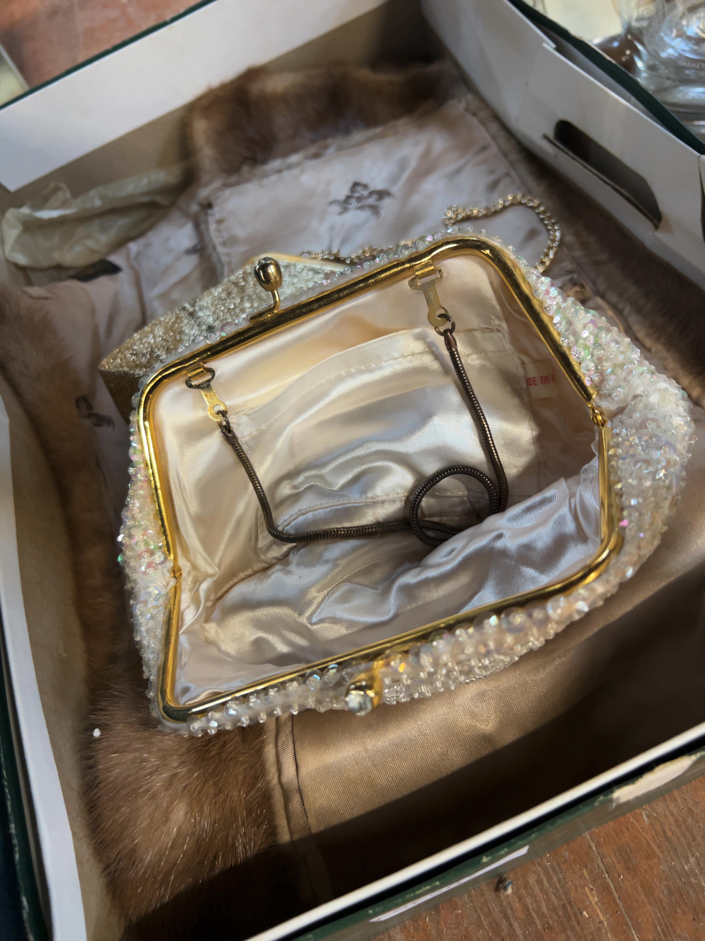 The items appear to be in good vintage condition. The fur stoles show no obvious signs of shedding or significant wear to the pelts. The bag linings appear clean, and the beadwork on the white bag is largely intact. Prospective buyers are advised to expect minor age-related wear common to vintage textiles and accessories.