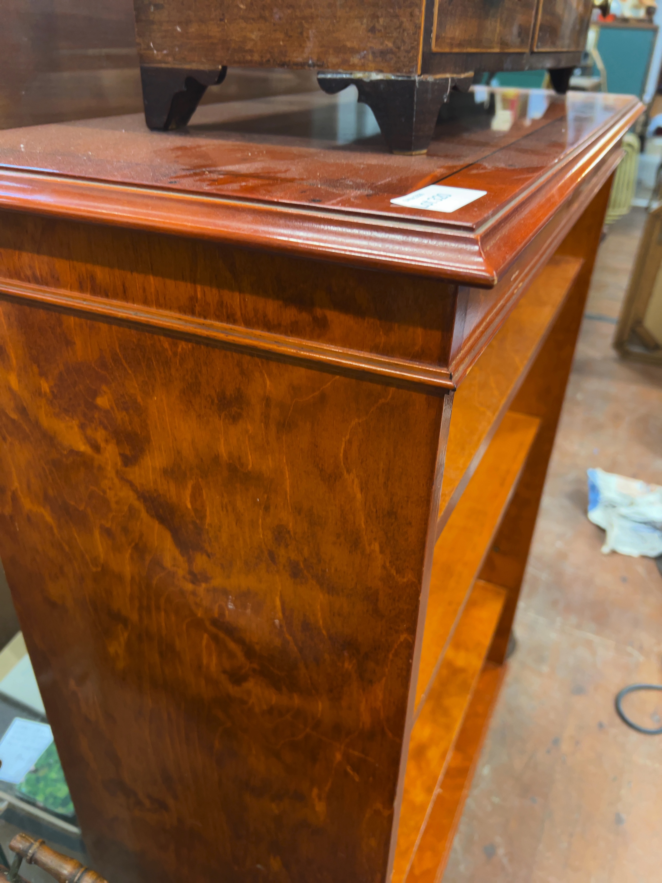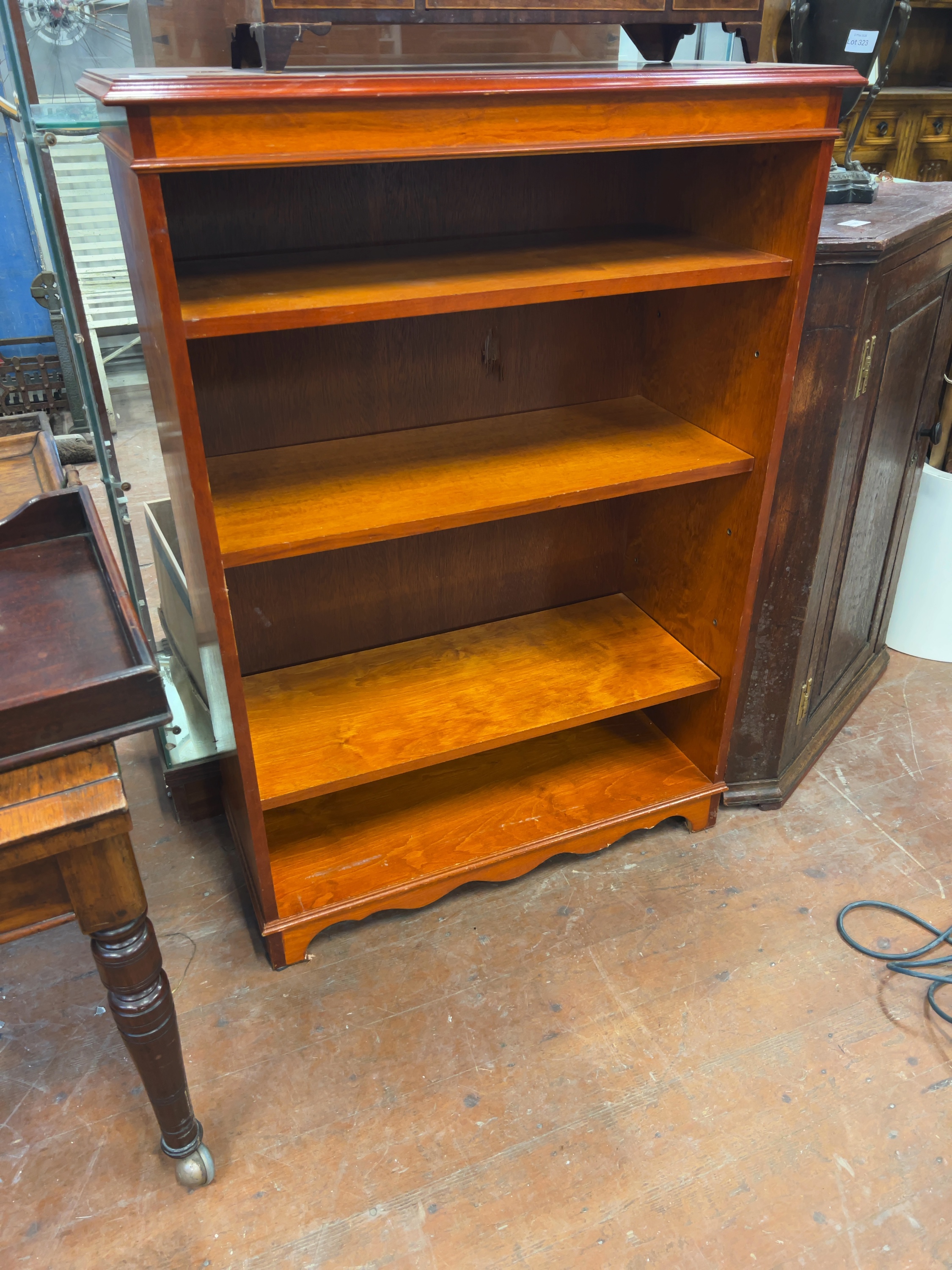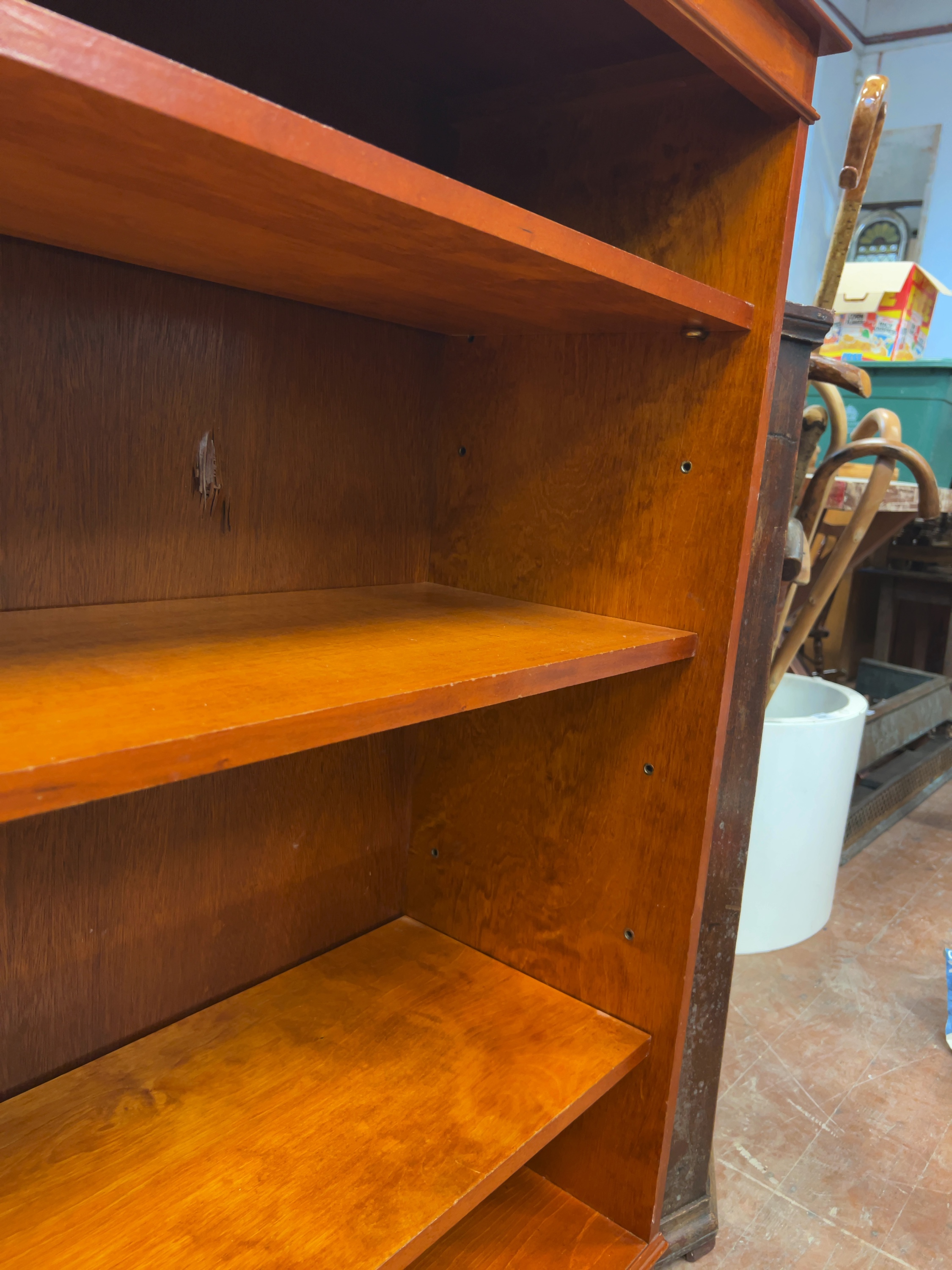 The item shows general signs of use and surface wear consistent with age. There is a notable vertical scratch or gouge to the interior back panel, located behind the second shelf from the top. A small white adhesive label is present on the top right side of the cornice.