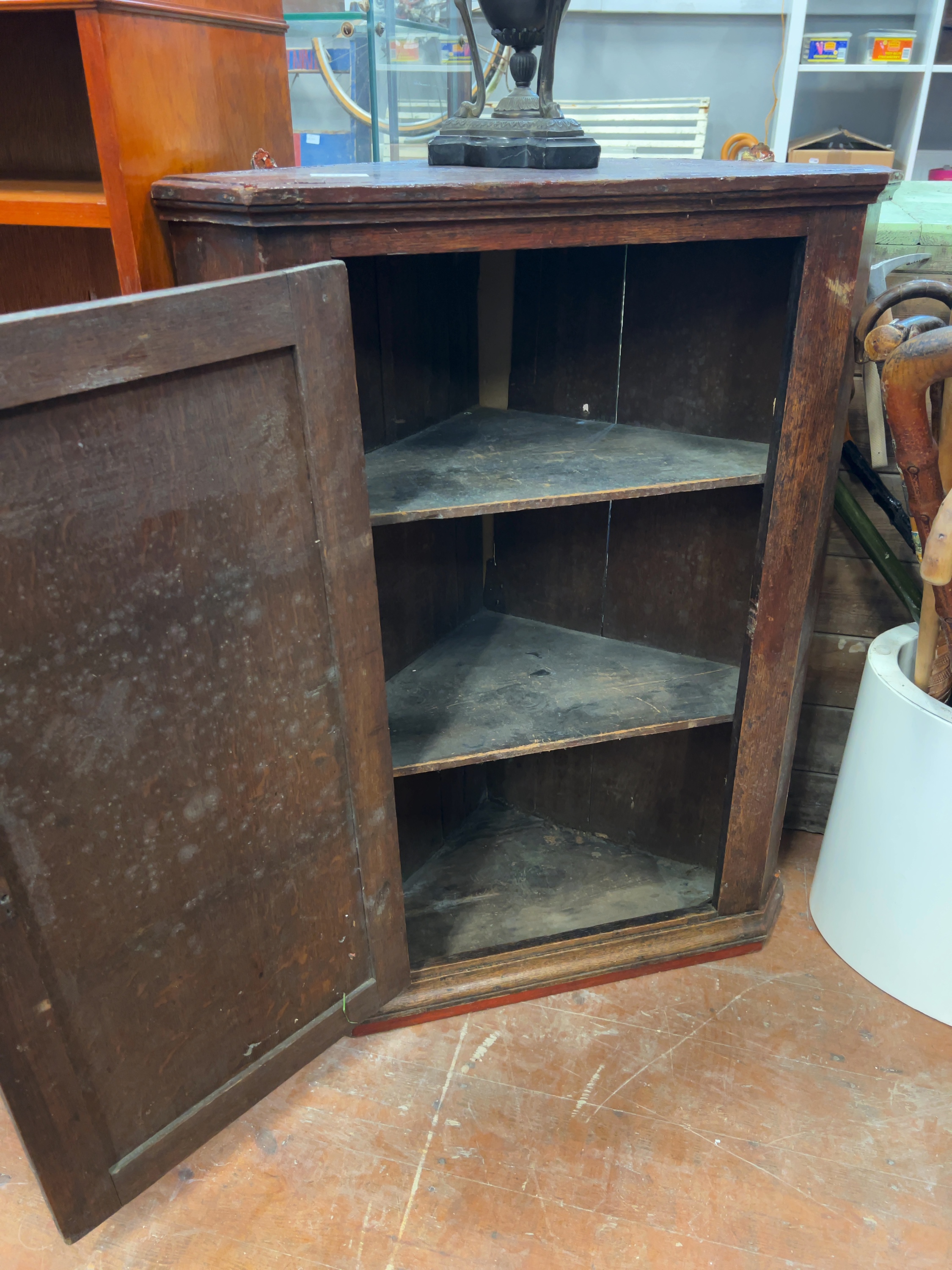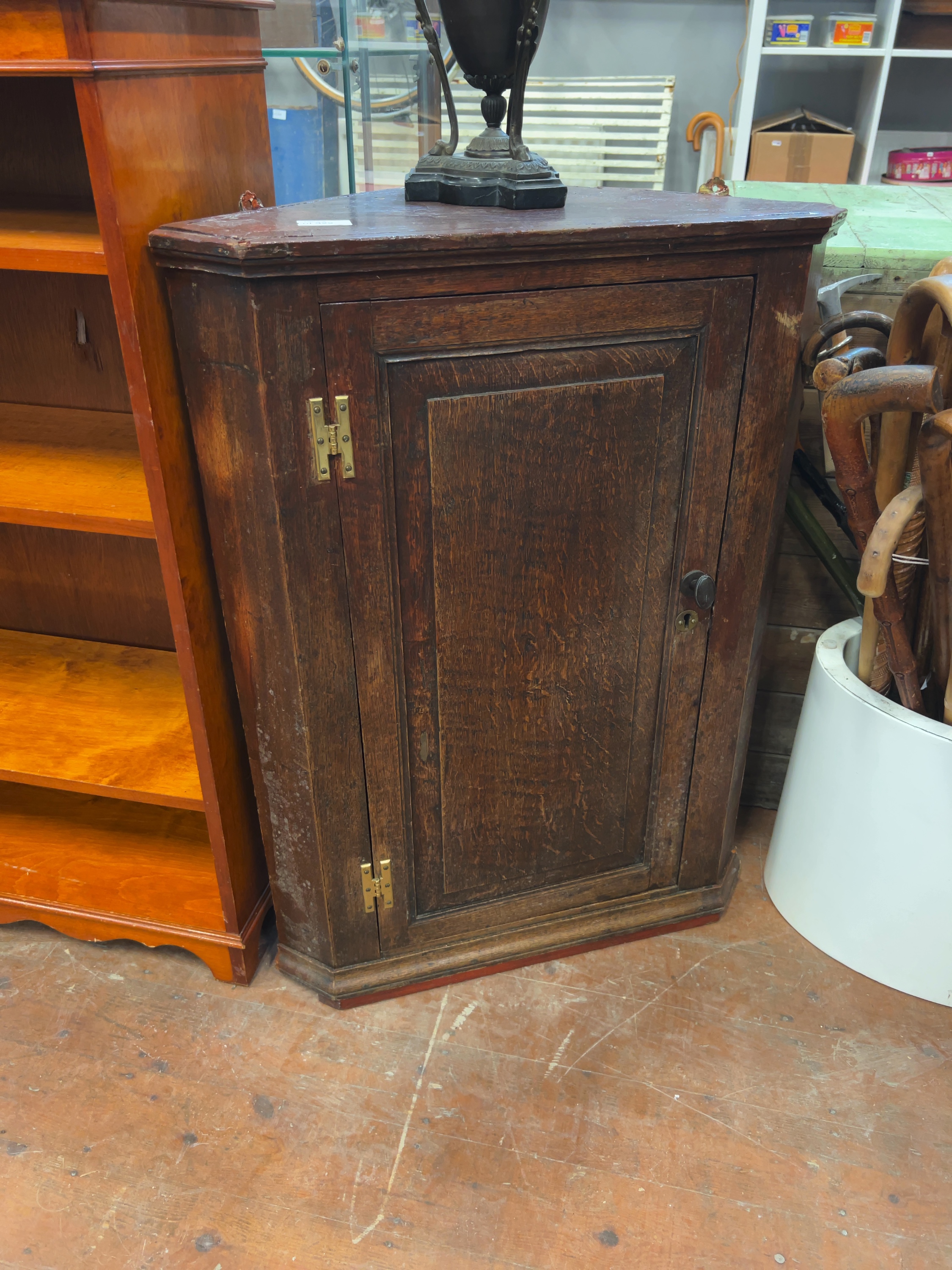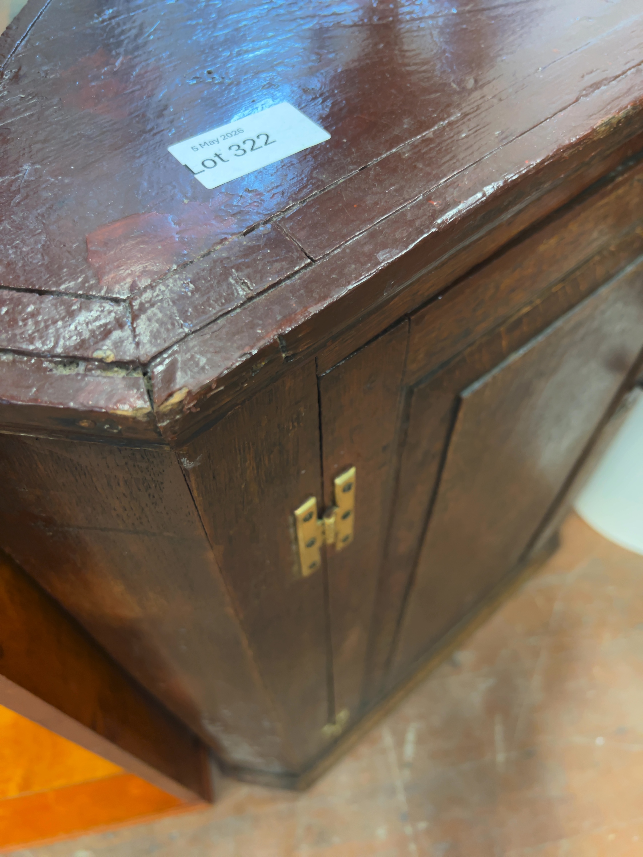 A late 18th or early 19th-century provincial English floor-standing corner cupboard, constructed from solid oak with a dark-stained finish.