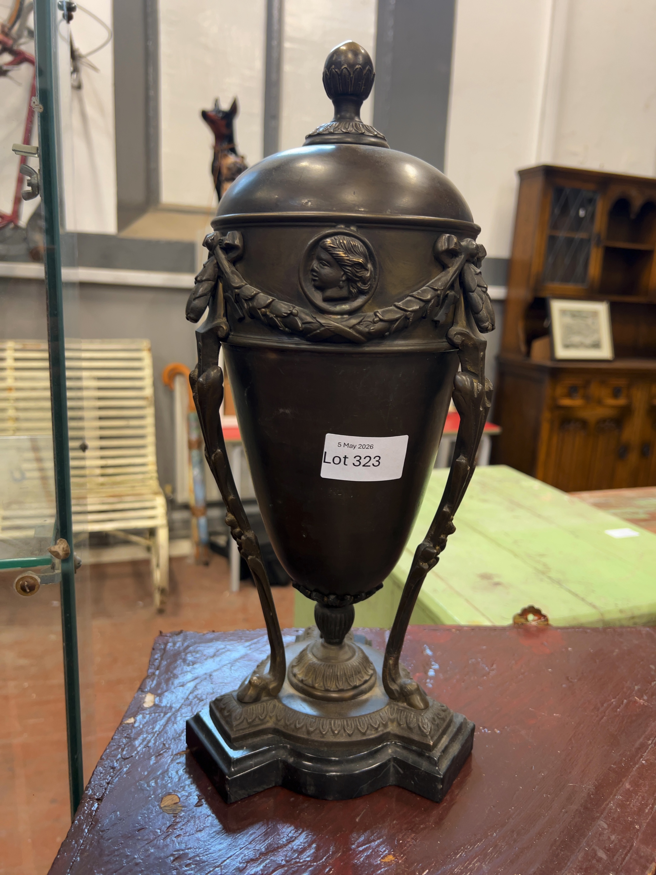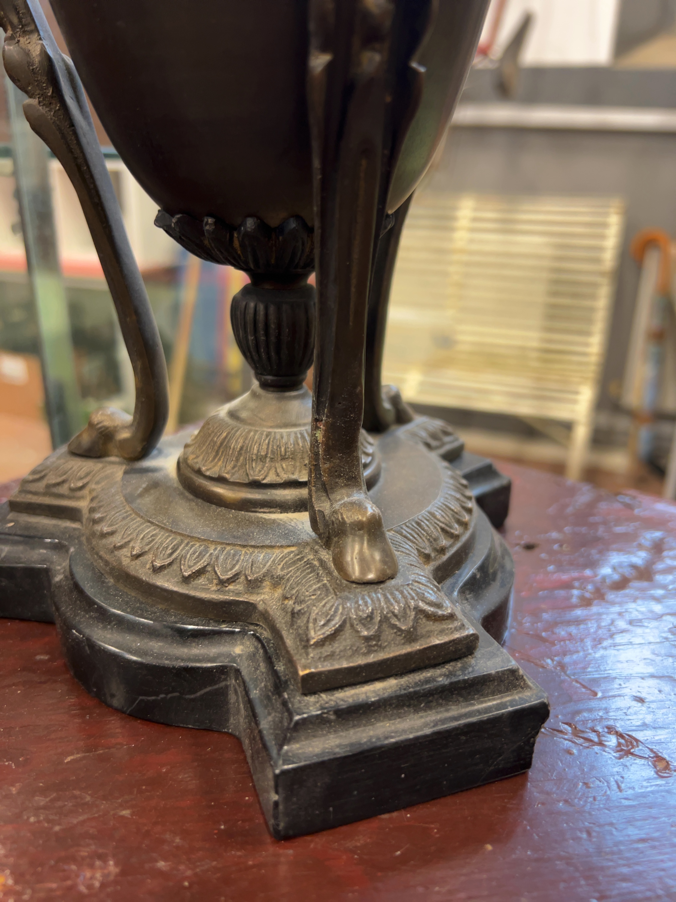 The urn retains a deep, dark brown patina with some light rubbing to the high points of the casting. The black stone base shows several minor chips and nibbles to the sharp edges and corners, consistent with age and use. There is a small area of light green verdigris oxidation visible at the joint where one tripod leg meets the socle. The item would benefit from light cleaning to remove surface dust.
