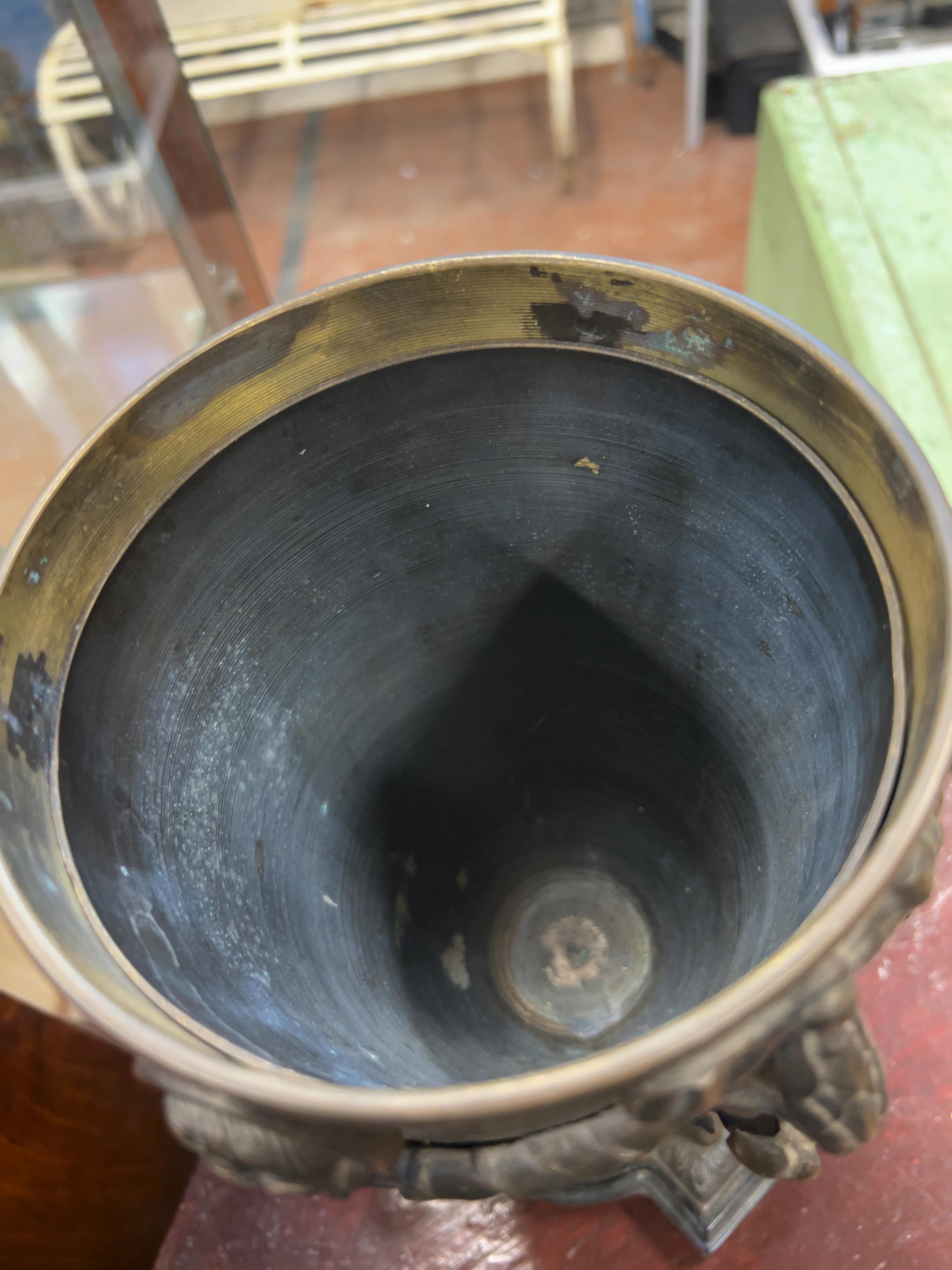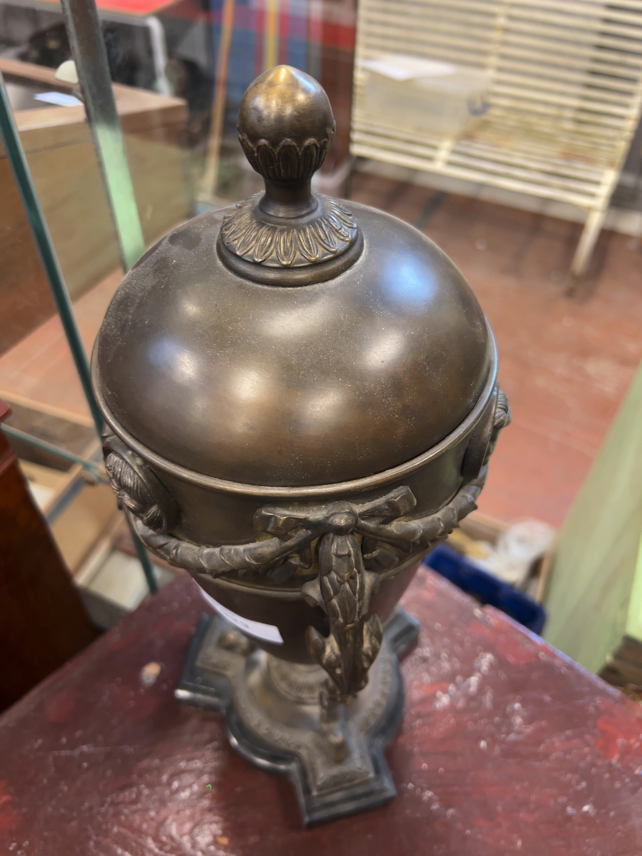A Neoclassical style covered urn crafted from a dark-patinated copper alloy, likely bronze. No manufacturer marks, foundry stamps, or signatures are visible on the exterior or interior surfaces.