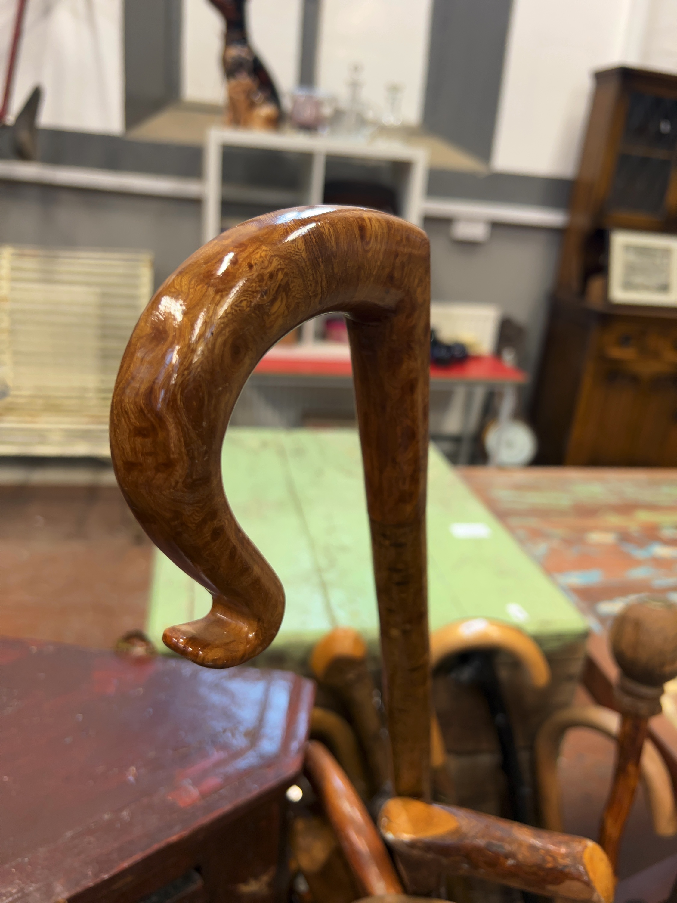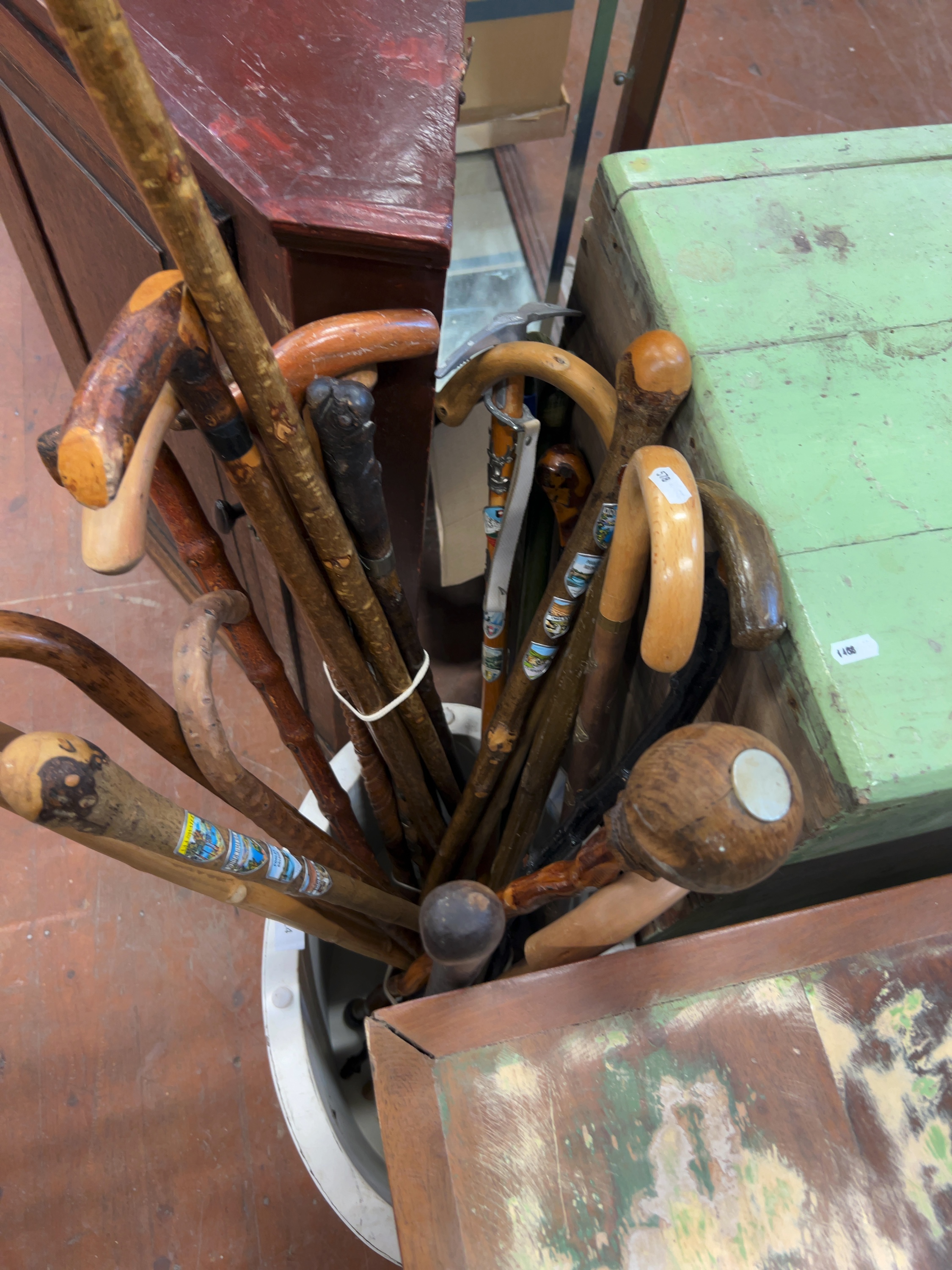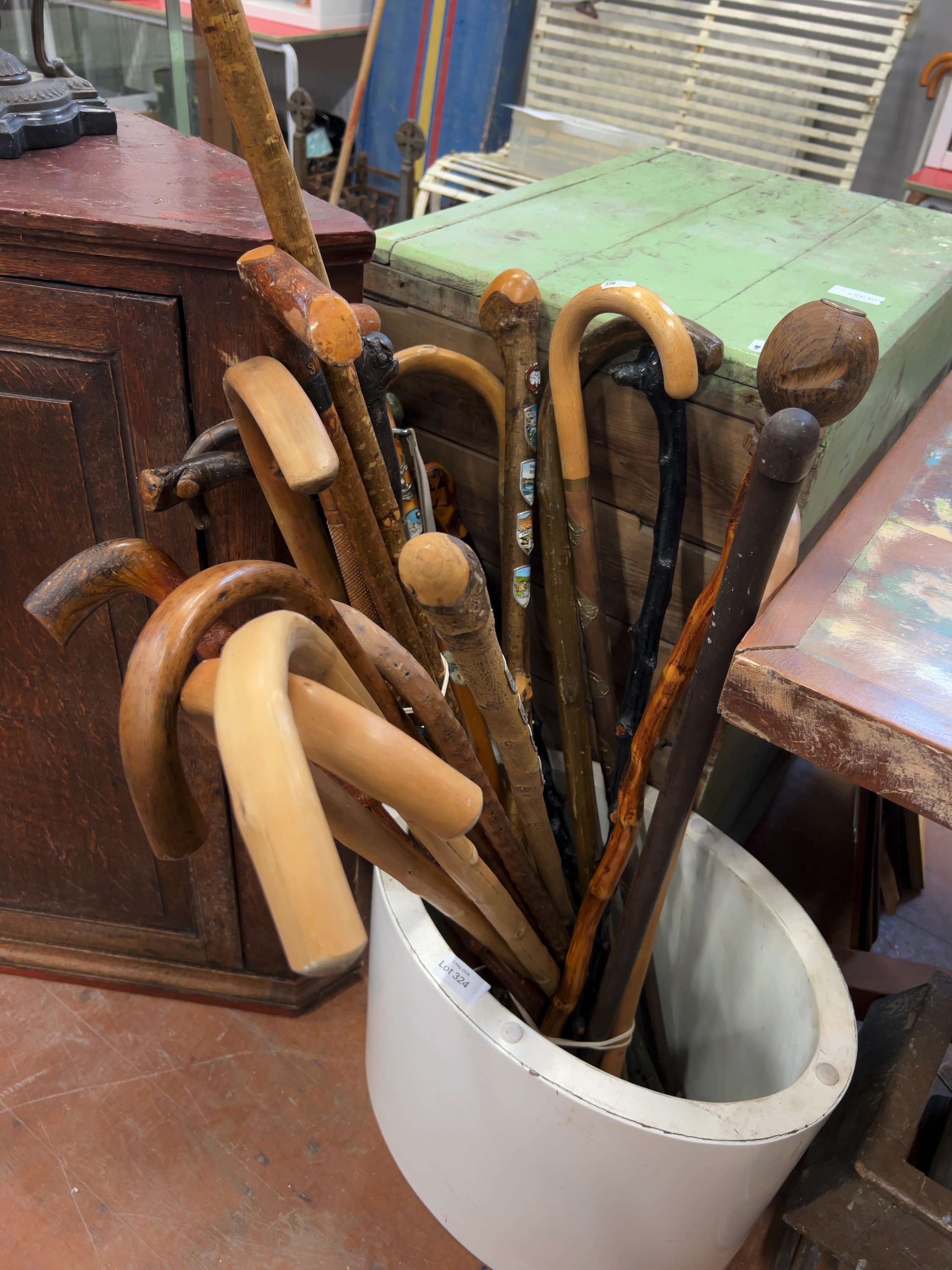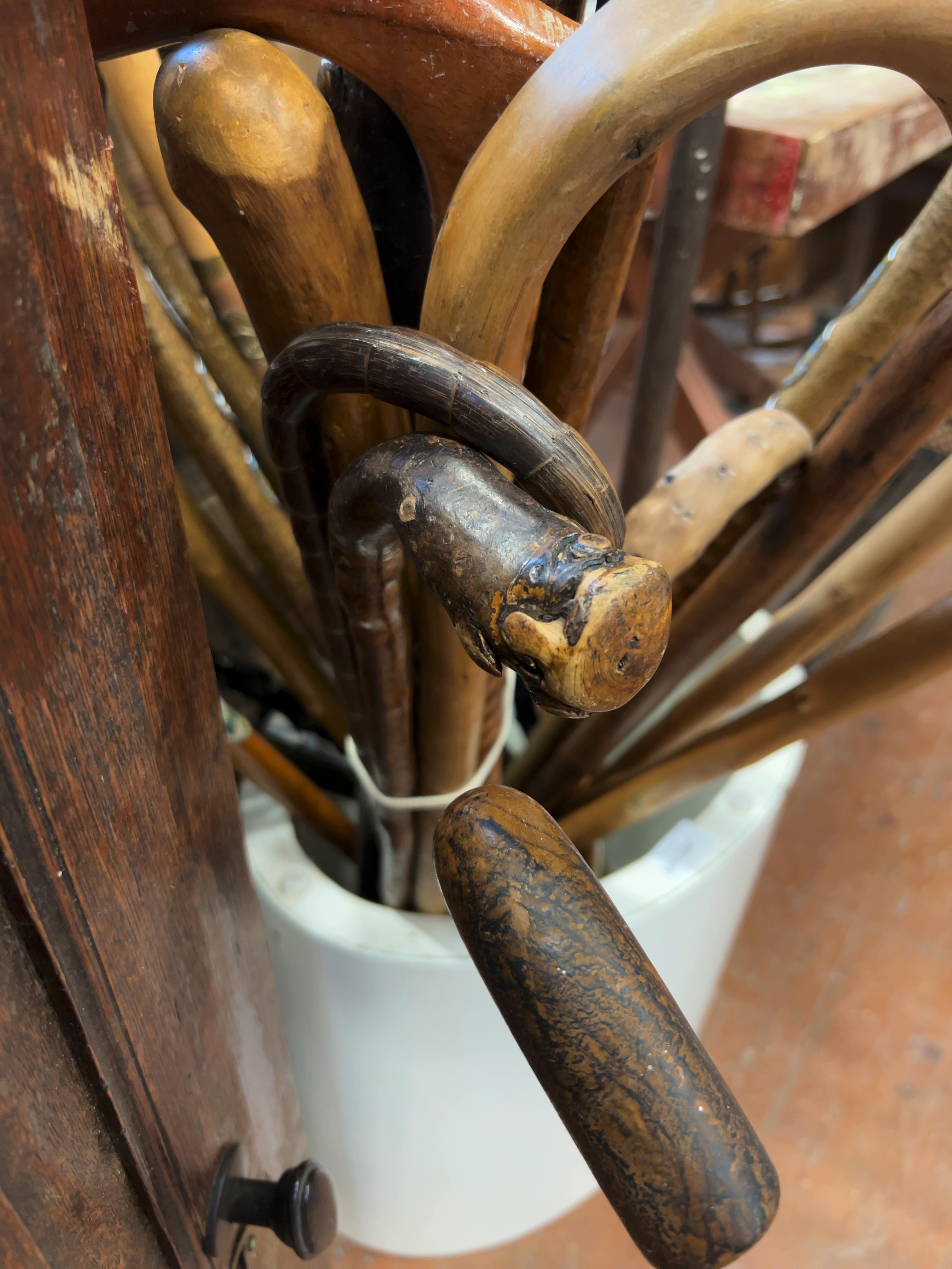 An assortment of walking sticks and canes of various styles, accompanied by a white cylindrical stand. No maker’s marks or precious metal hallmarks are present.