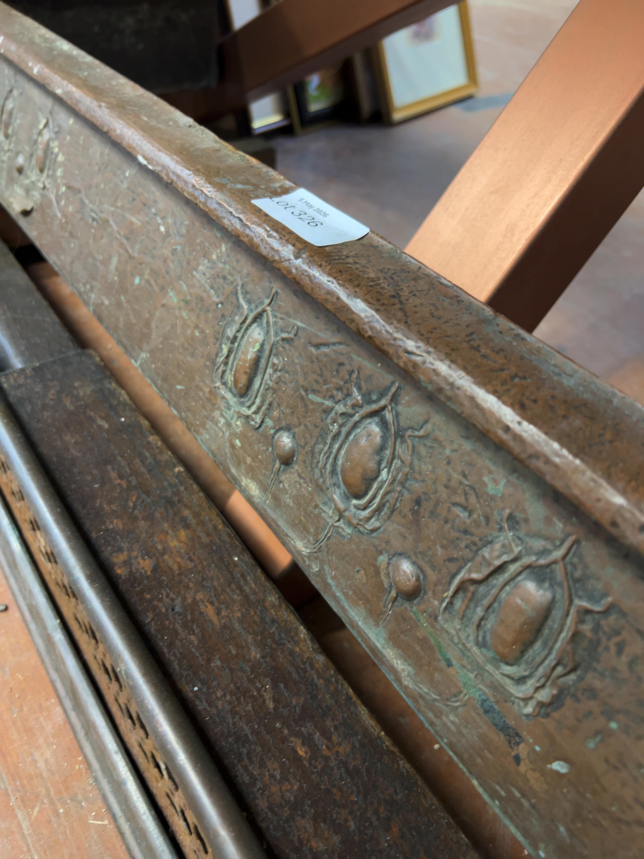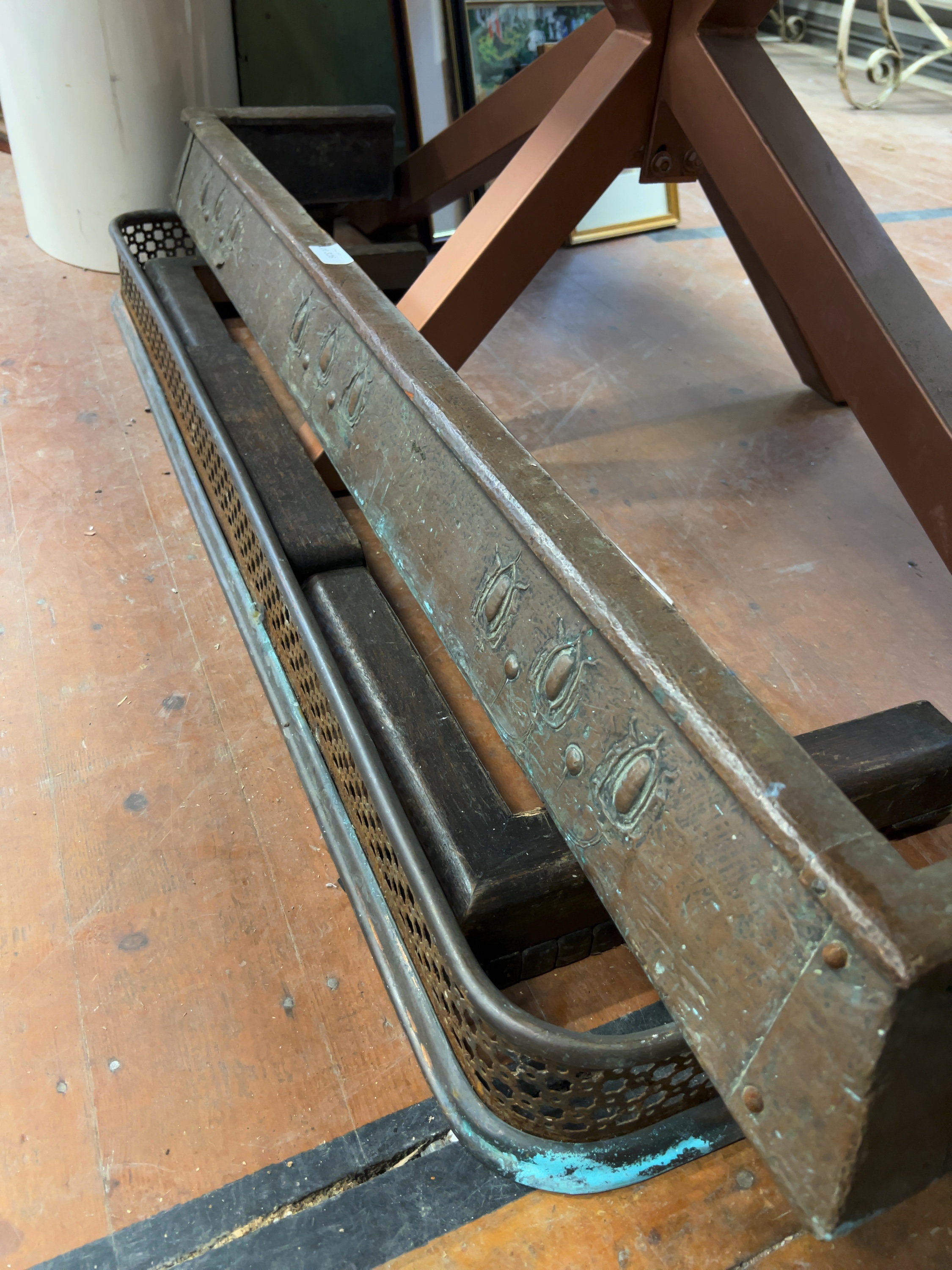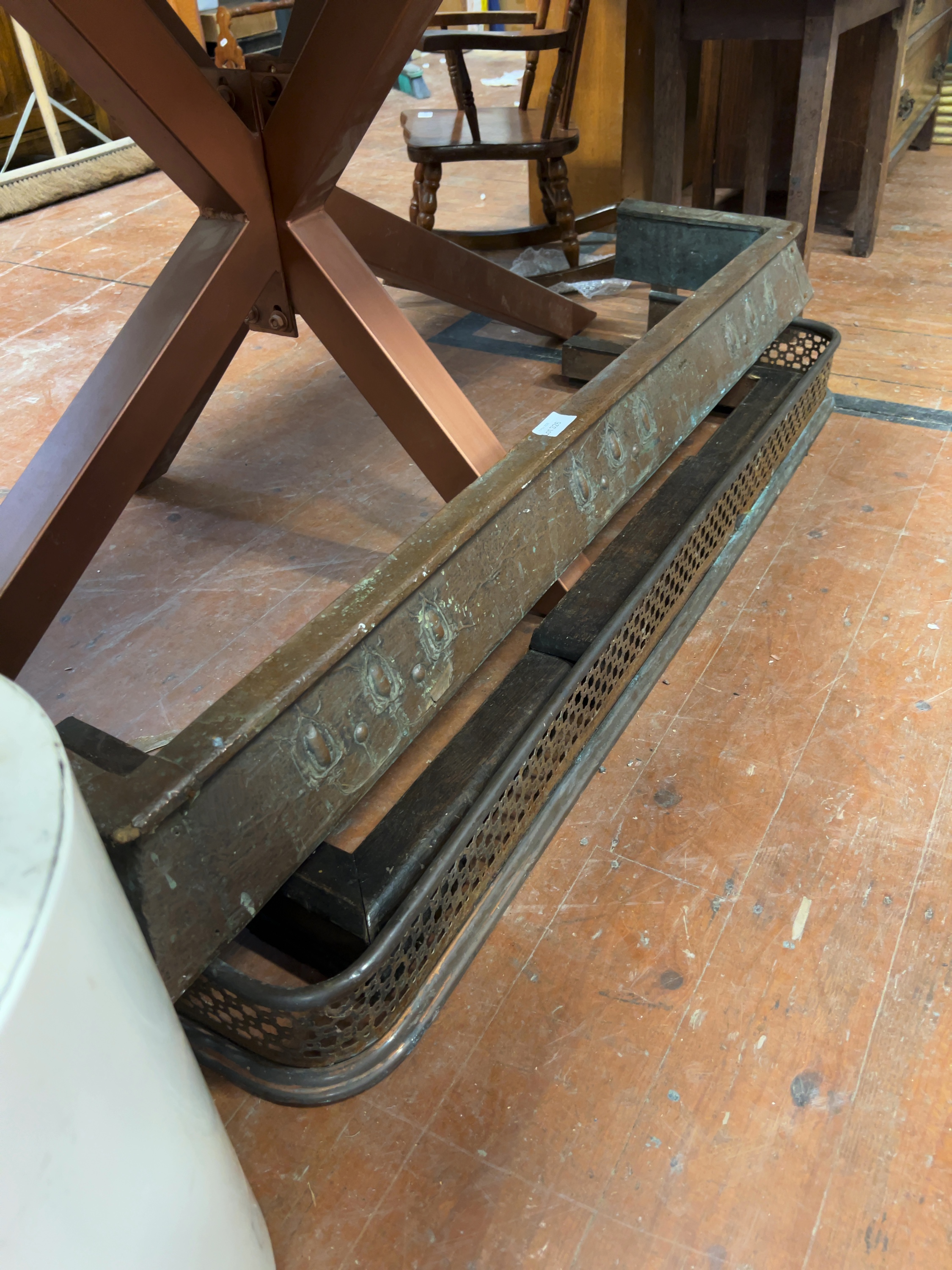 This lot comprises two metal fireplace fenders of varying styles, representative of late 19th and early 20th-century British domestic design. The first is an Arts and Crafts movement copper fender of rectangular, sloped form.The second fender is a low-profile pierced gallery type. No maker’s marks are present on either piece.