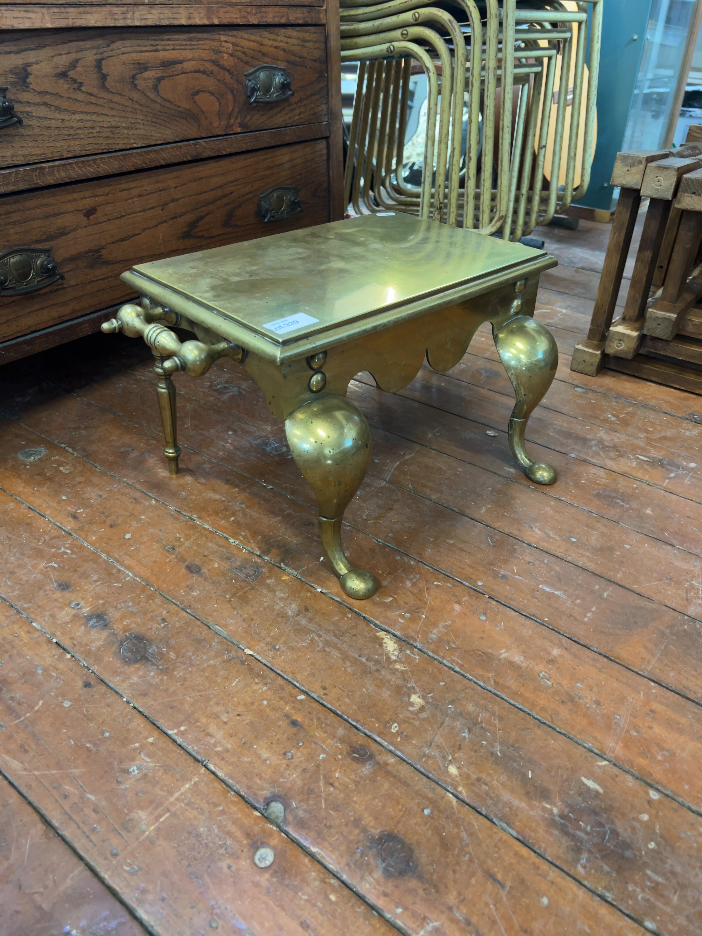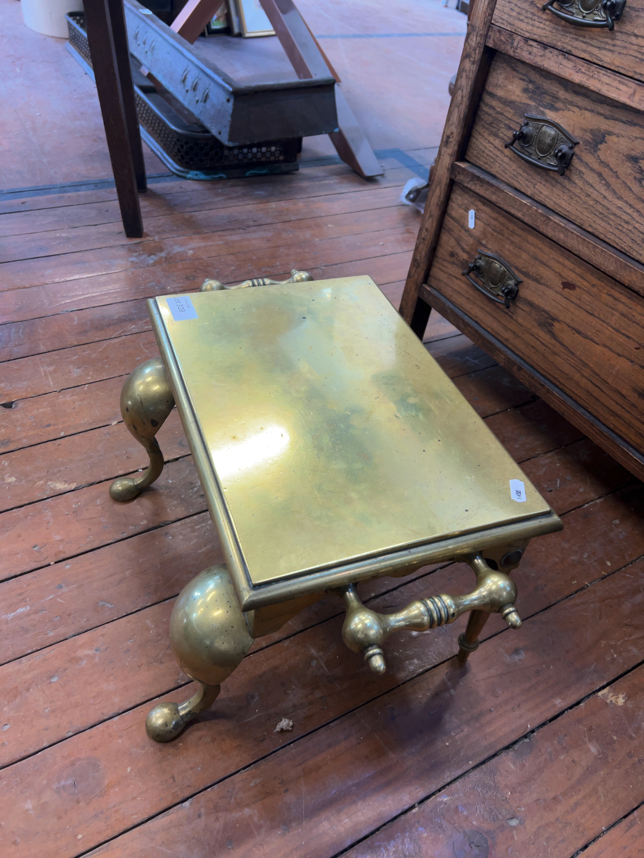 An antique brass hearth footman of Queen Anne style, traditionally used as a fireplace plate warmer.