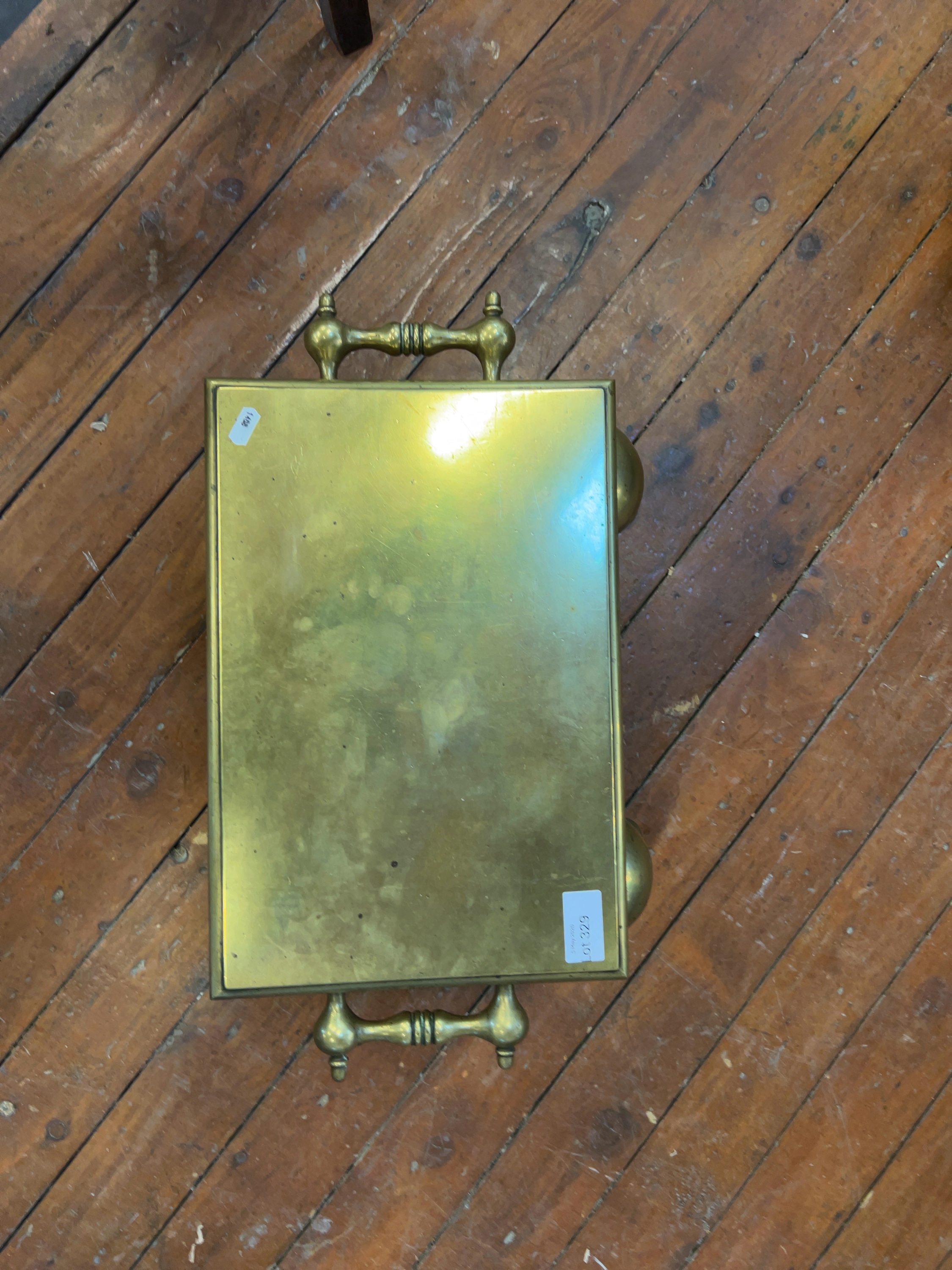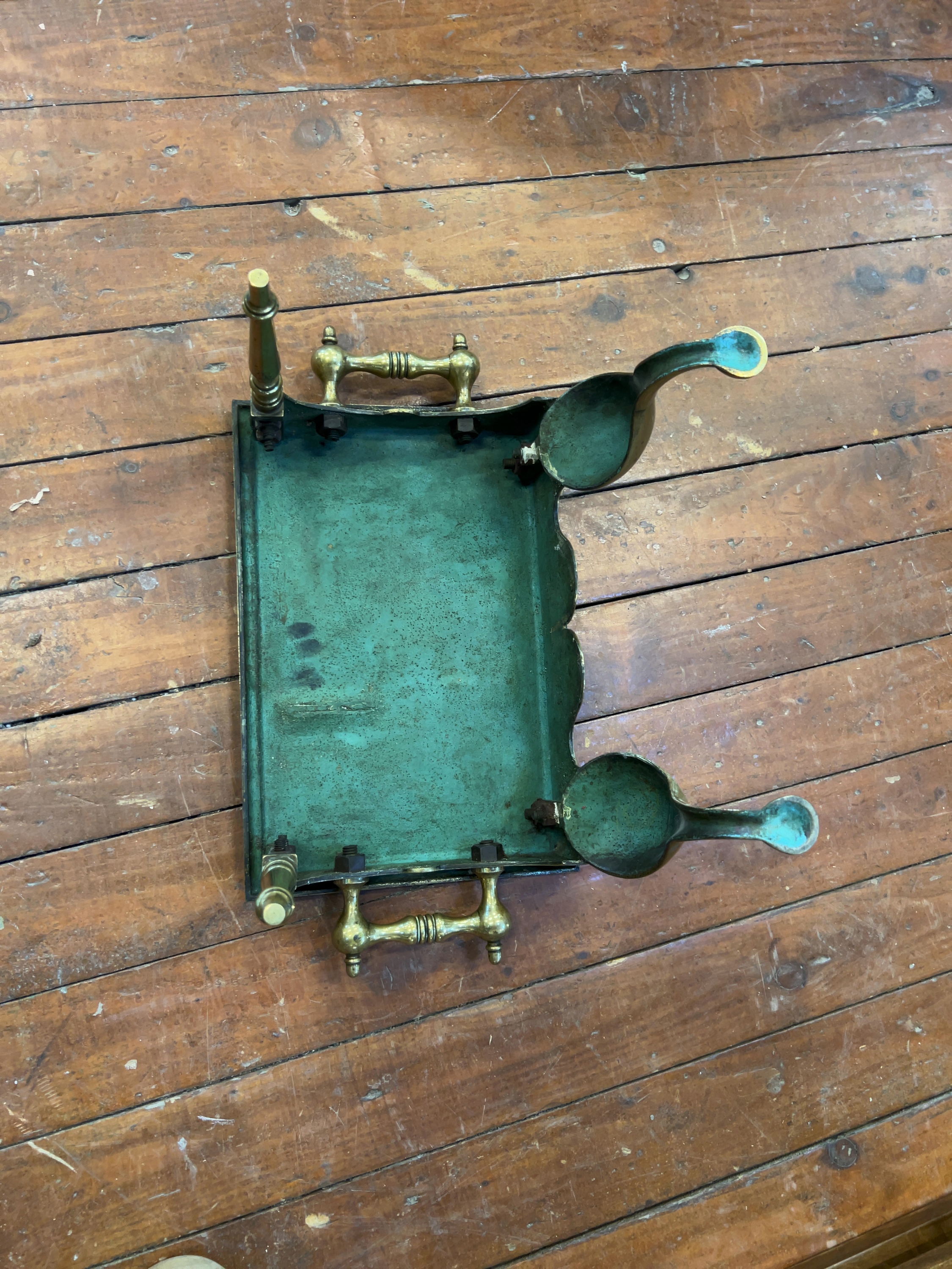 The footman is in good antique condition, exhibiting an aged patina with general surface wear including scratches, scuffs, and tarnished areas consistent with age and domestic use. The underside shows significant oxidation and green verdigris. One rear leg is slightly tilted but remains structurally attached.