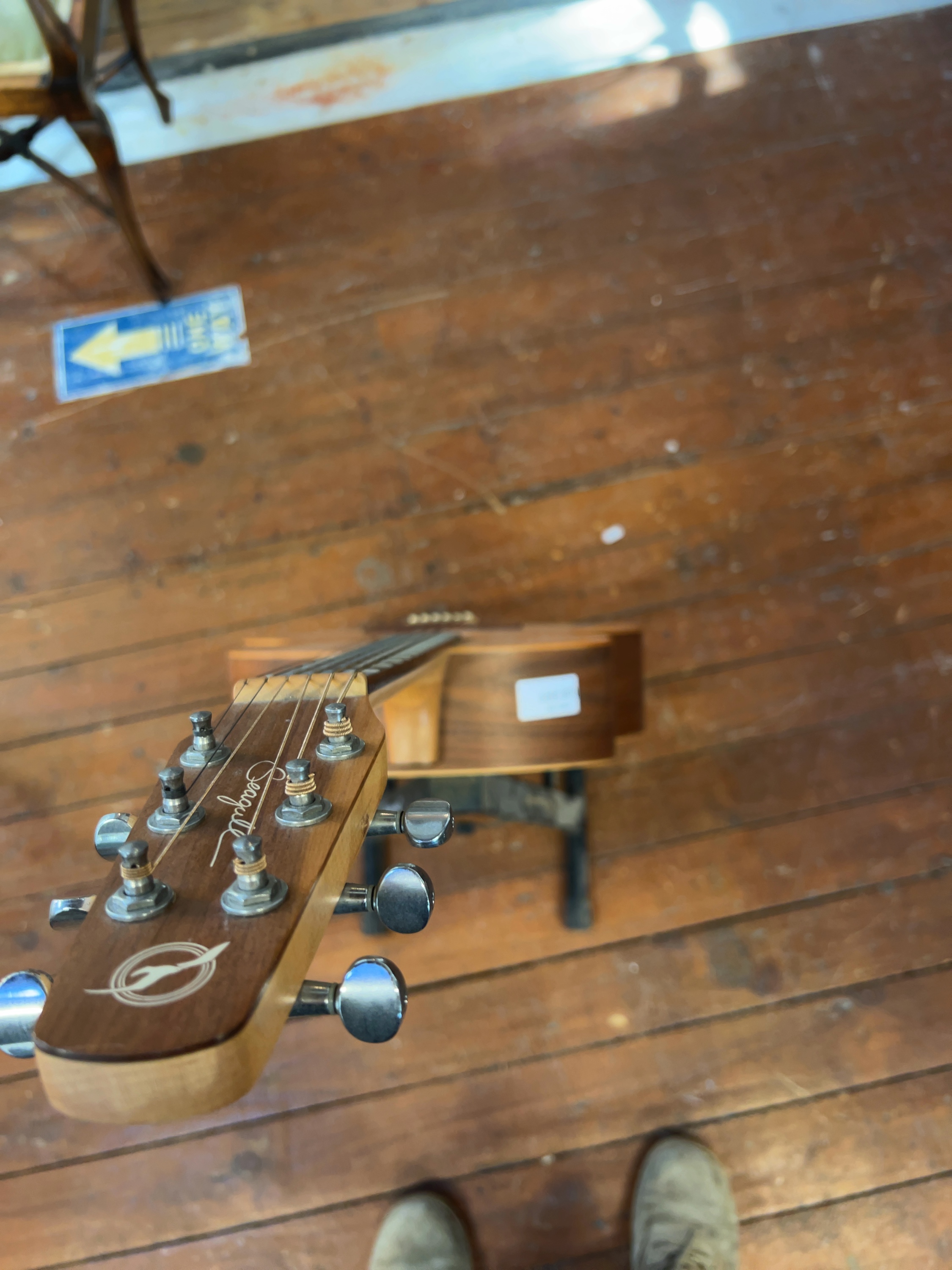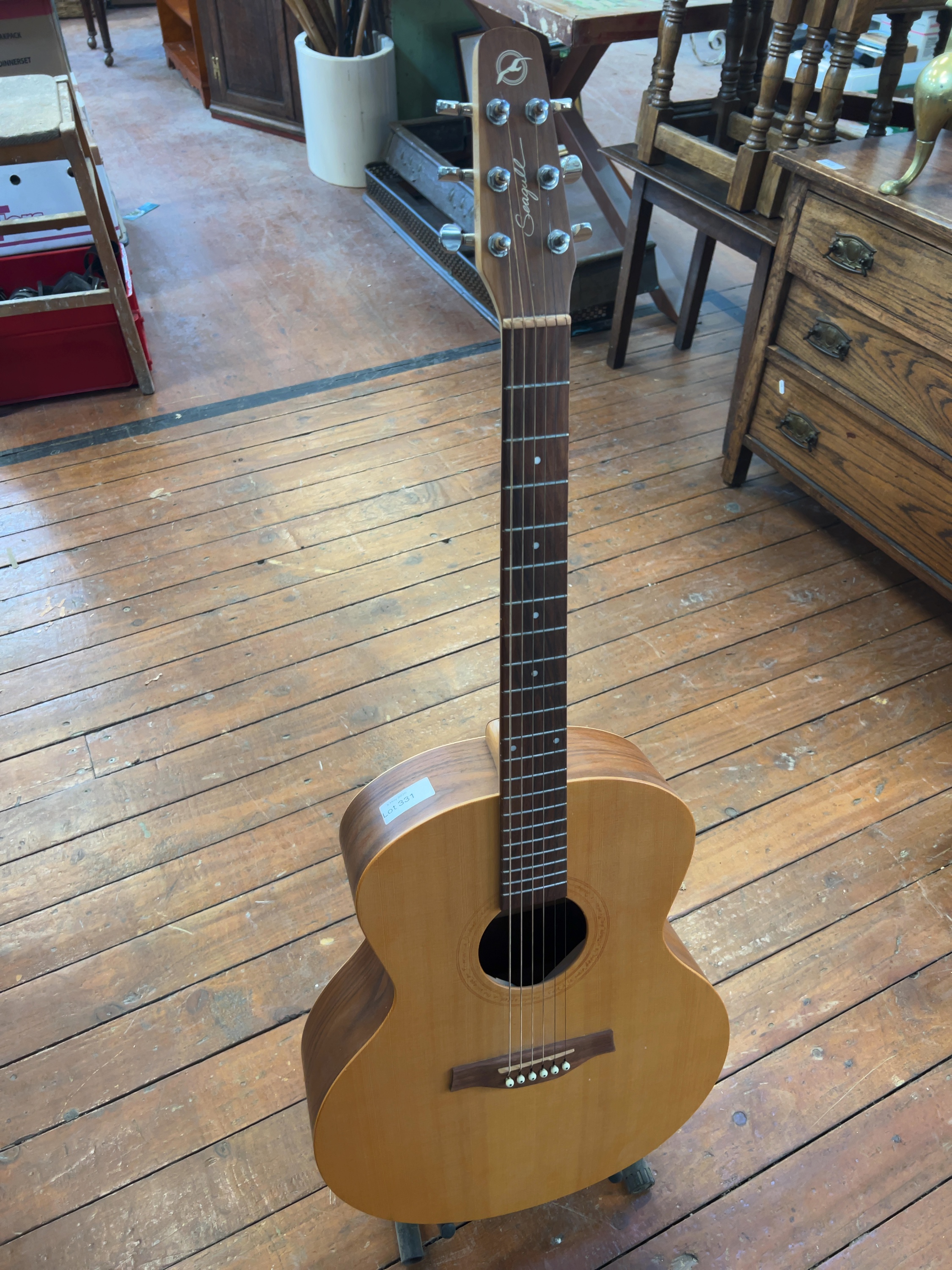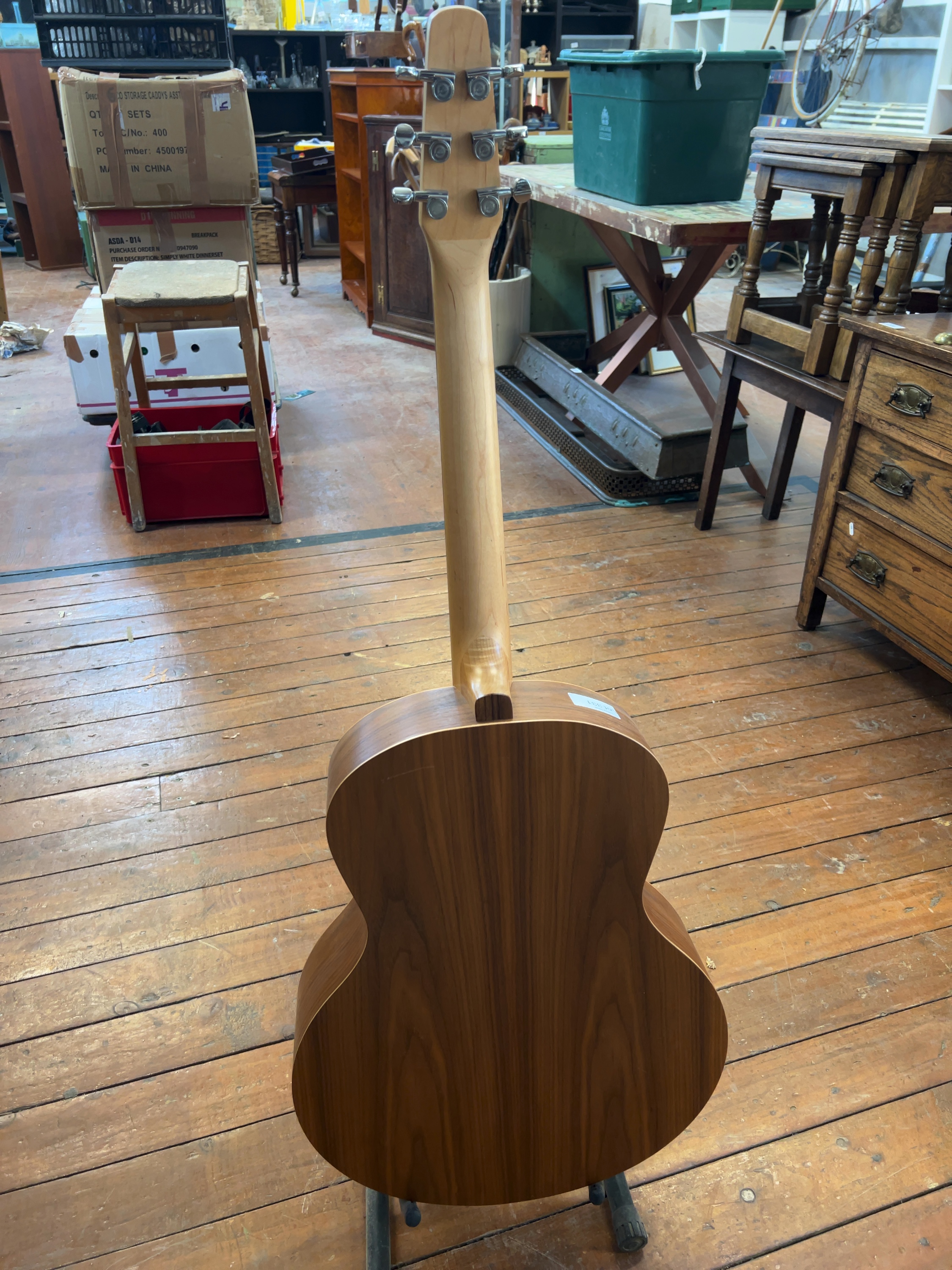 The instrument is in good structural condition with cosmetic wear commensurate with age and use, including light surface scuffs to the body. An auction lot sticker is present on the upper bout. The internal paper label is partially peeling at the edges but remains entirely legible. The strings are aged and would benefit from replacement. No case or gig bag is included with this lot.