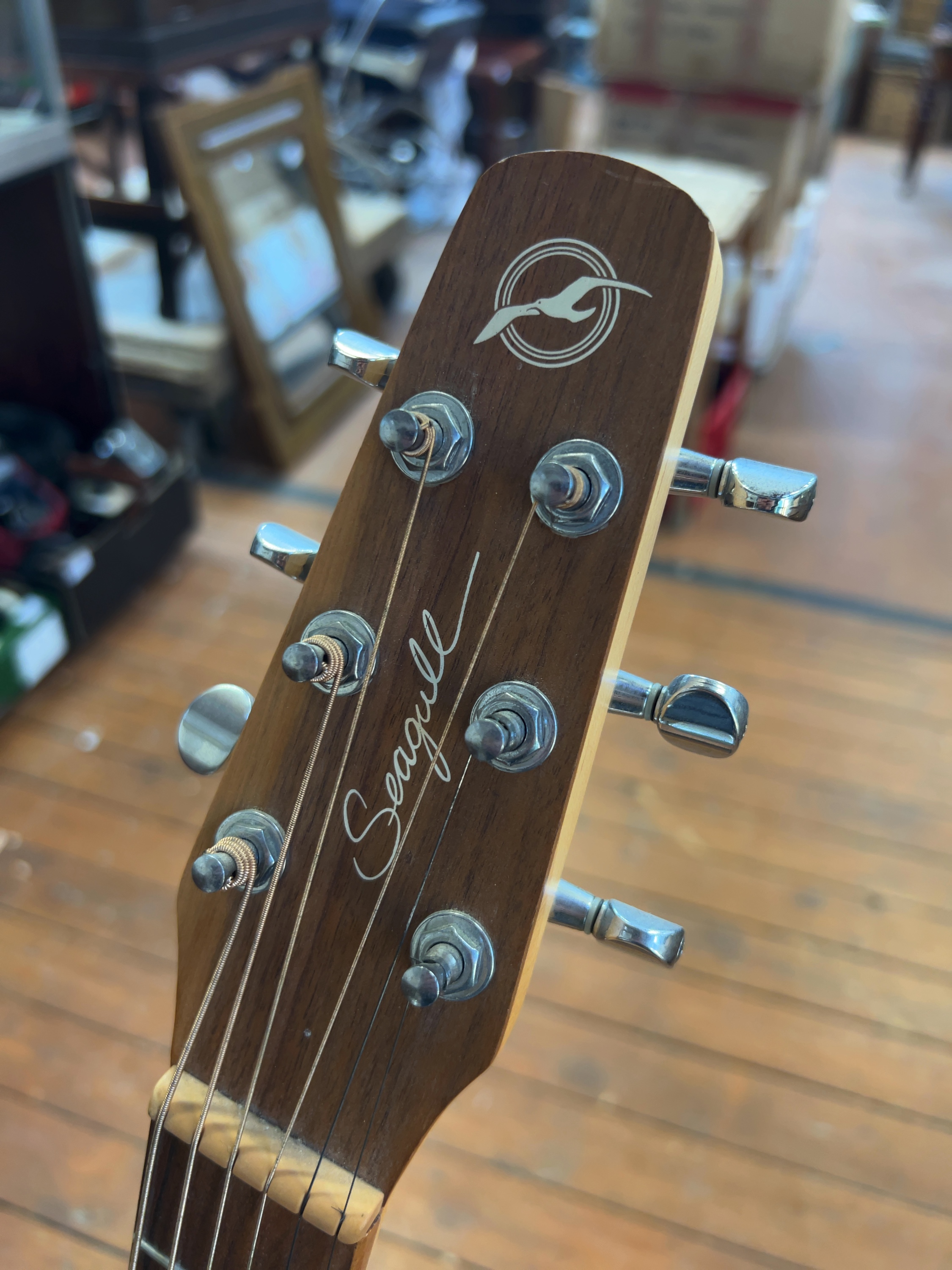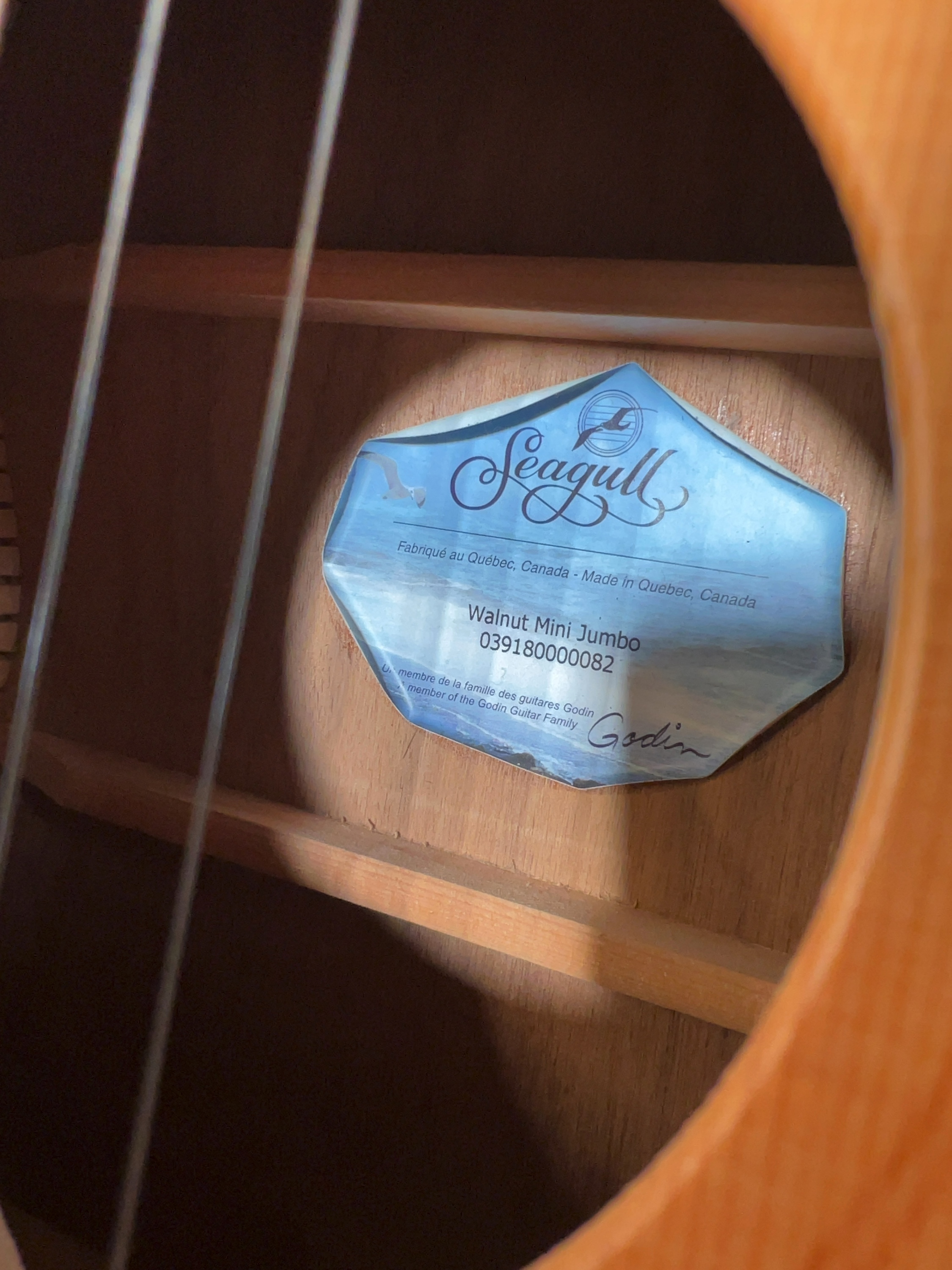 A six-string acoustic guitar by Seagull, a brand within the Godin Guitar family, produced in Quebec, Canada. An octagonal blue paper label is visible within the soundhole, detailing the model name, the serial number 039180000082, and its Canadian manufacture.