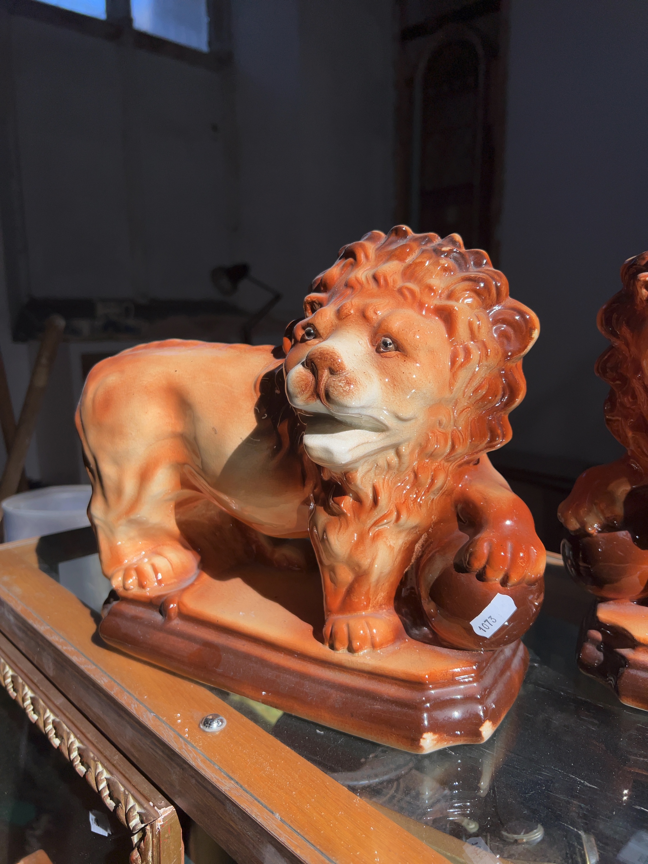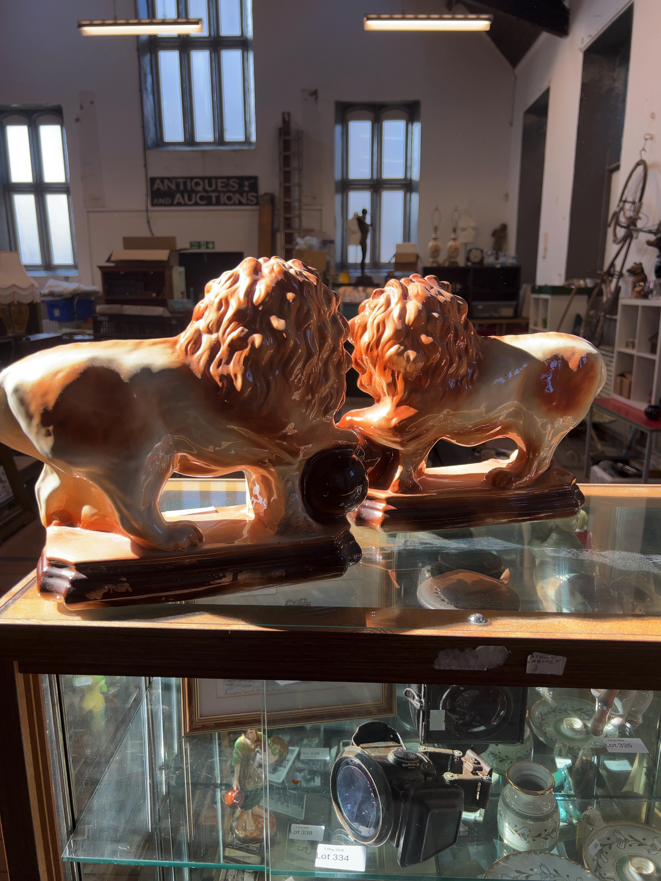 A pair of facing, recumbent lions modelled in the Medici style, possibly of Staffordshire origin. The underside of each base features a circular vent hole with faint impressed marks in the surrounding recessed area, including a character resembling the letter M or W and several indistinct numerical digits.
