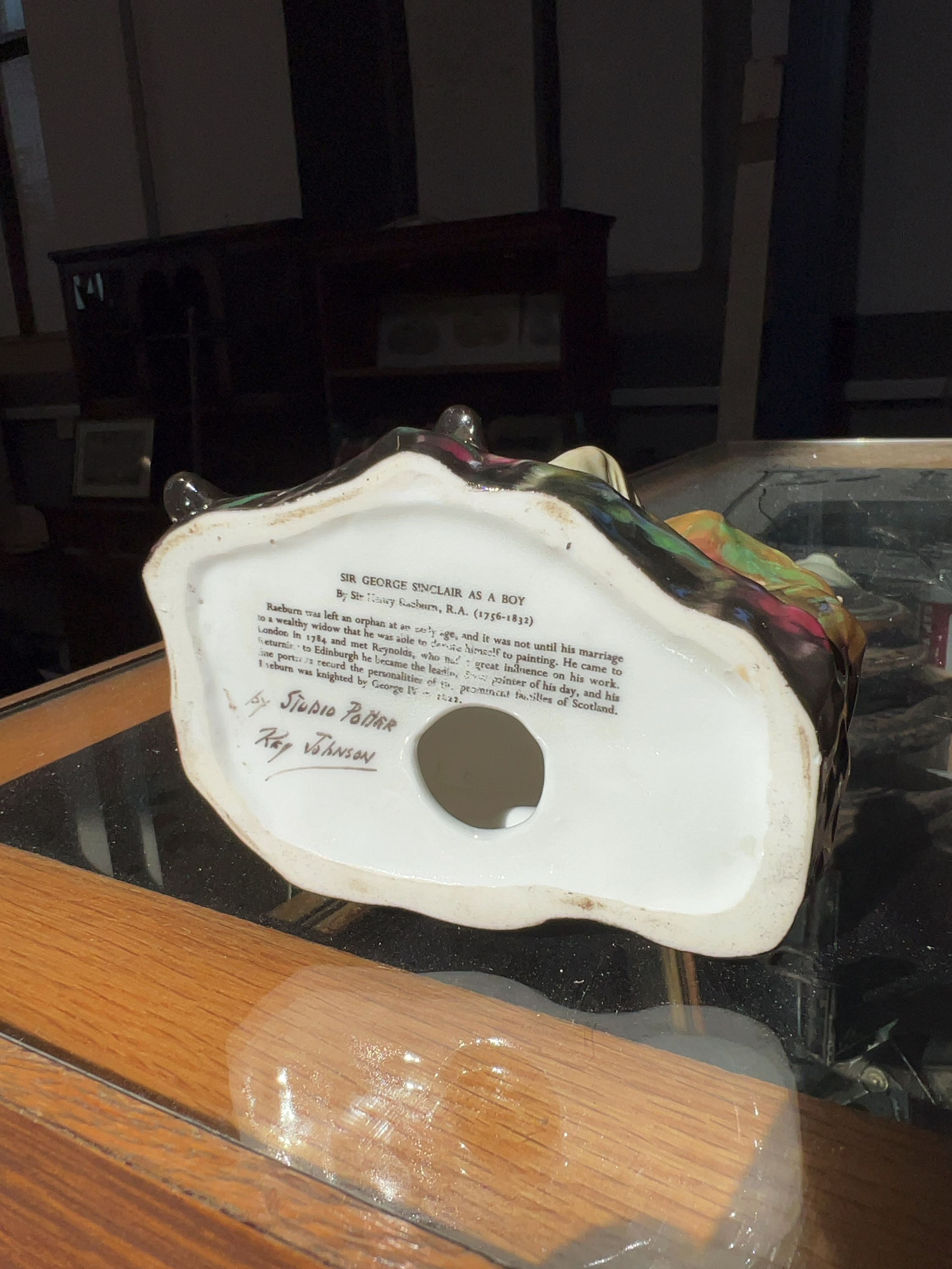 A polychrome glazed ceramic figurine titled Sir George Sinclair as a Boy, based on the portrait by Sir Henry Raeburn, R.A. (1756–1823). The underside of the base features a printed title and a biographical paragraph detailing Raeburn’s life and career as a leading Scottish portrait painter. To the left of the central vent hole, there is a handwritten inscription in black ink which reads By STUDIO POTTER followed by the signature Reg Johnson.