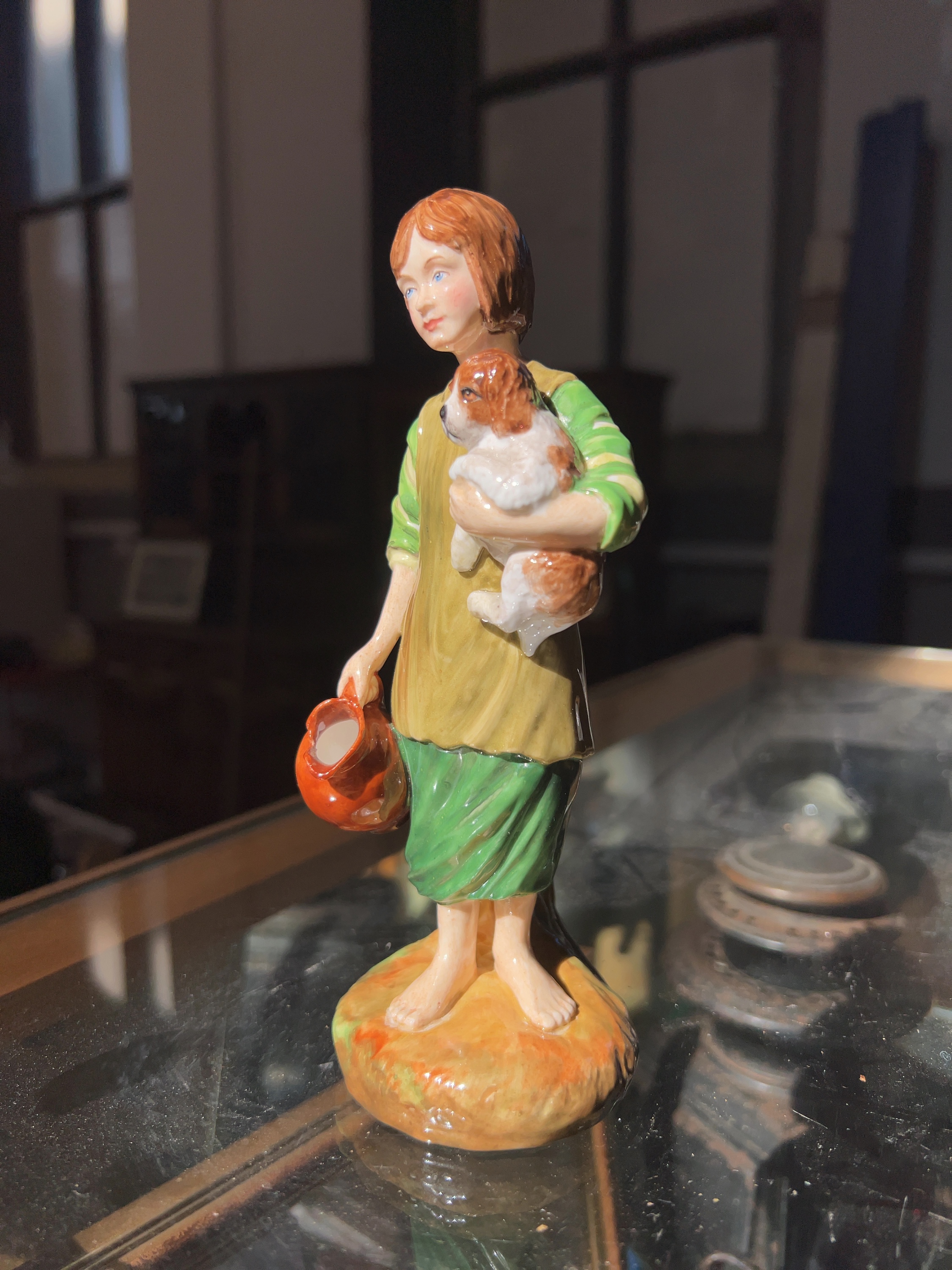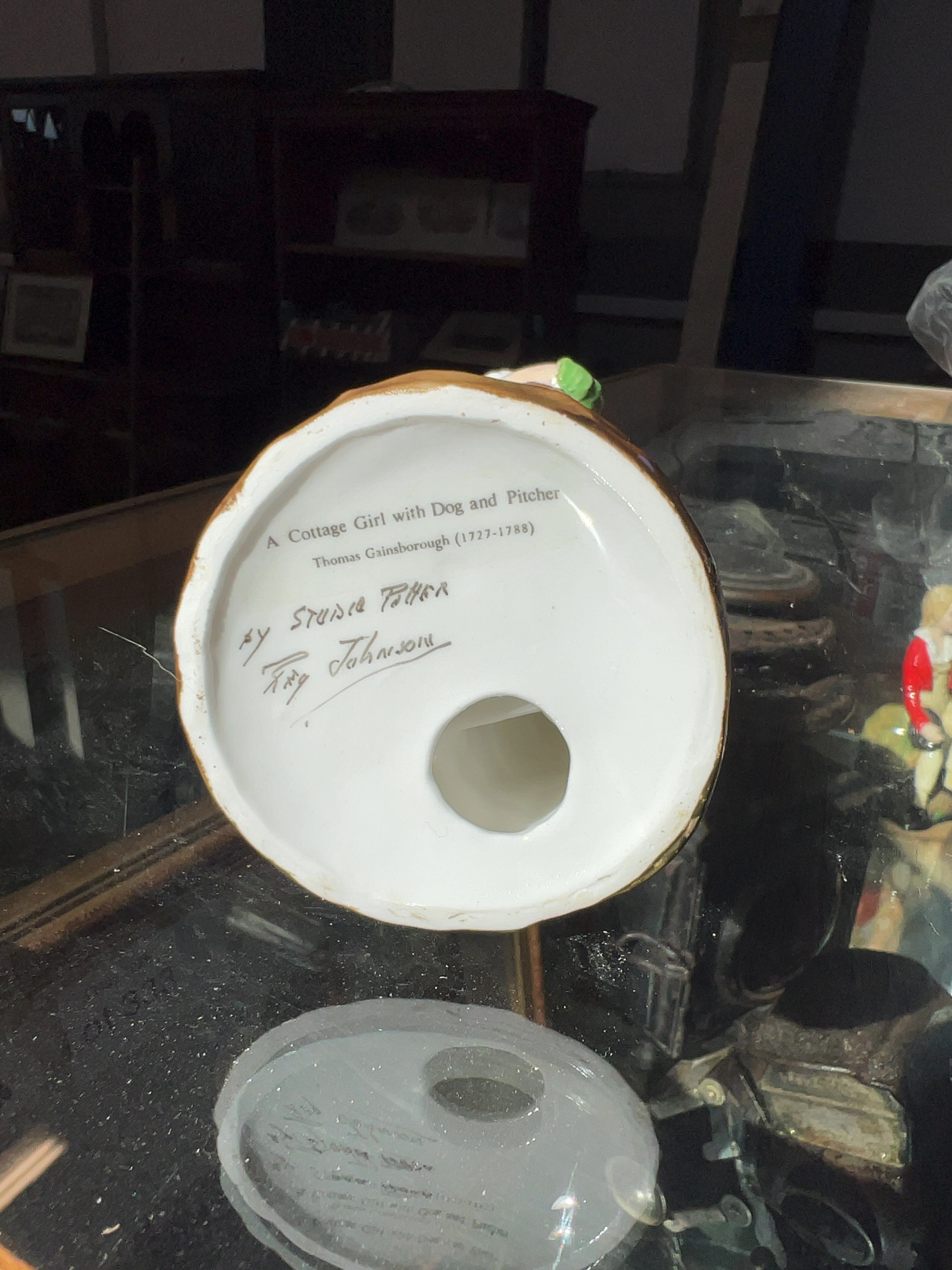 A gloss-glazed ceramic figurine titled A Cottage Girl with Dog and Pitcher, based upon the 1785 painting by Thomas Gainsborough. The underside of the base features printed text including the title and the name of the original artist, Thomas Gainsborough (1727-1788). Additionally, it is hand-inscribed by Studio Potter and bears the signature of Reg Johnson.