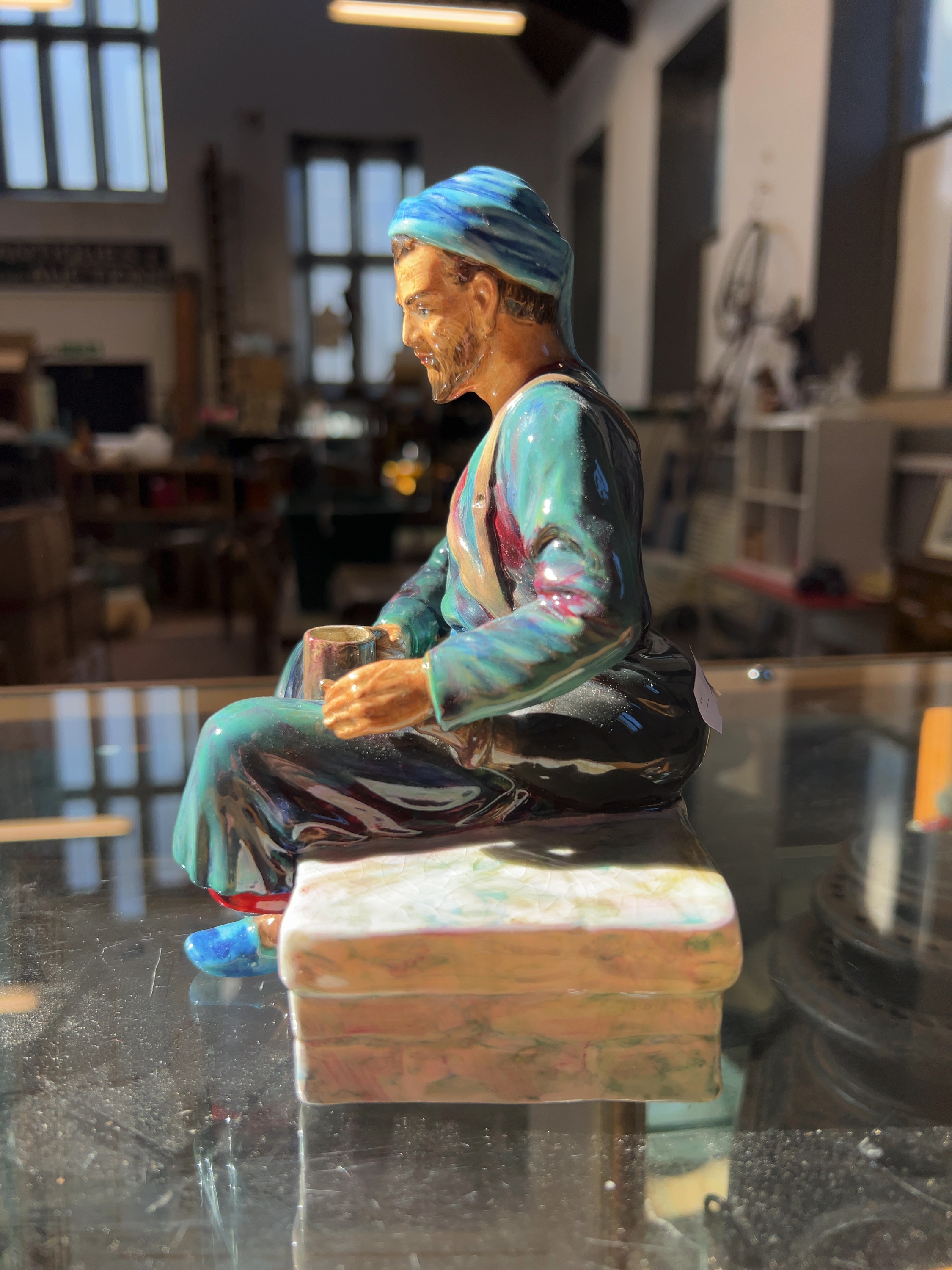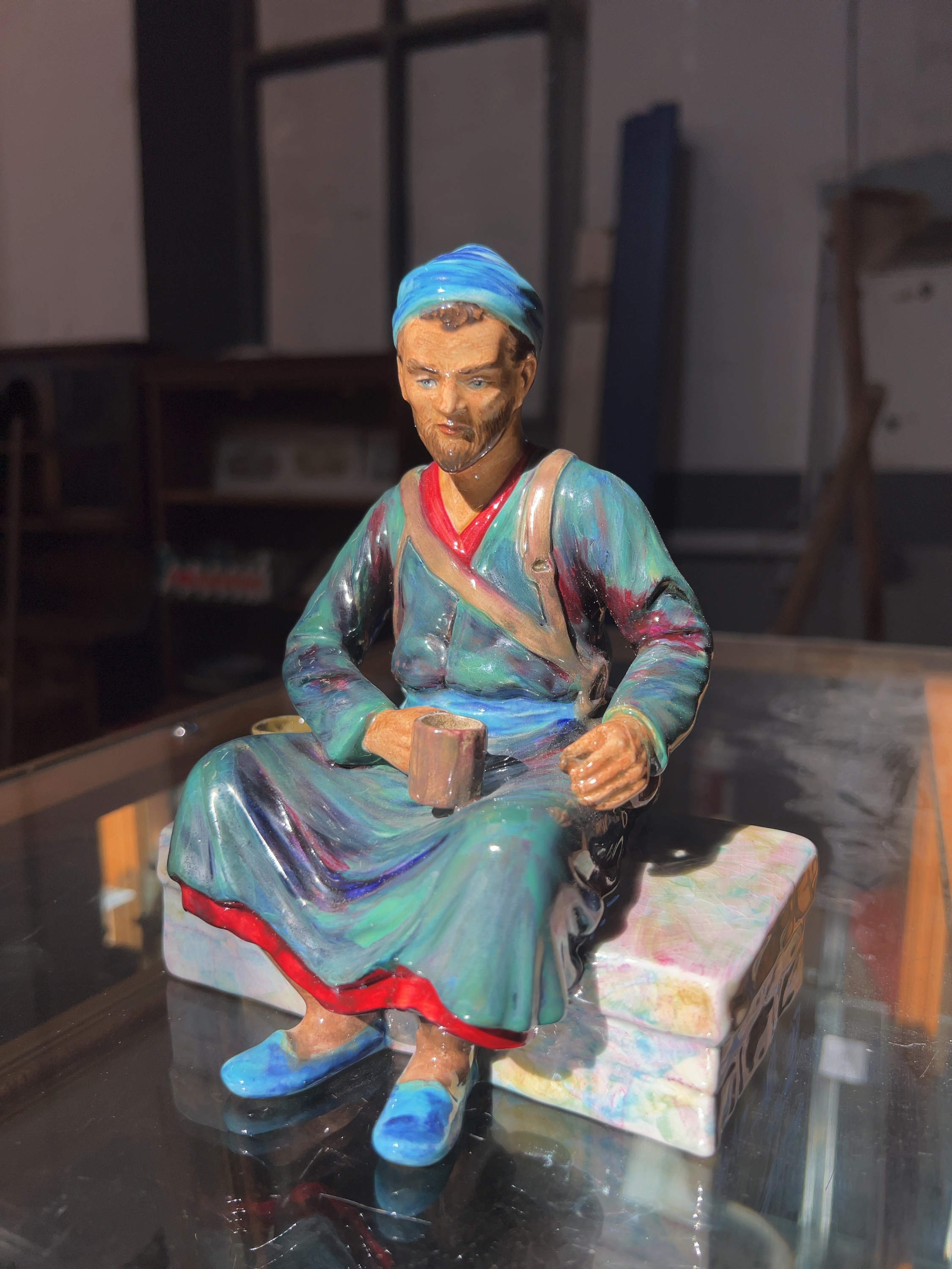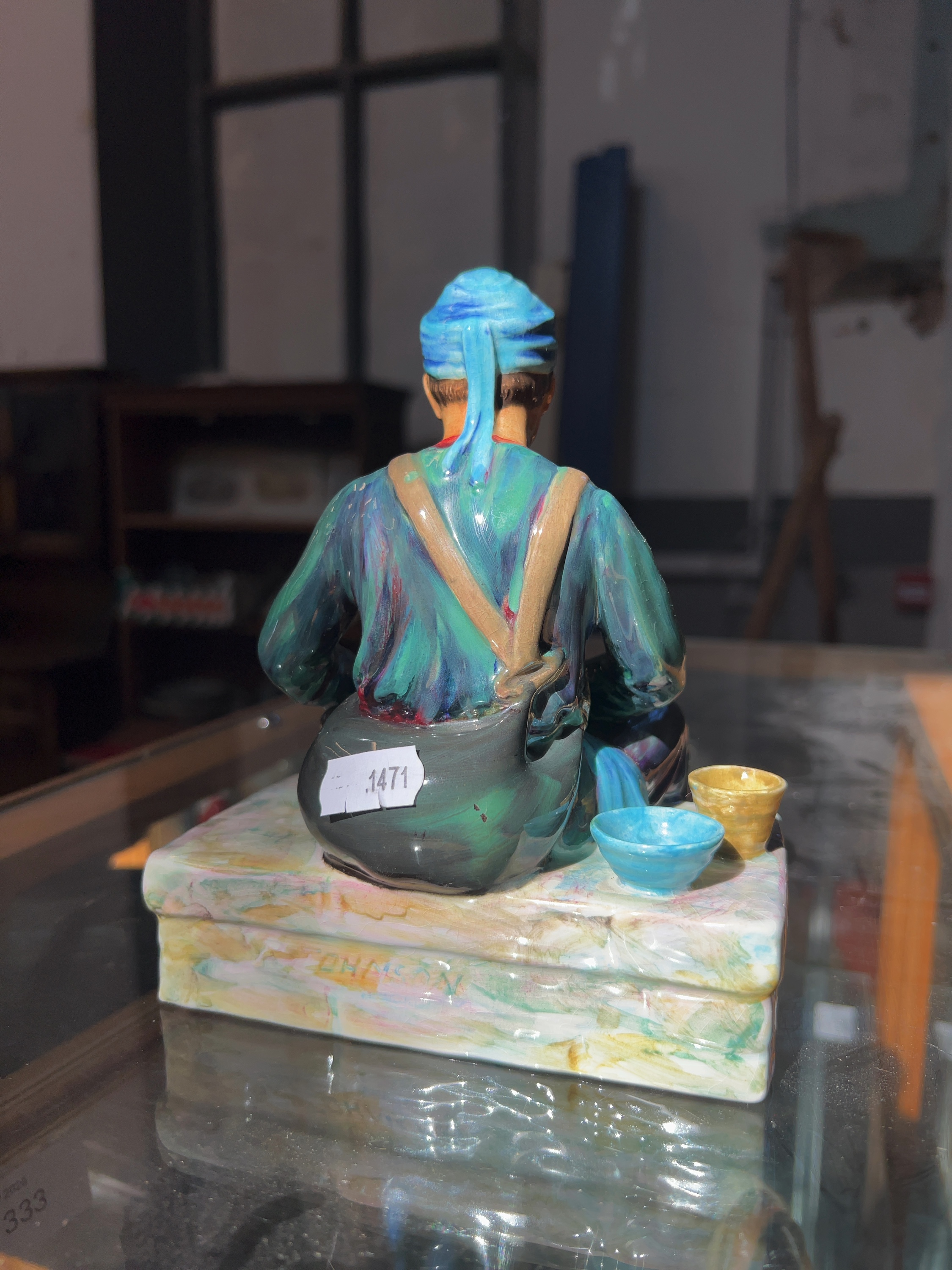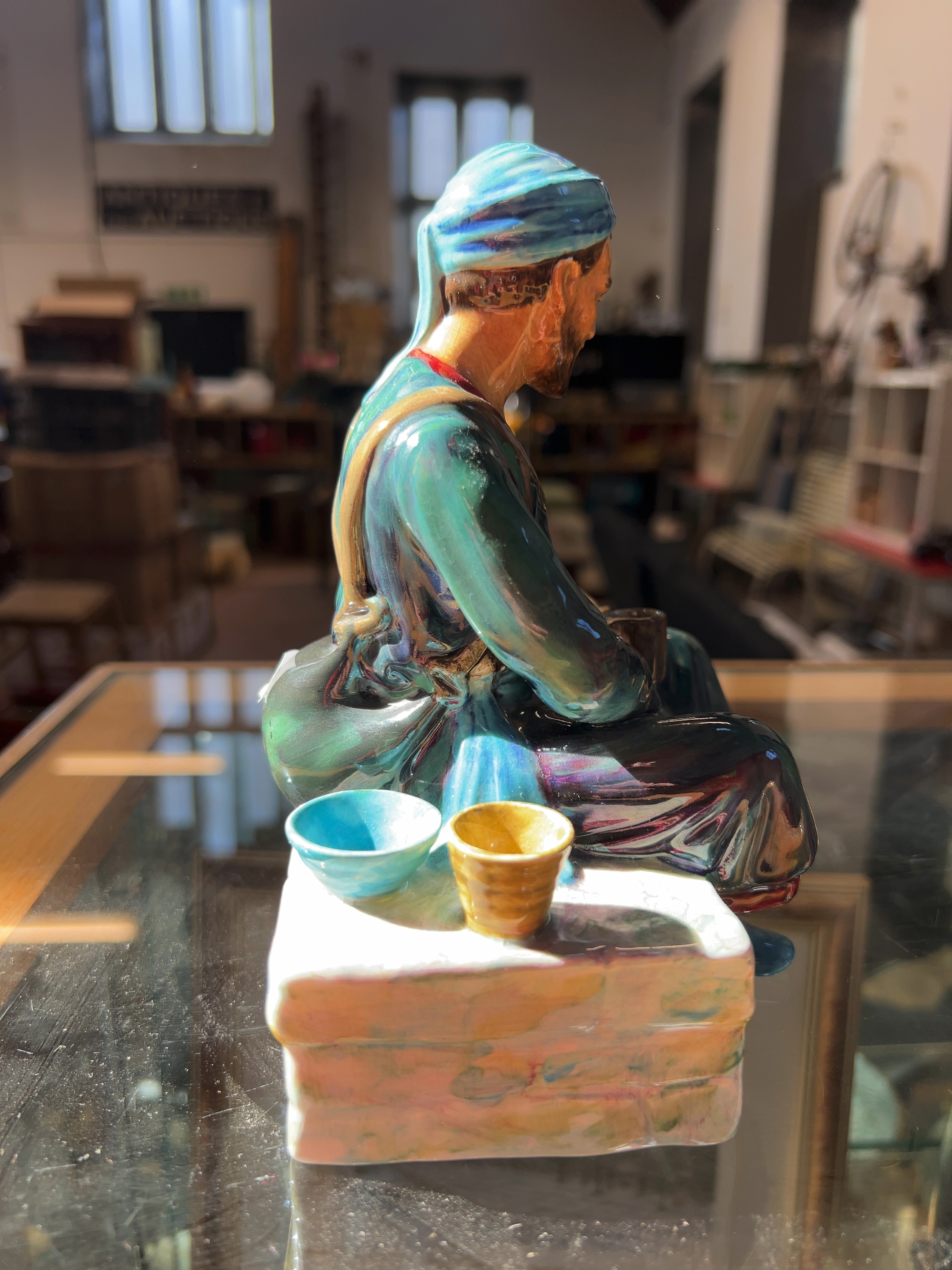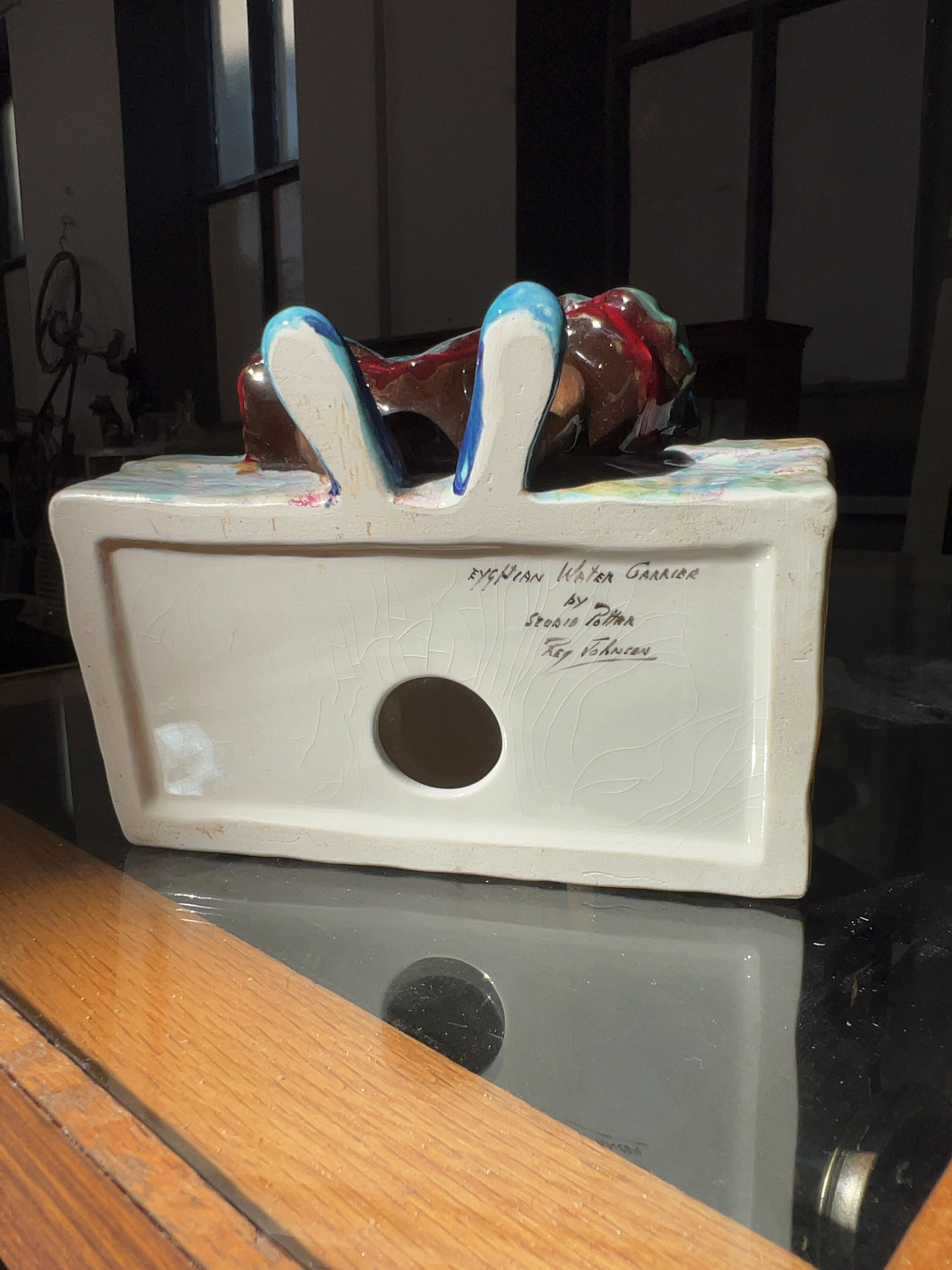 A studio pottery figurine titled Egyptian Water Carrier, hand-painted by the artist Reg Johnson. The base is hand-signed in black: EGYPTIAN WATER CARRIER / by / Studio Potter / Reg Johnson.