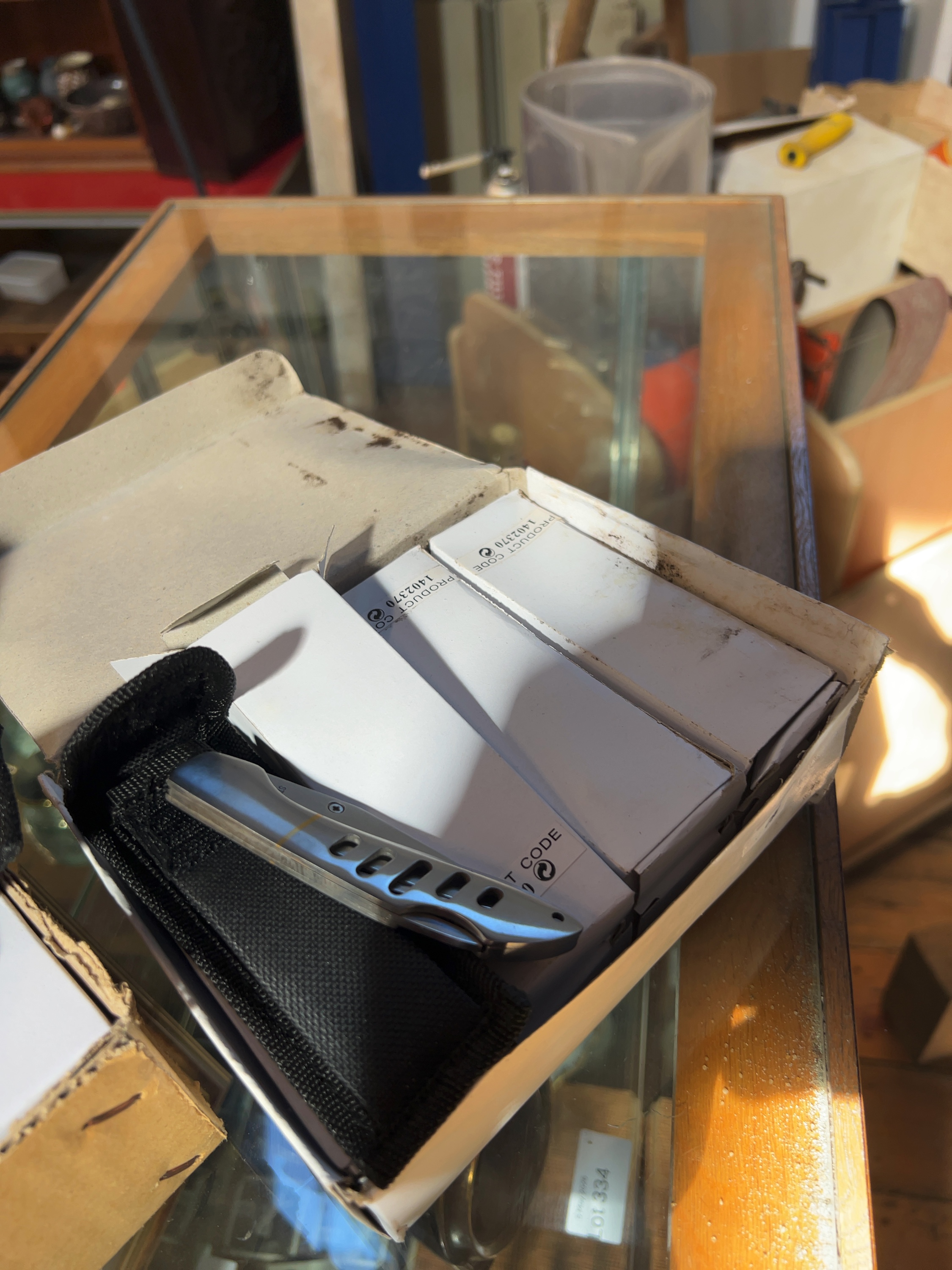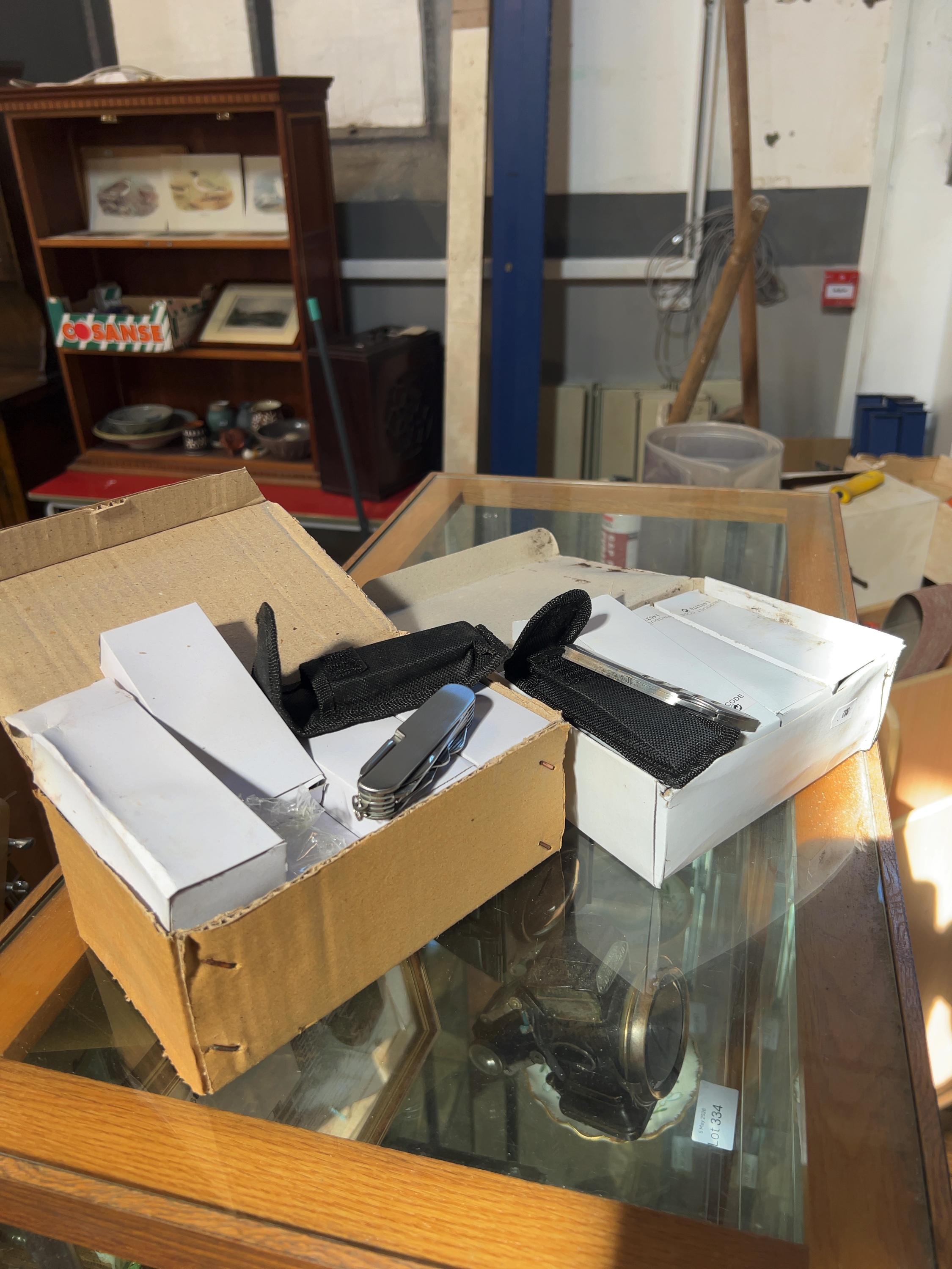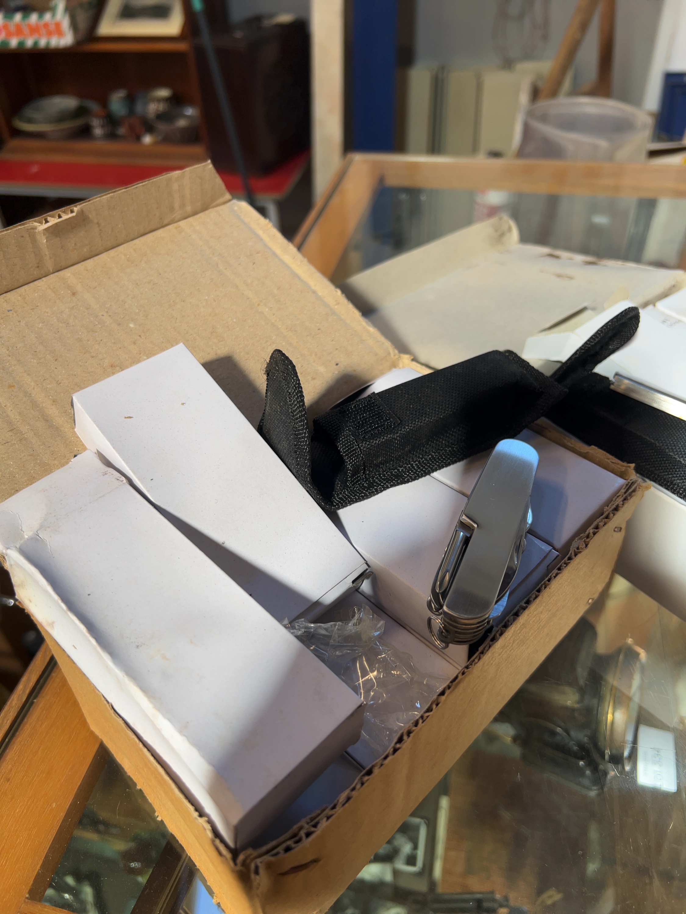 A collection of new-old-stock folding pocket knives and multi-tools, predominantly contained within individual white cardboard boxes.