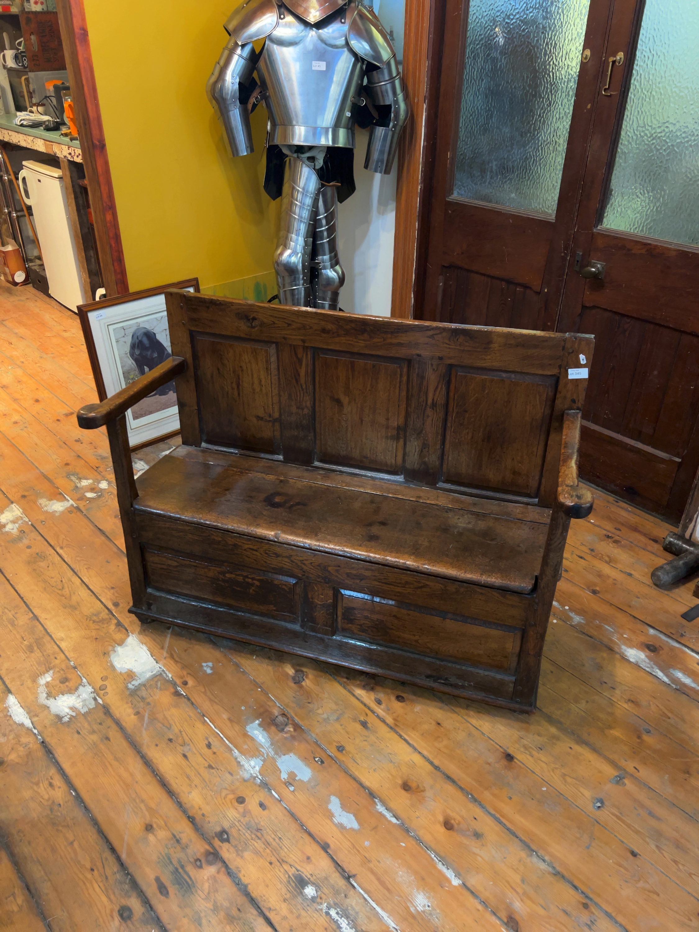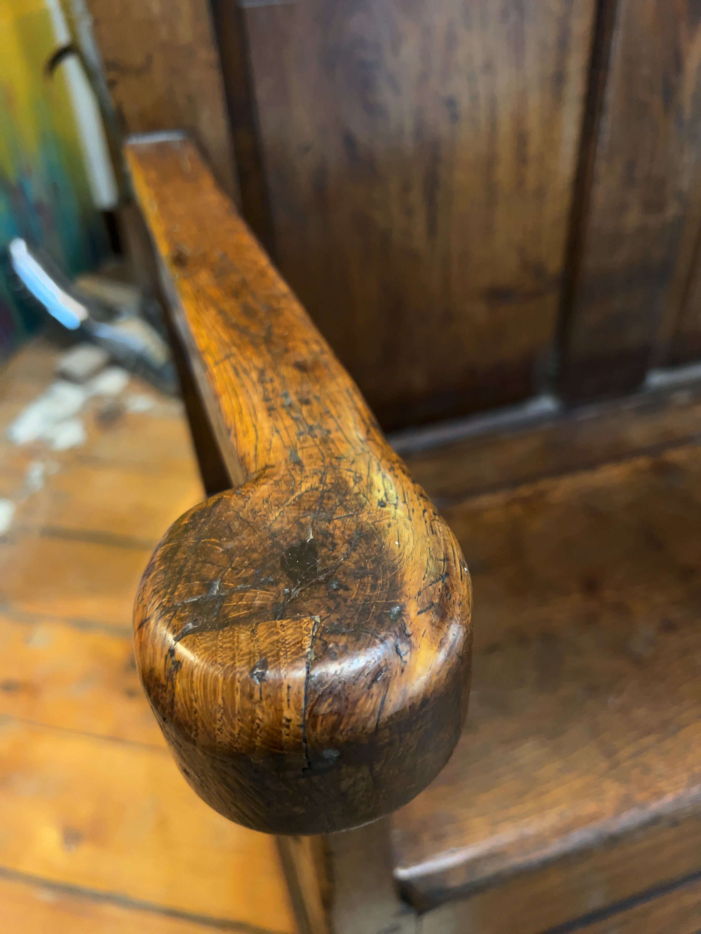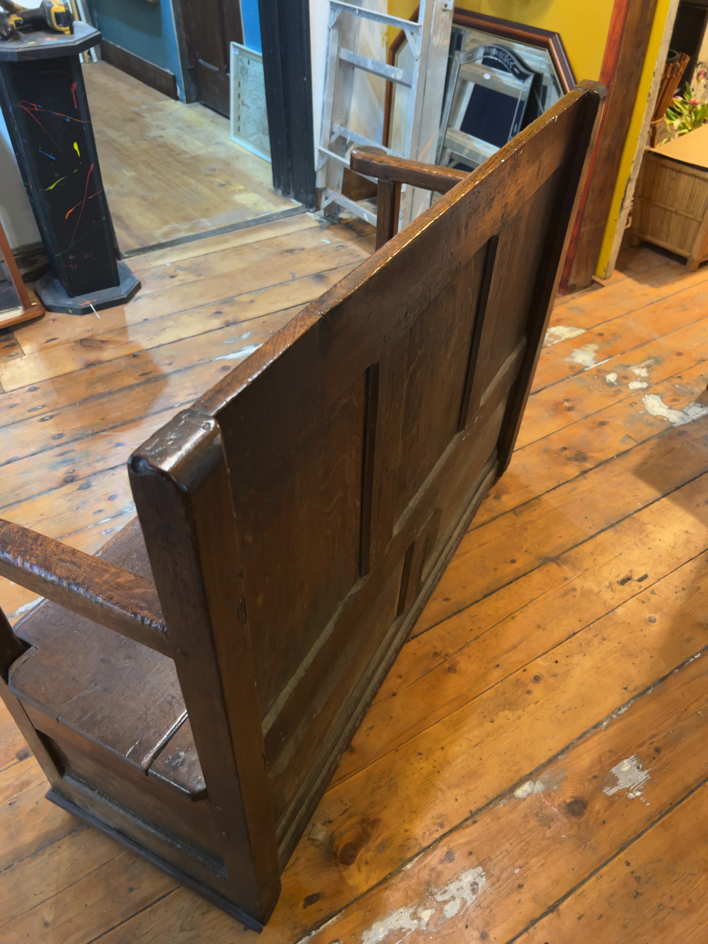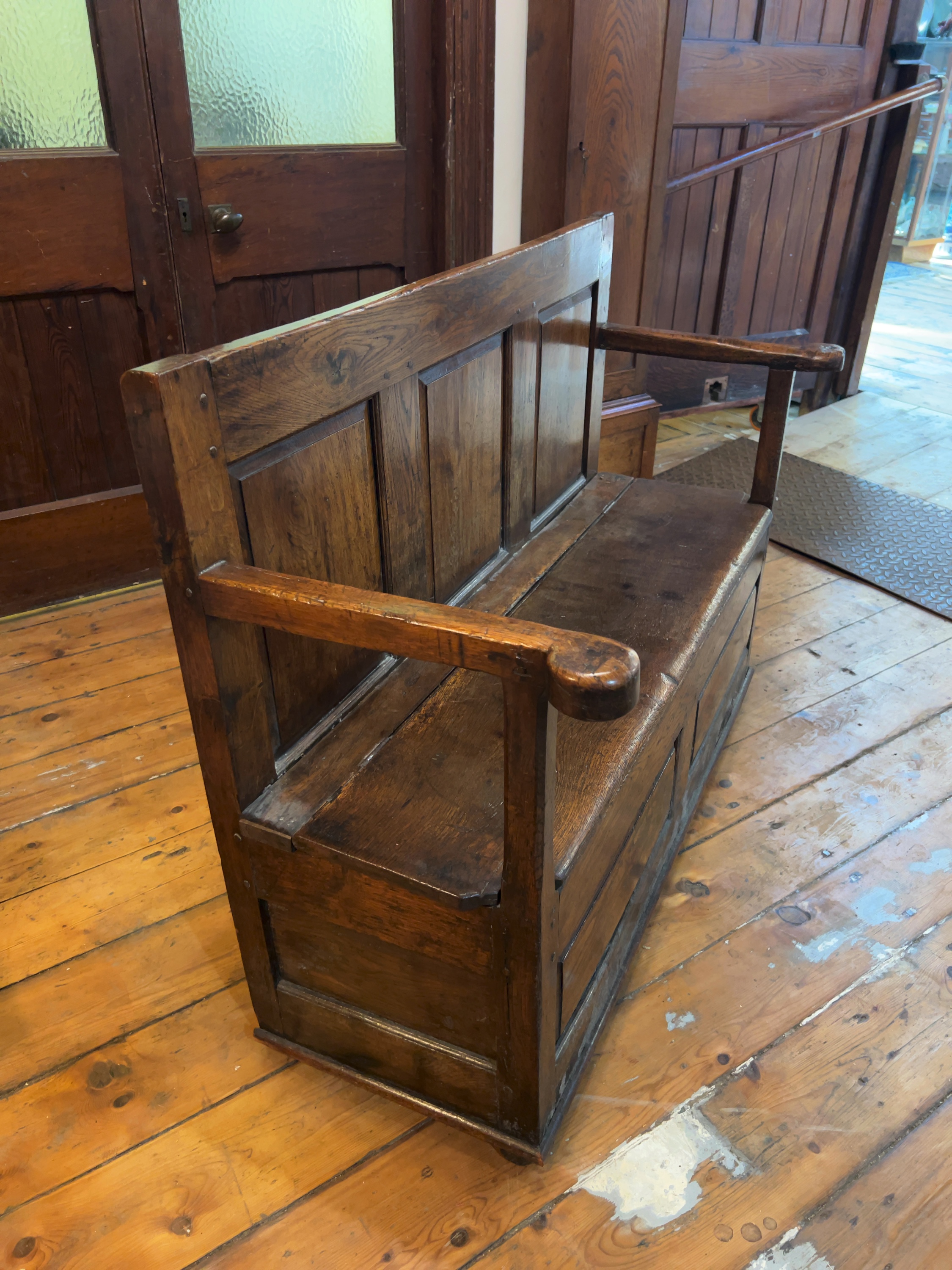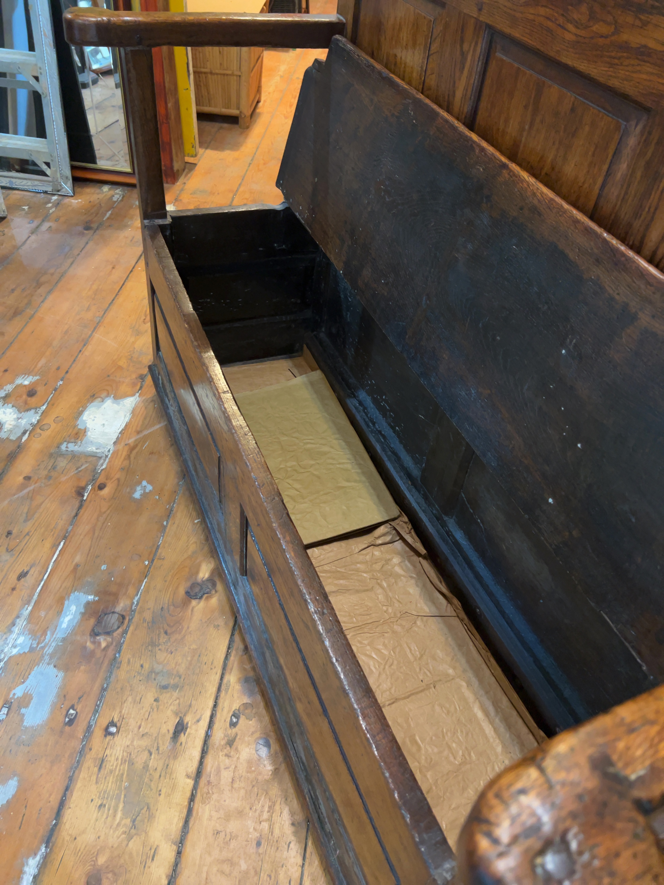 The settle is in a condition consistent with age and frequent use. There is significant wear to the finish throughout, including numerous scratches, scuffs, and small indentations, particularly on the seat and armrests. Several drying cracks and splits are visible, most notably on the scrolled armrest terminals; these appear to be stable age-related movements in the timber. The hinges are present and functional. The interior compartment shows signs of use and darkening but remains structurally sound.