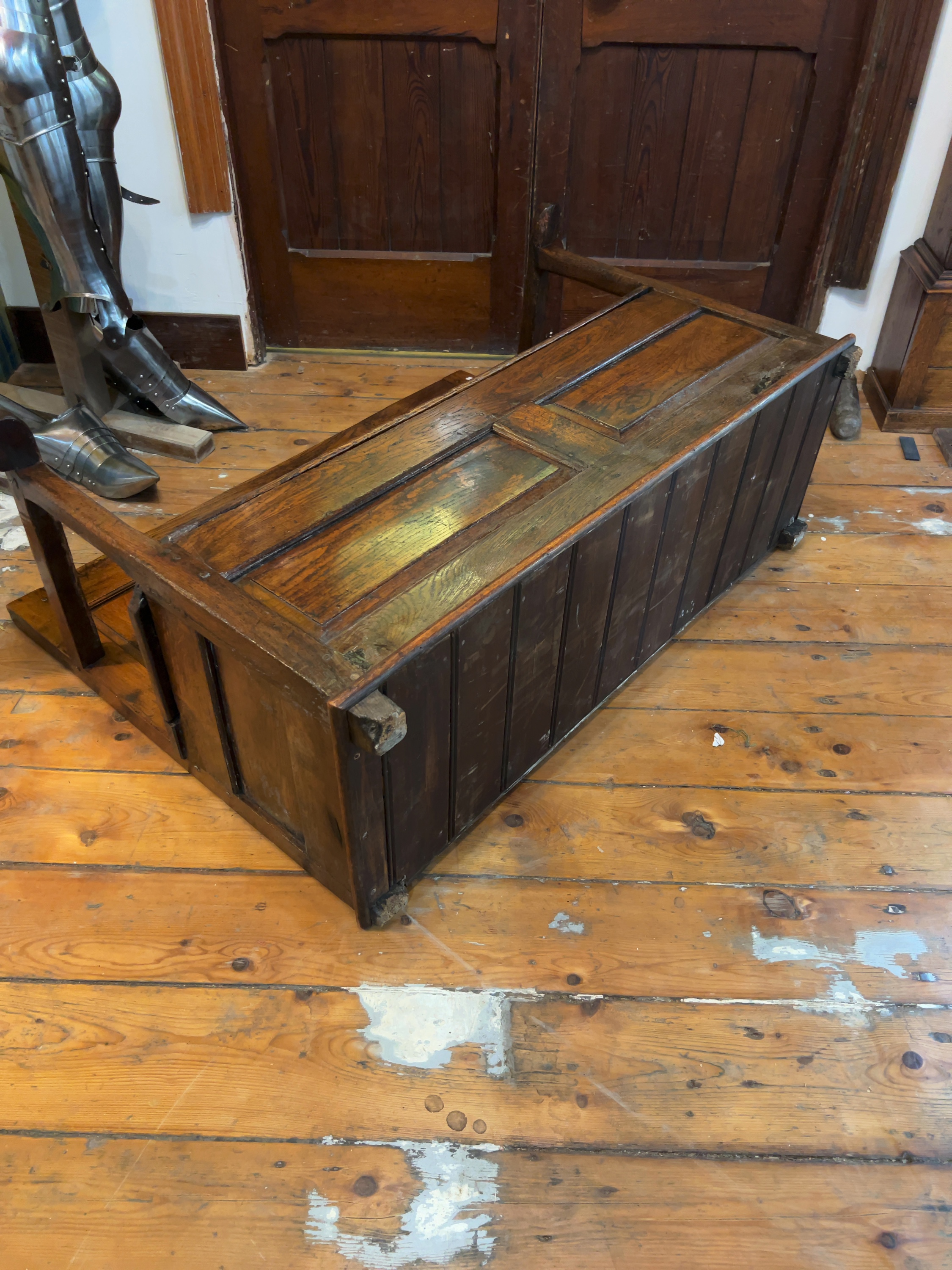 An oak box settle, also known as a hall bench, designed in the 17th-century Jacobean style.No maker’s marks or labels are visible.