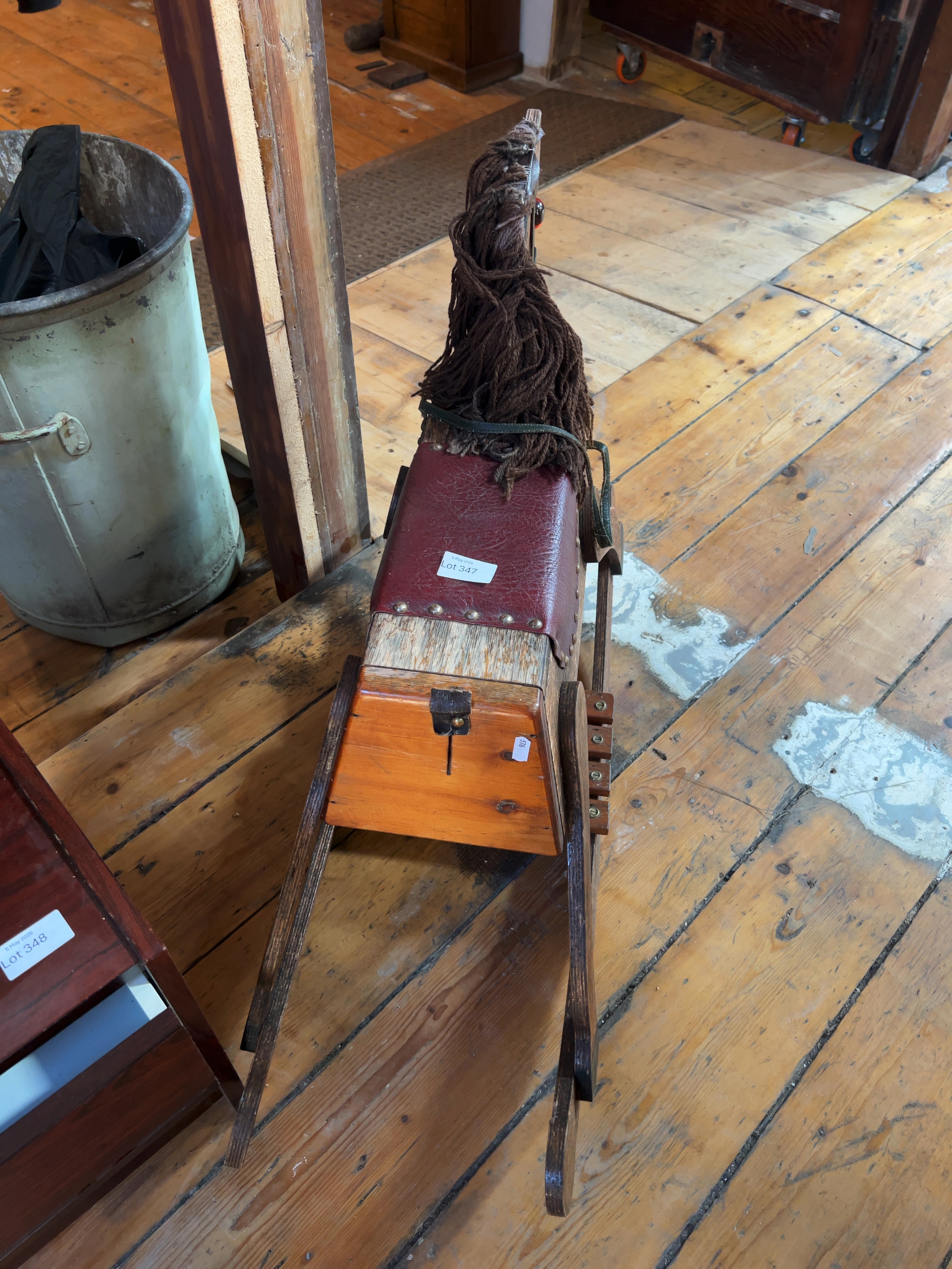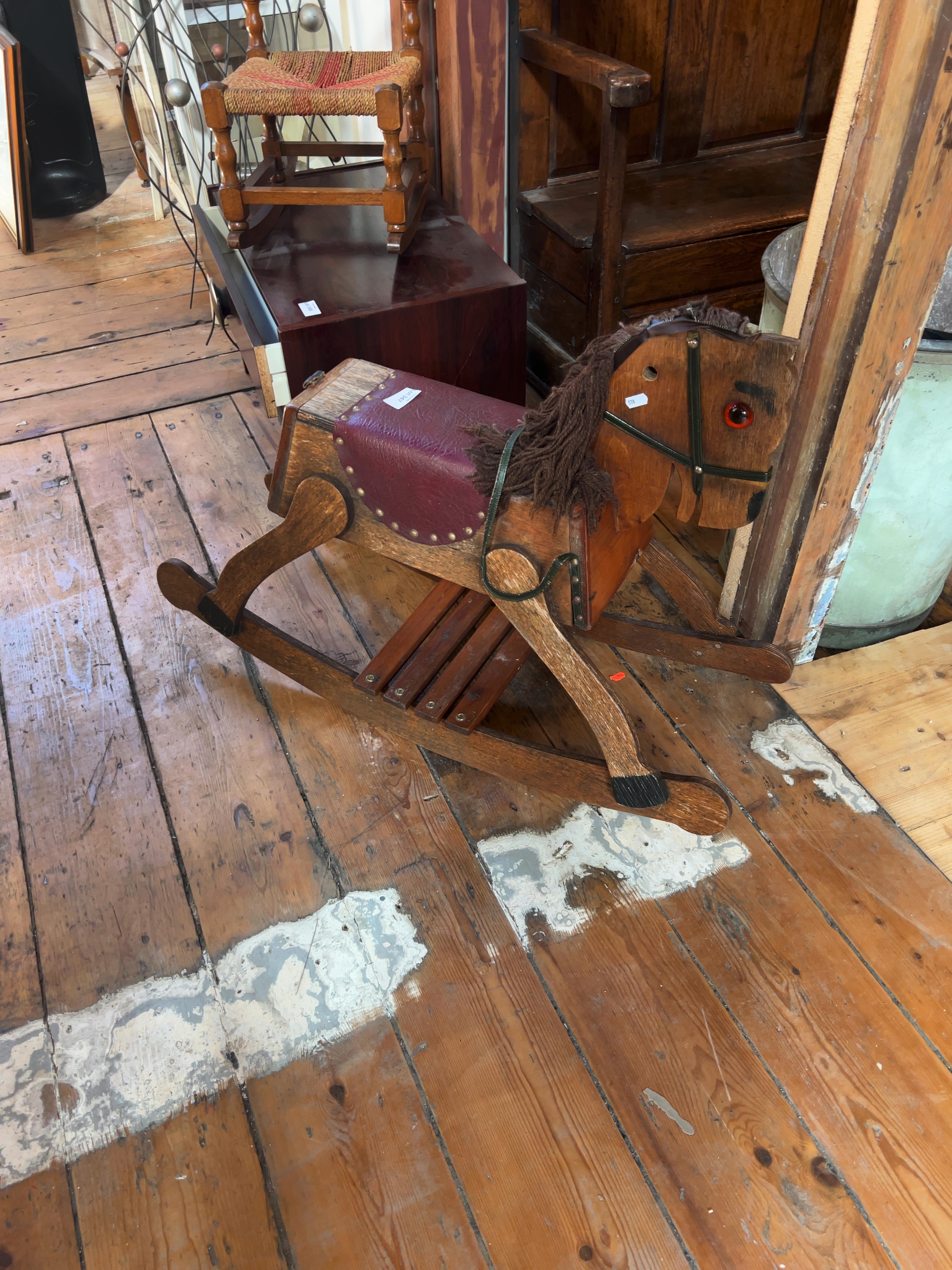 The item is in well-used condition, displaying various scuffs, scratches, and significant wear to the stained finish throughout. Wear is particularly visible on the rockers and edges, consistent with age and functional play. The yarn mane and tail are present but show signs of matting. The structure remains functional and sound.