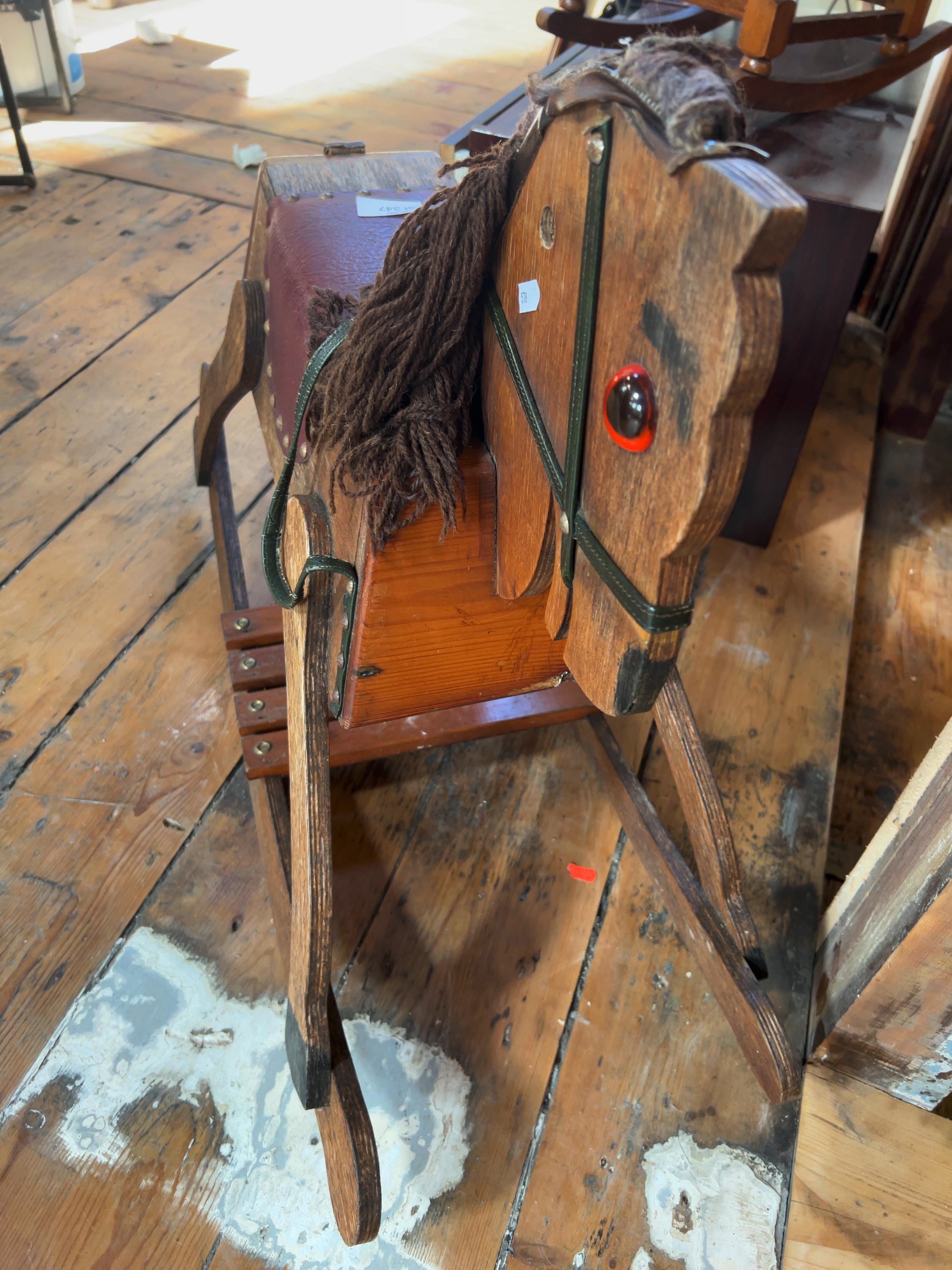 A vintage rocking horse of mid-20th-century design, constructed from stained wood. The piece features a stylised silhouette with a hollow body containing an internal storage compartment, accessed via a hinged rear panel with a small metal latch.