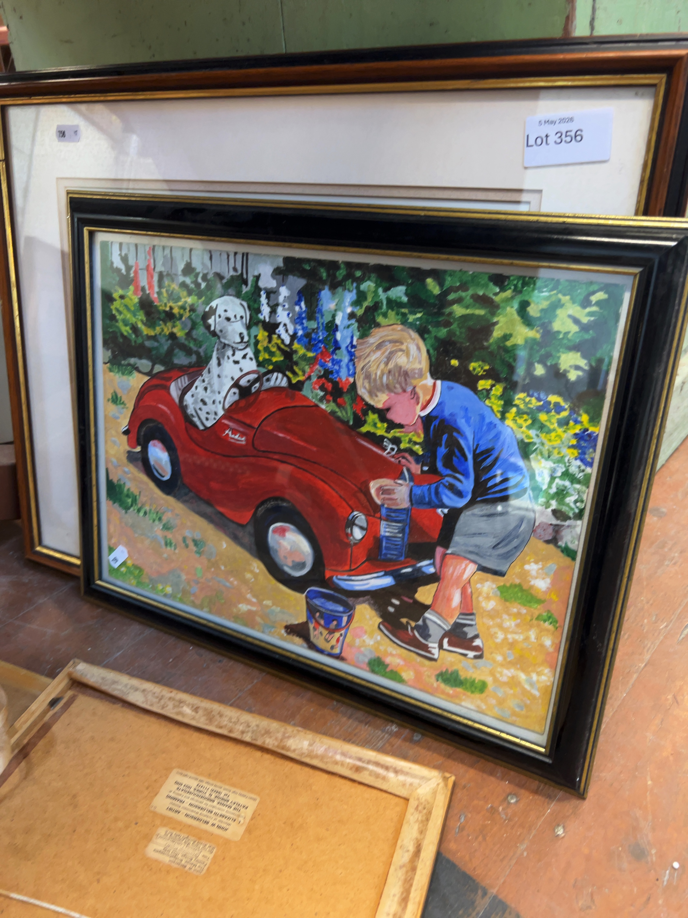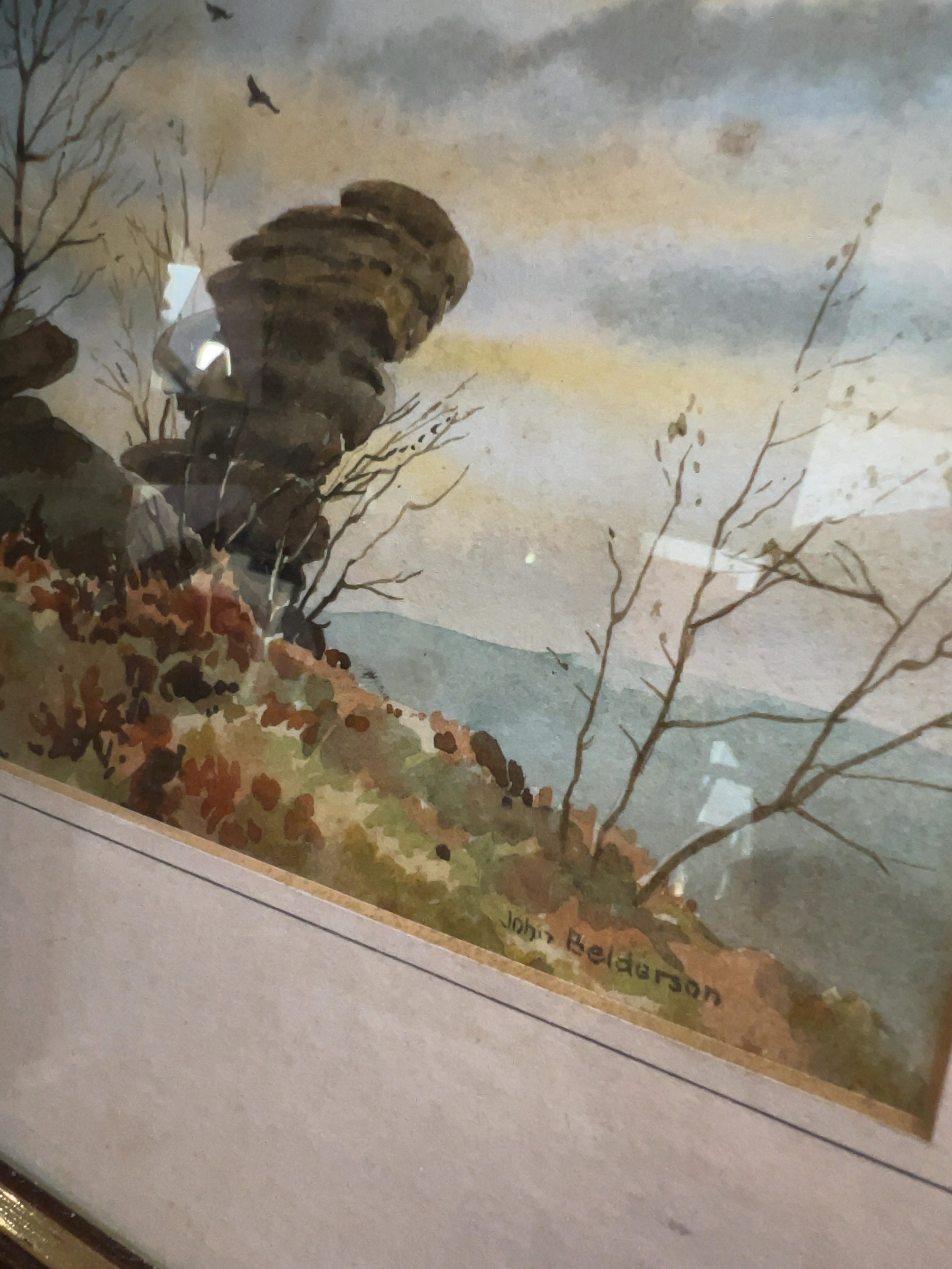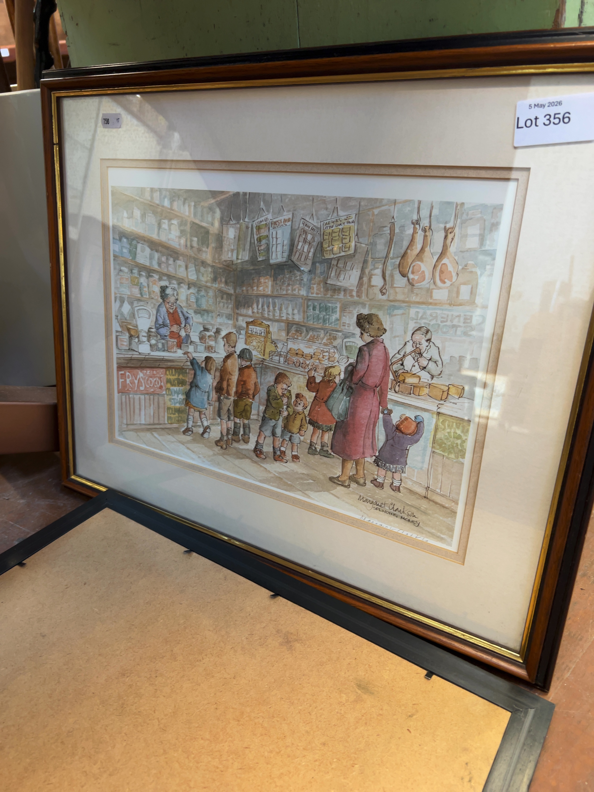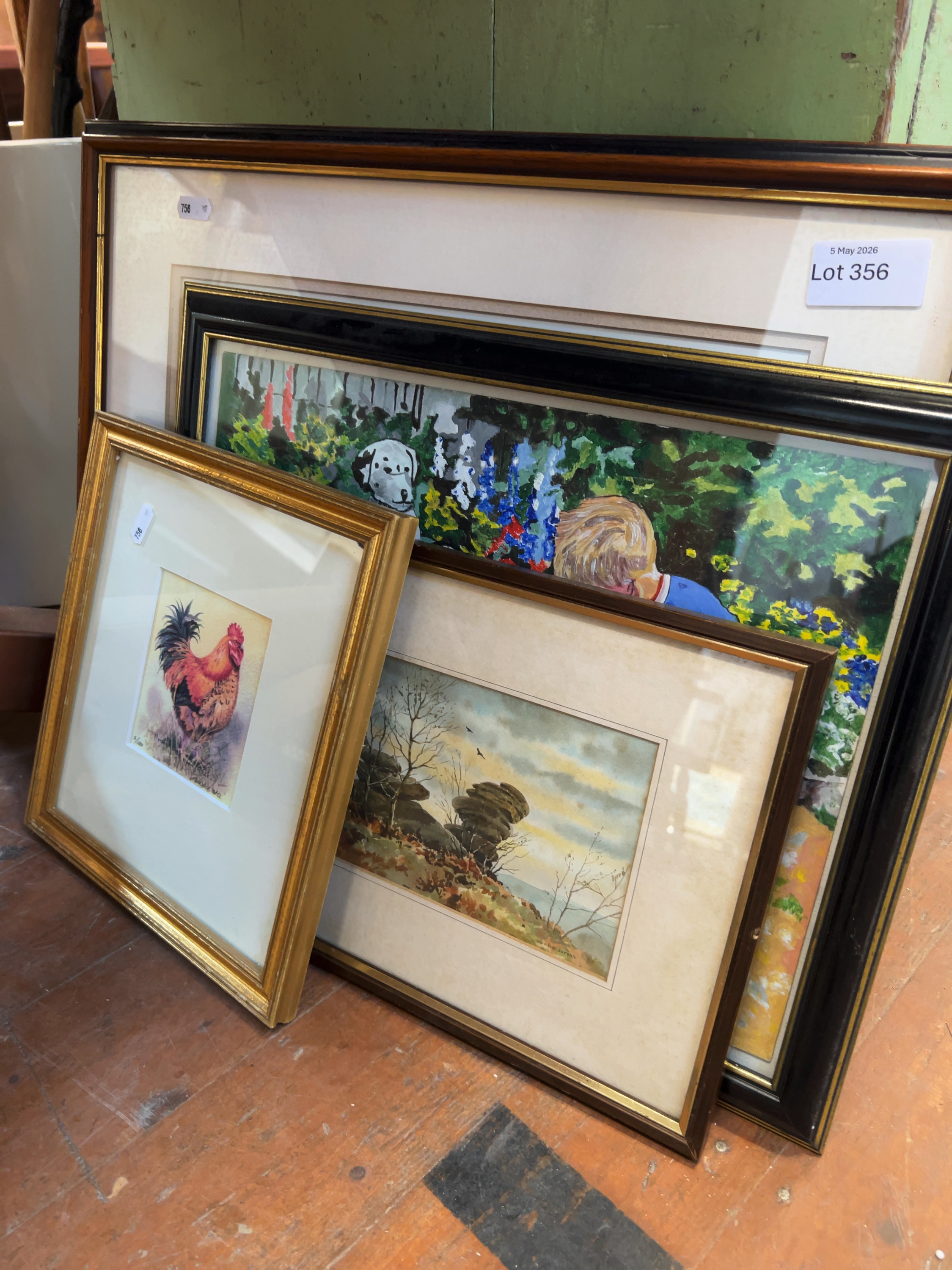 A group of framed artworks comprising several pieces in various media. The collection features a large watercolour and ink illustration on paper titled Spending Money by Margaret Clarkson; a landscape watercolour on paper signed in the lower right John Belderson; a third painting the verso of the frame bears trade labels for JOHN W. BELDERSON – ARTIST and ELIZABETH BELDERSON – FRAMING from Pateley Bridge, Harrogate. The group is completed by a small, square watercolour study of a rooster in a gilt frame. All works are glazed and presented in varied frames.