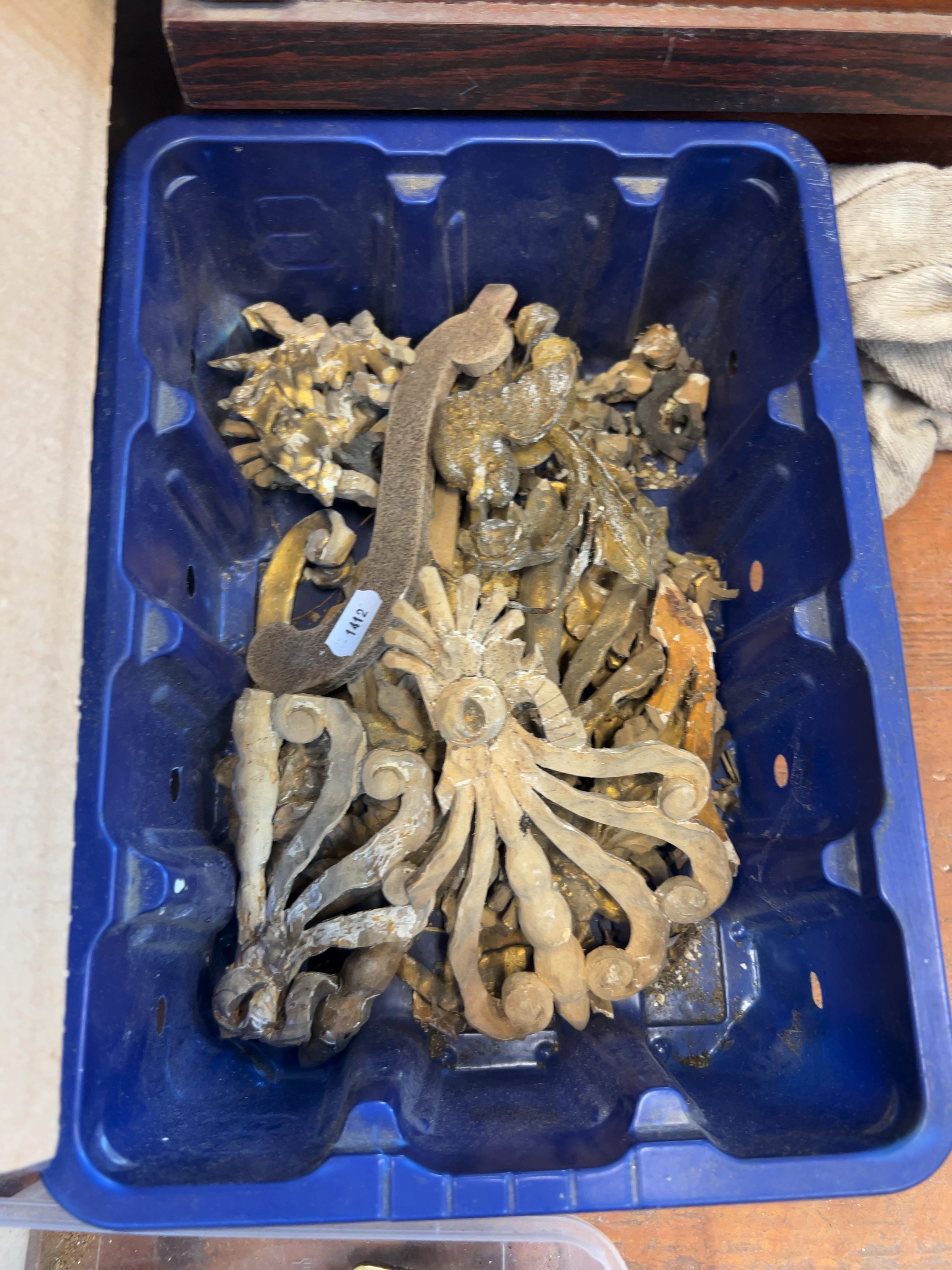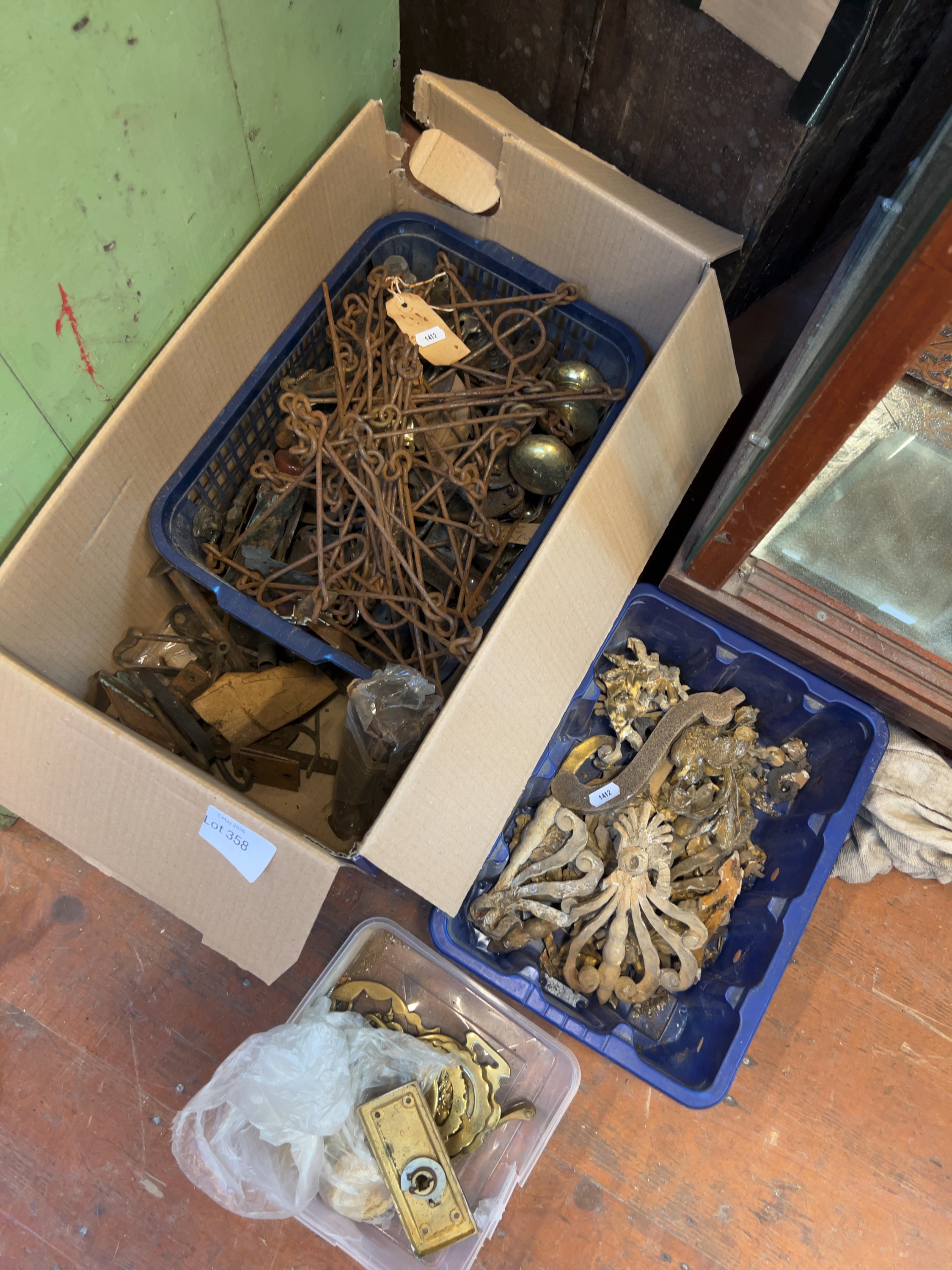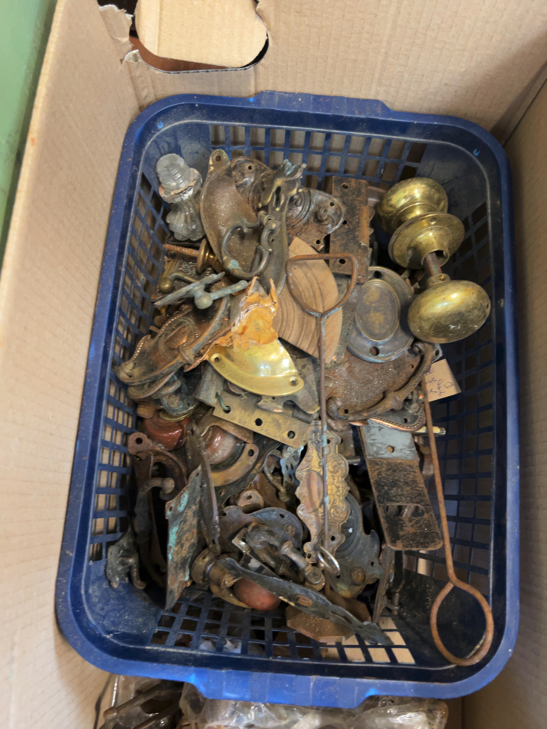 This large multi-container lot comprises a diverse collection of antique and vintage architectural salvage, furniture fittings, and decorative metalwork constructed from brass, cast iron, wrought iron, and cast base metal.