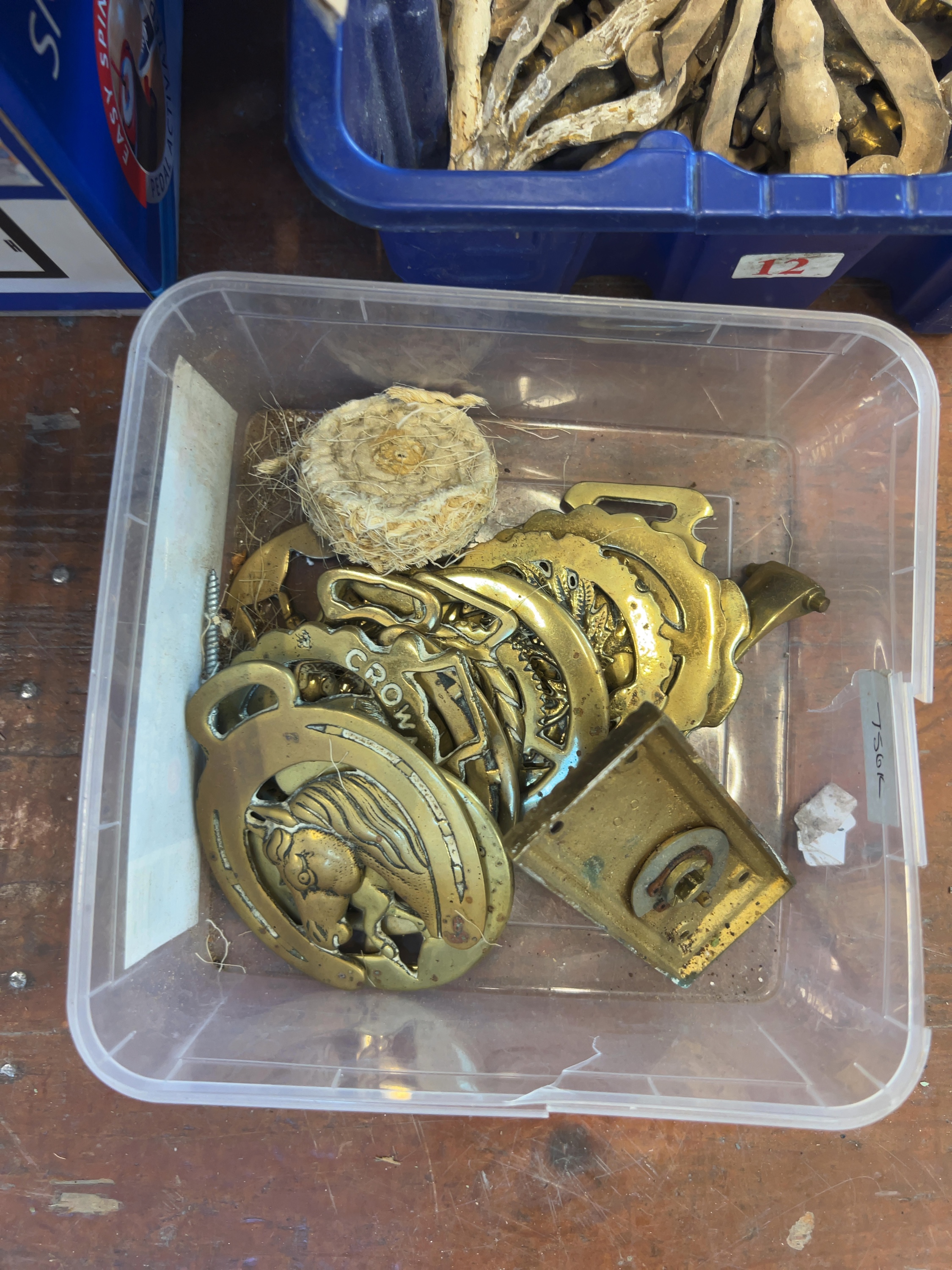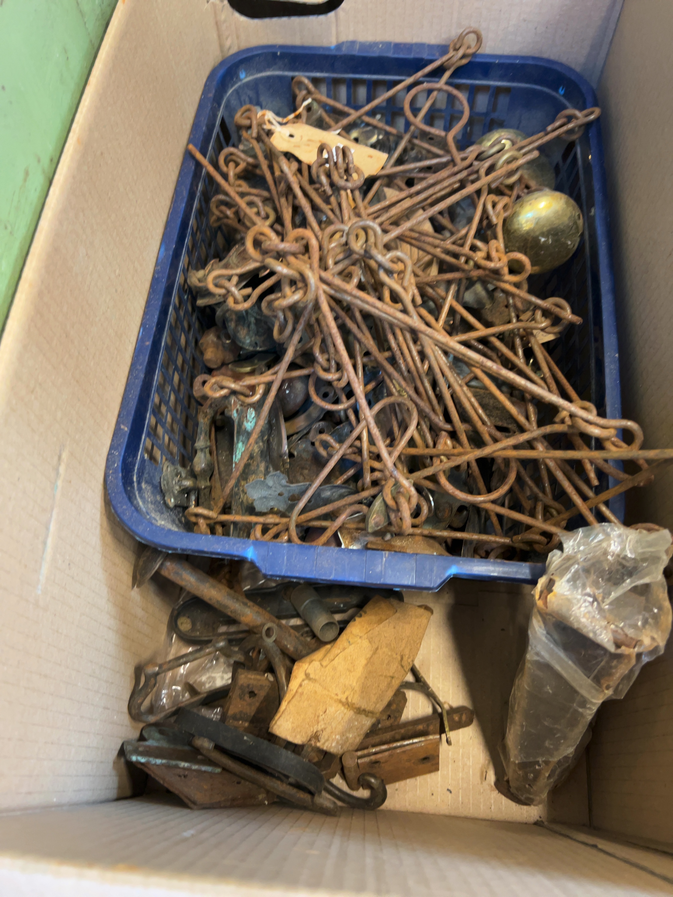 The lot is offered in an uncleaned and unsorted condition as found. Metalwork condition is variable; iron components show heavy oxidation and surface rust, while brass pieces range from a deep aged patina to some with more recent polishing. Many items appear to be individual components or fragments rather than complete sets. Sold as a mixed salvage lot for restoration or parts.