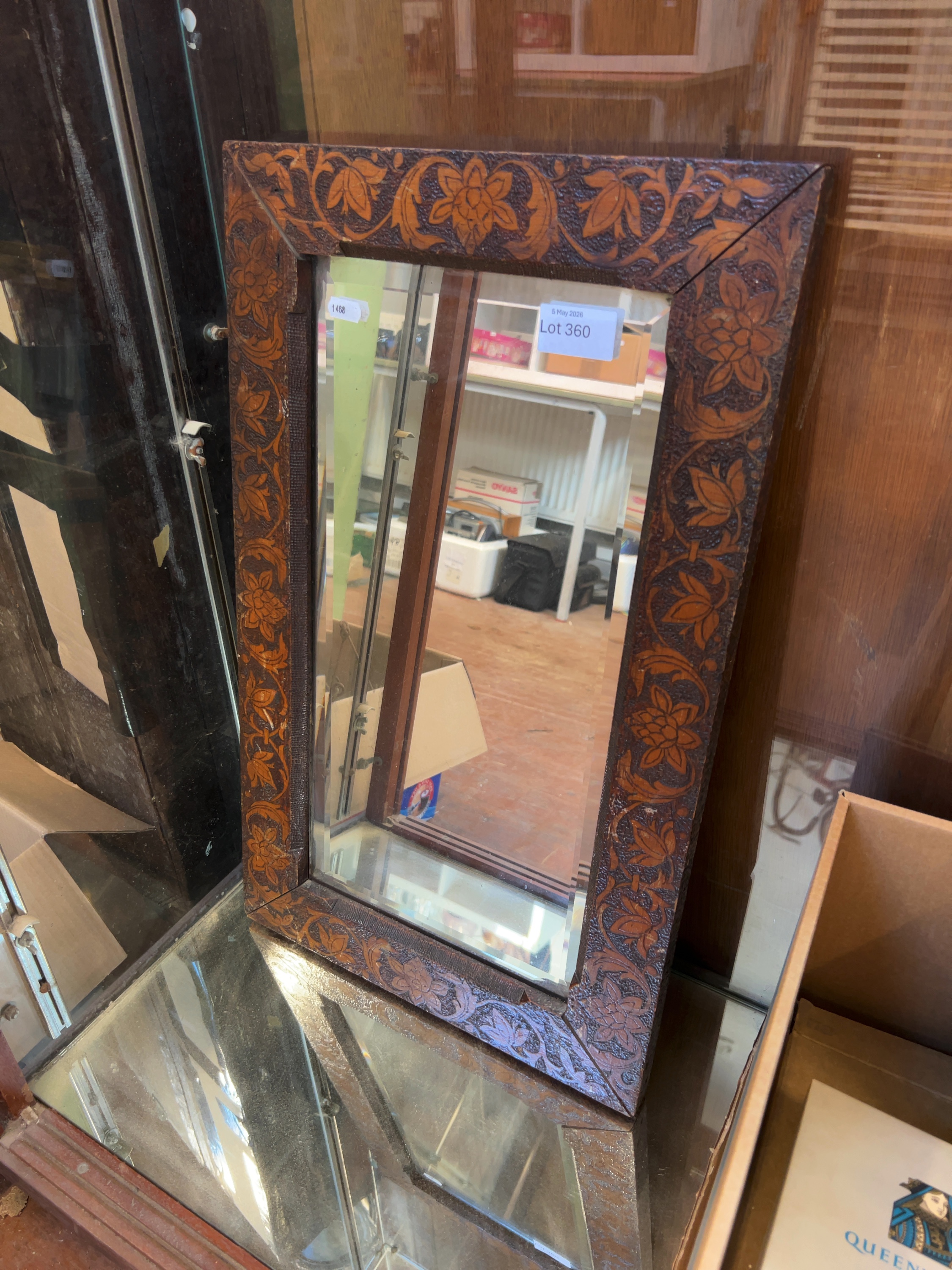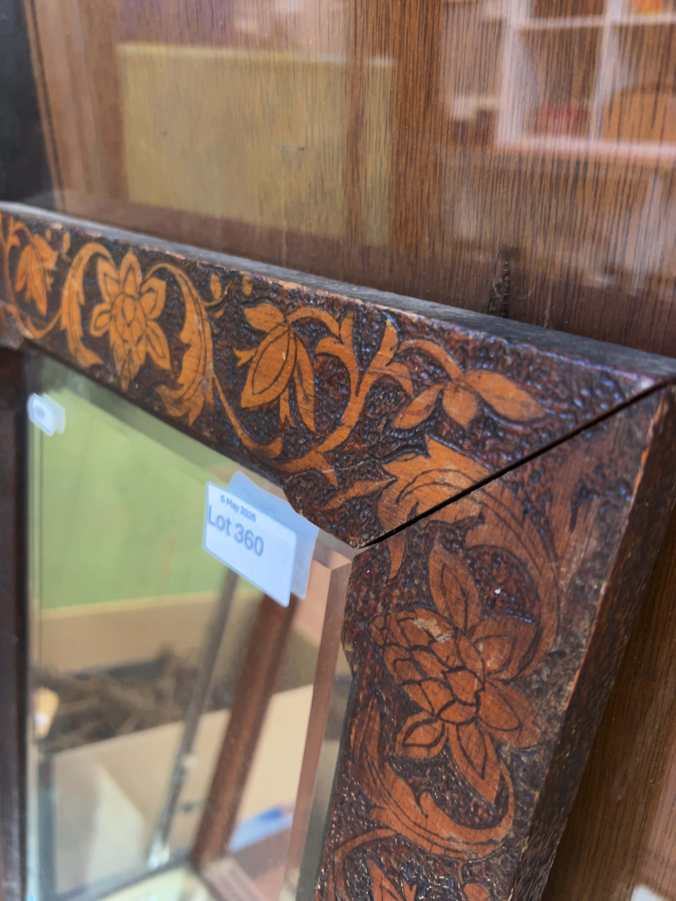 The mirror plate remains in good overall condition with no significant foxing or silvering deterioration apparent. The wooden frame shows typical age-related wear, including minor surface abrasions and slight separation at the mitre joints. The pokerwork decoration remains well-defined.