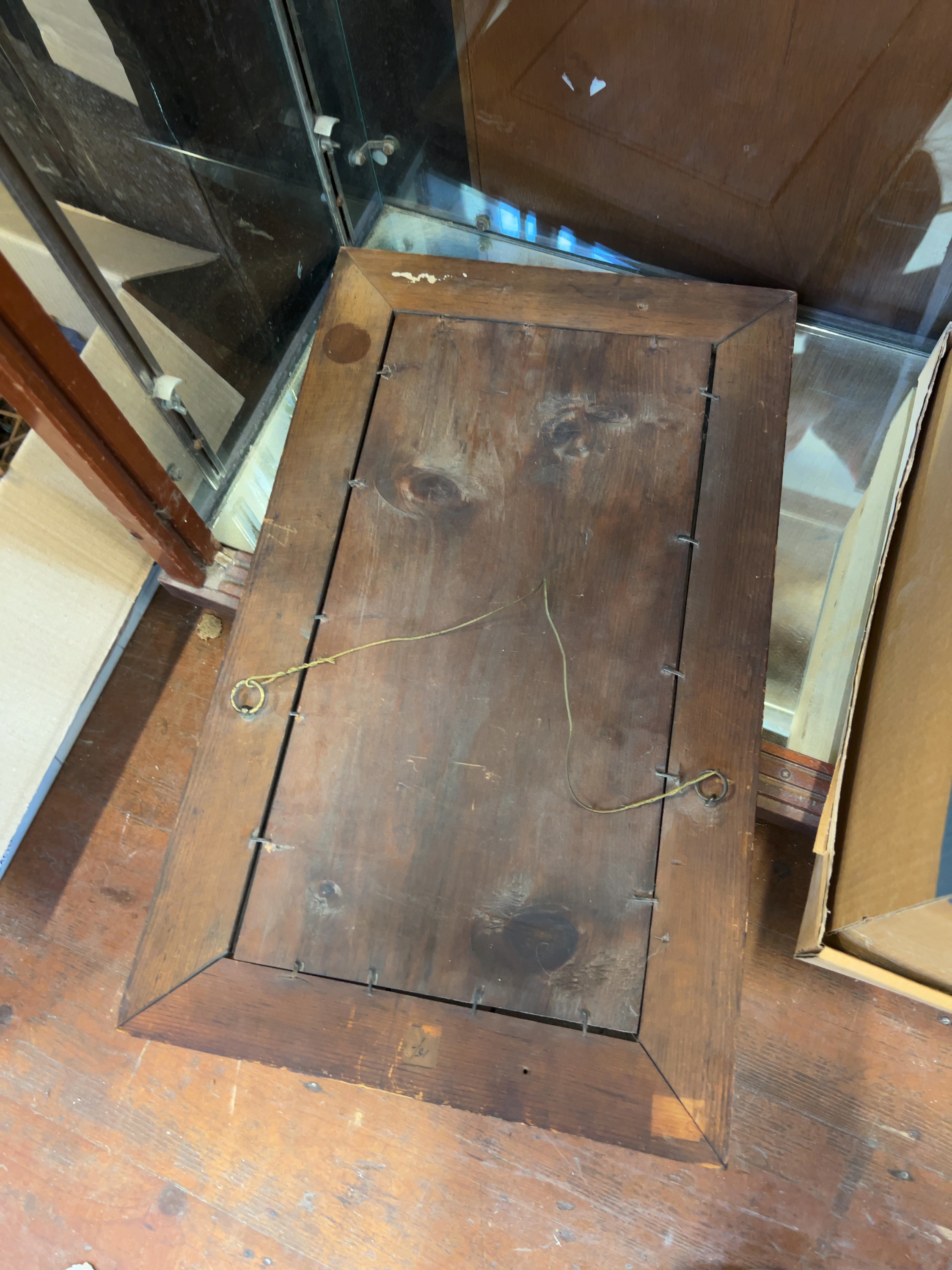 A rectangular wall mirror from the late Victorian or Edwardian period, circa 1900 executed in the Arts and Crafts style. No maker marks or signatures are visible on the piece.