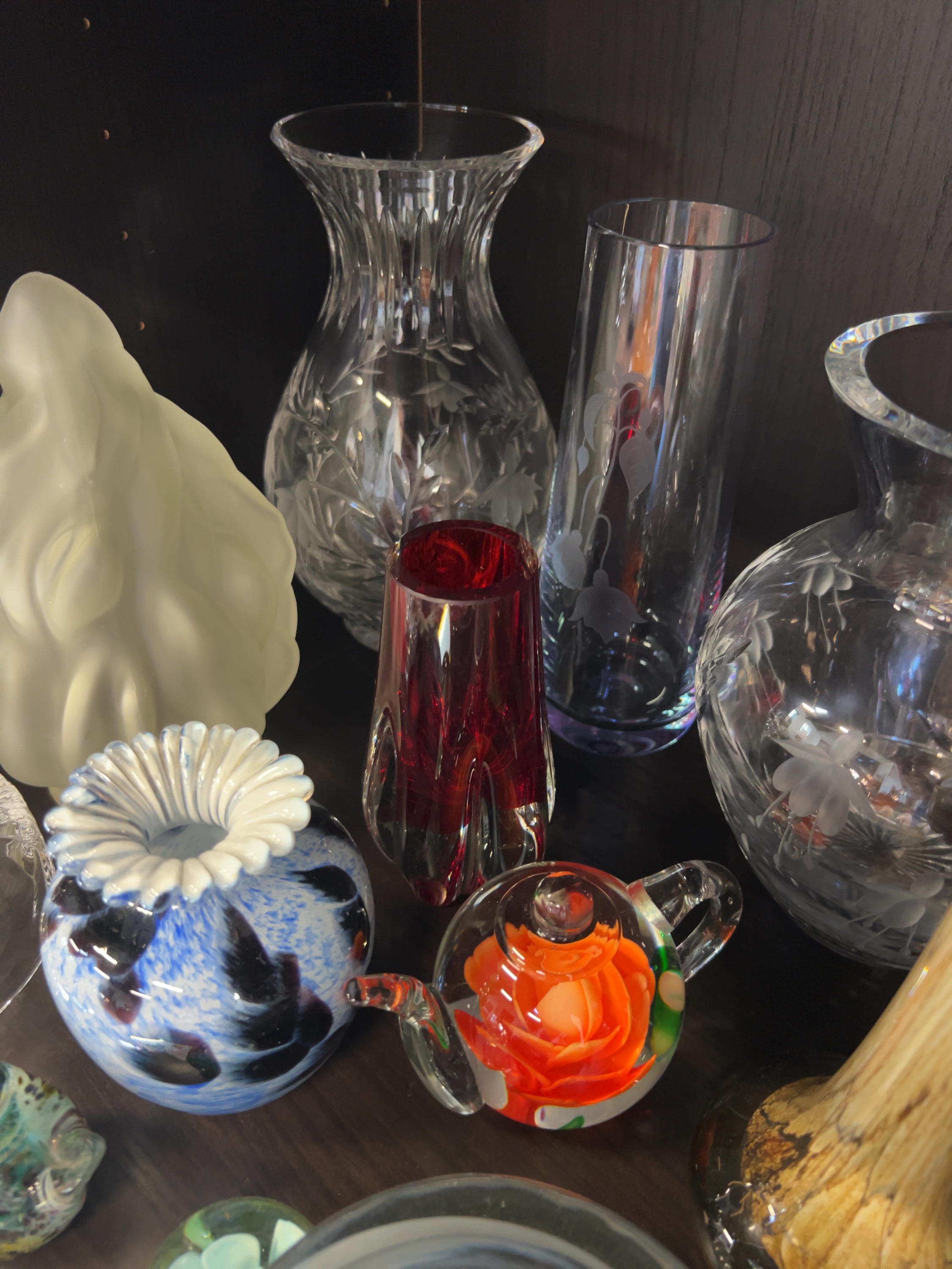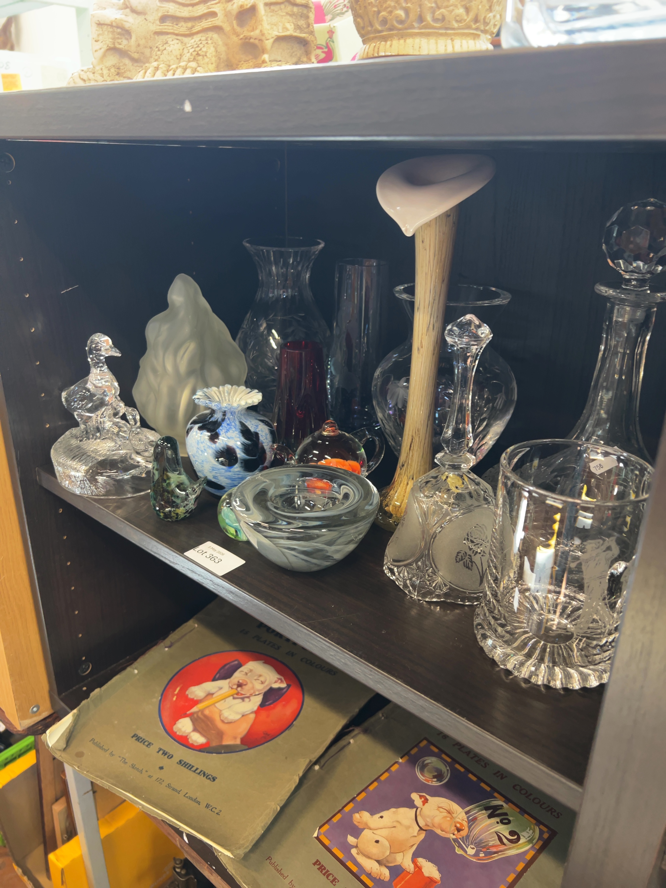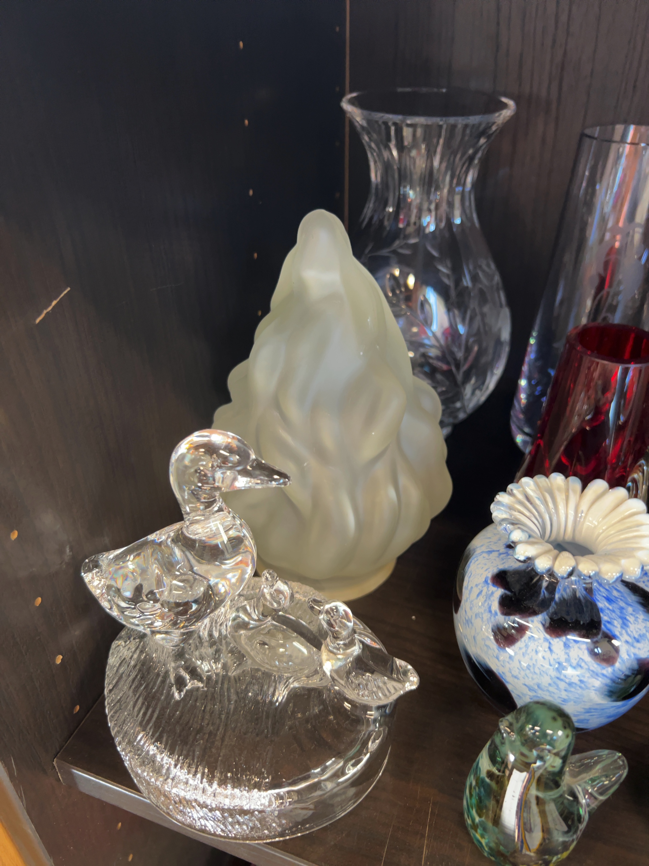 This collection comprises a variety of lead crystal and art glass items. The primary piece is a heavy cut-glass decanter, a clear glass teapot featuring an internal lampwork rose, a frosted glass sculptural piece in a stylized flame form, and a clear glass duck figurine. Also present is an etched glass bell and a heavy clear glass tankard depicting a golfer in mid-swing. No etched manufacturer marks or signatures were observed on the items.