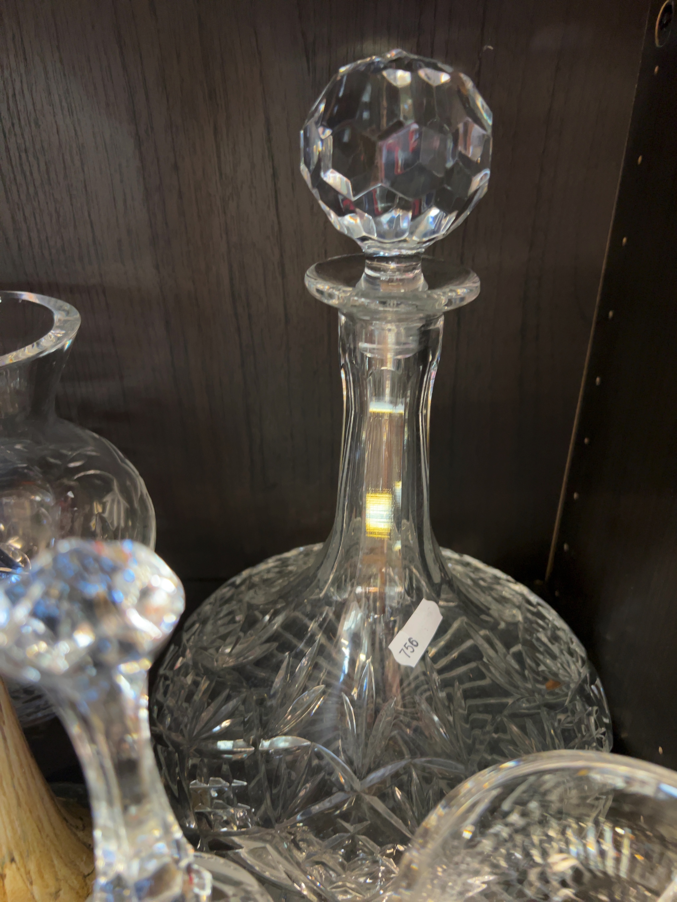 The glassware generally appears to be in good condition. The cut-glass decanter is bright and clear with no visible evidence of internal clouding or sickness, and no significant chips were noted on the rim or the deep cutting. The stopper appears to be a correct fit. Other items in the lot show no obvious major damage such as large cracks or losses, although minor surface wear consistent with age and handling may be present.