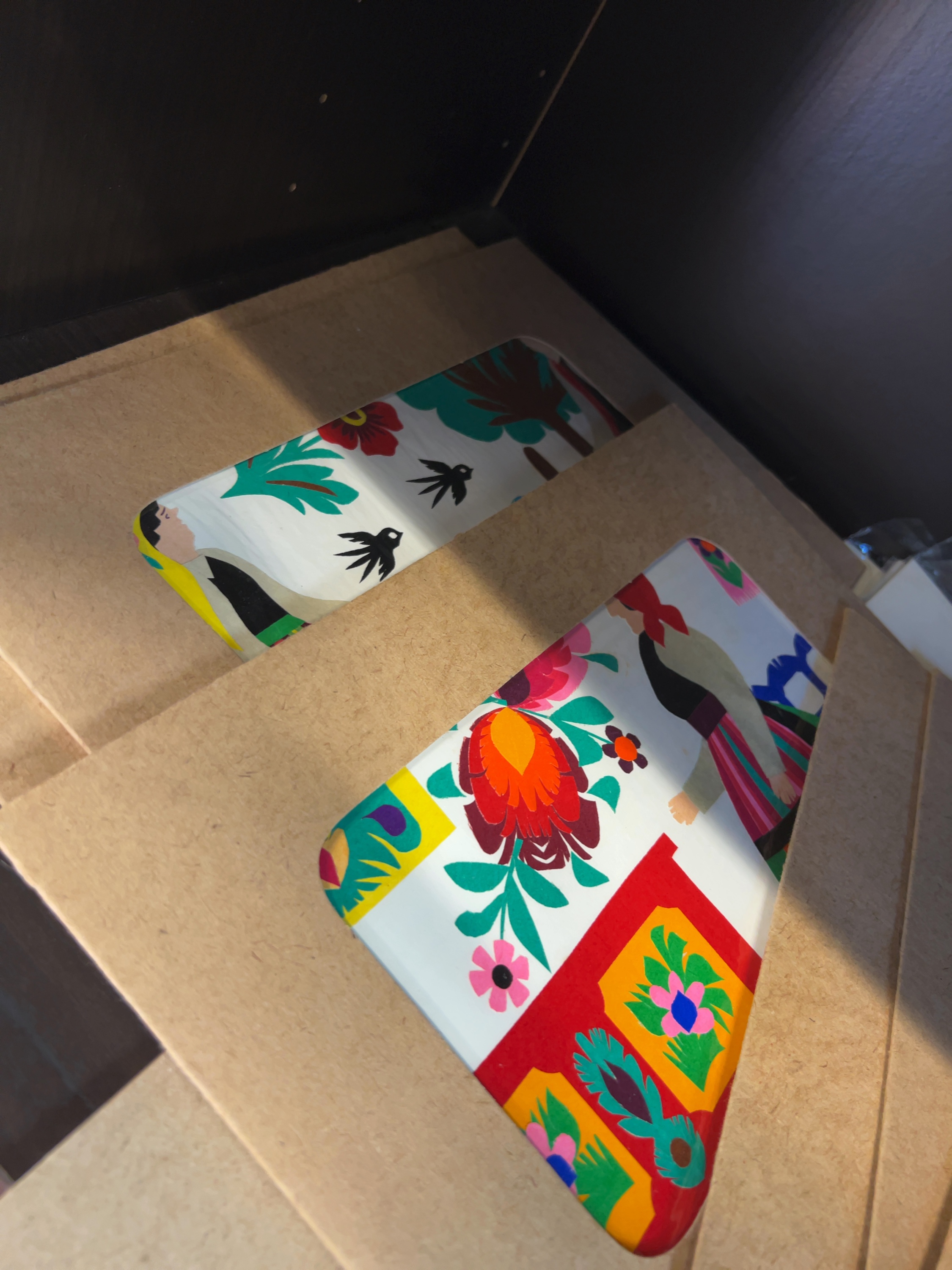 The paper cutouts are in good, vibrant condition. The brown card mounts show some light edge wear and exhibit scattered foxing and brown age-related spotting, which is particularly visible on the mount for the circular piece. The two contemporary prints appear to be in very good condition and are currently housed in clear plastic protective sleeves.