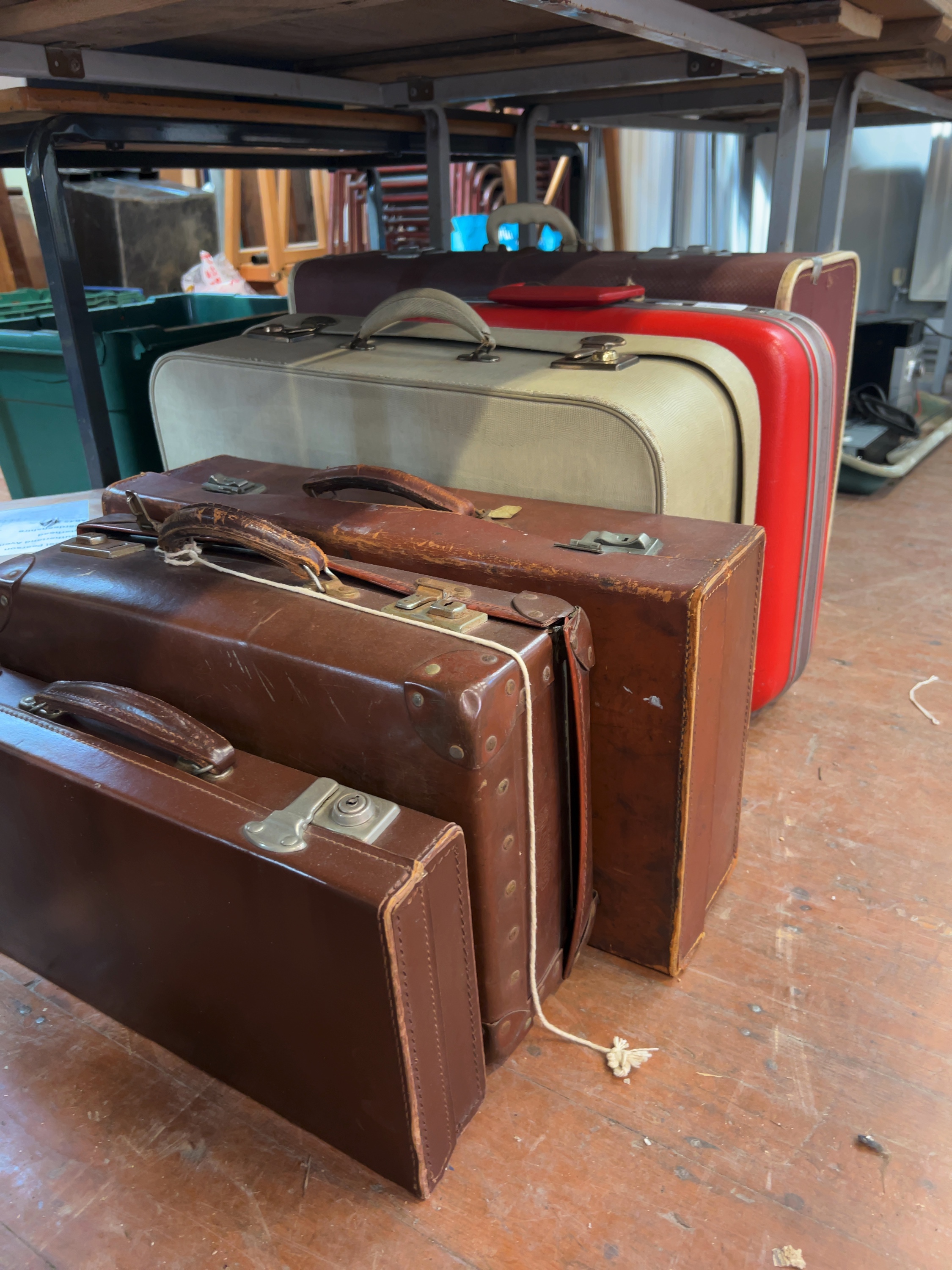 This assortment of vintage hard-sided luggage comprises various styles and materials representative of mid-20th-century travel.