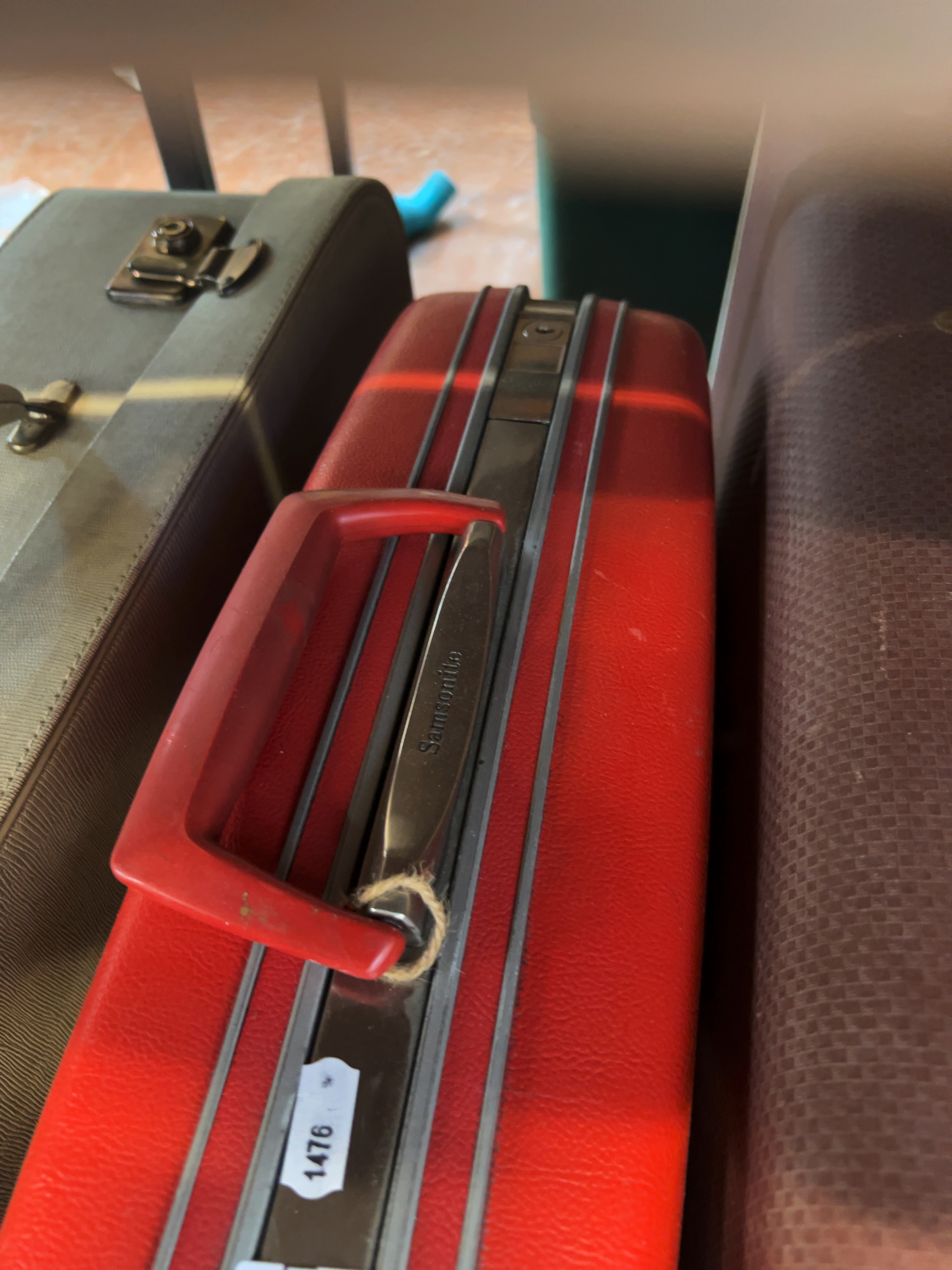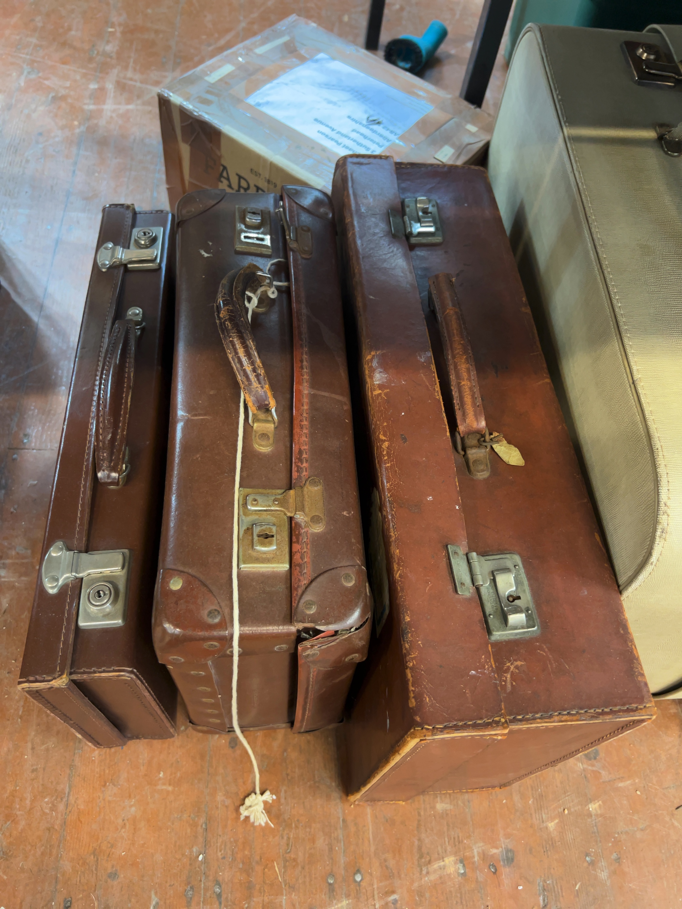 The items exhibit a range of vintage conditions from moderate wear to heavy patination. Several of the traditional brown cases show significant surface scuffing, abrasions, and structural wear, with one case currently secured by string. The Samsonite and beige cases show surface marks and scuffs consistent with age and use. Hardware throughout the collection shows varying degrees of tarnishing, surface oxidation, and scratching. Internal linings have not been fully inspected. Sold as-is.