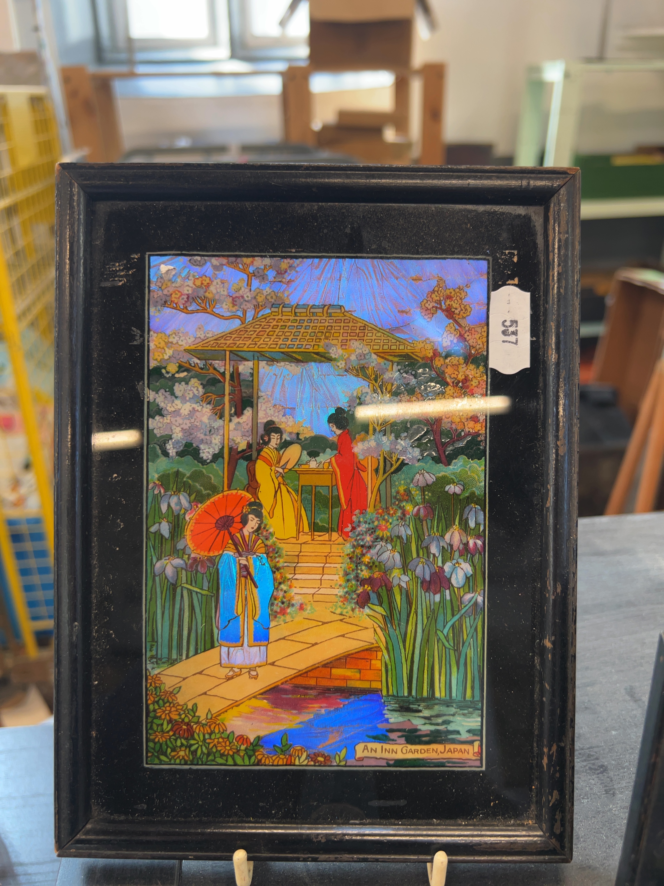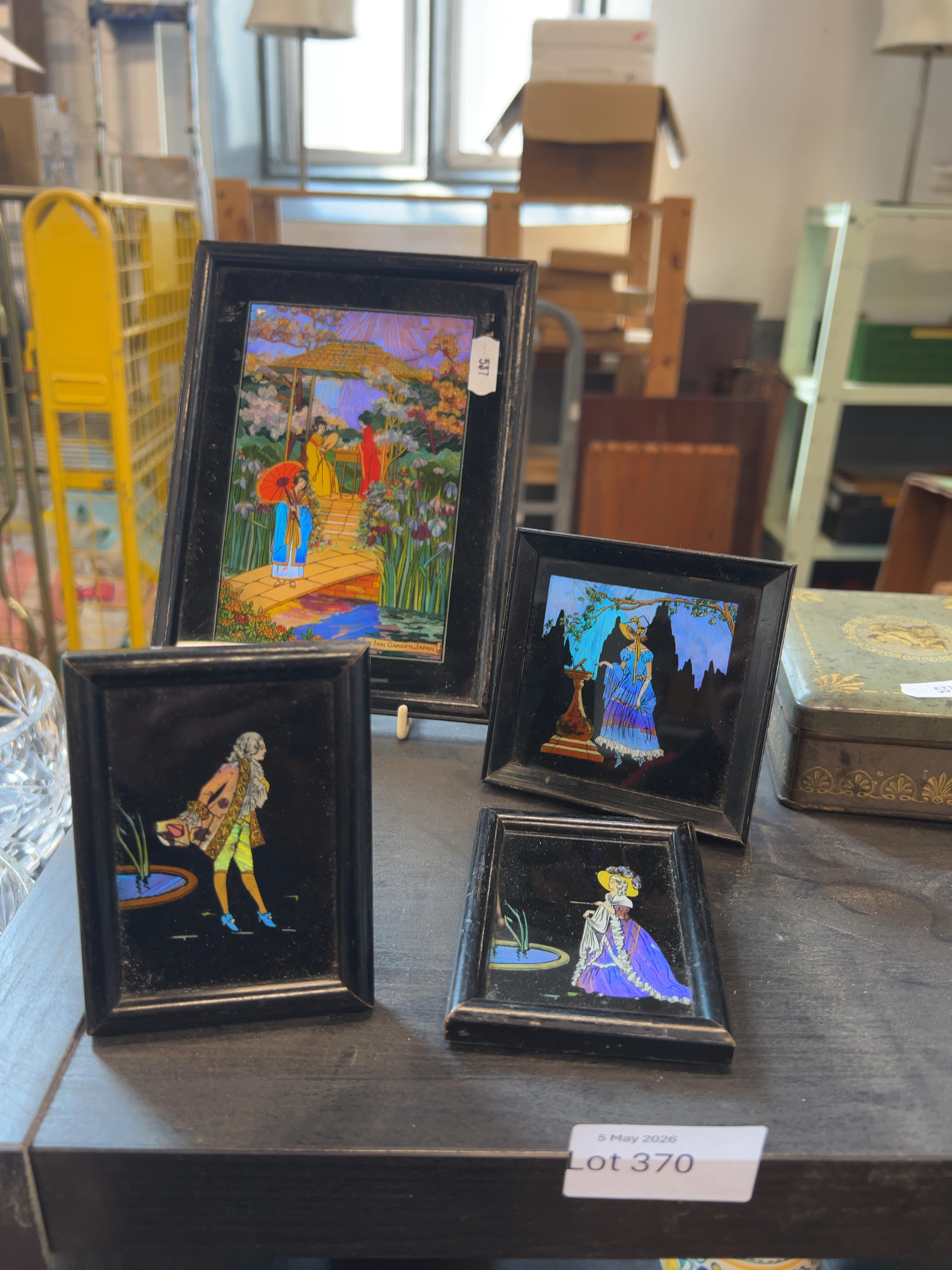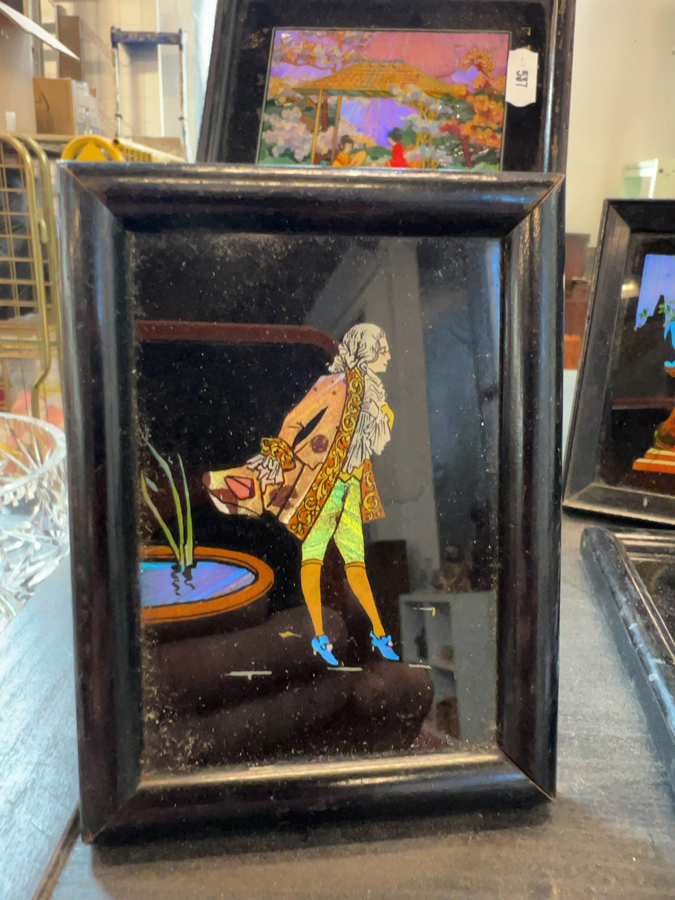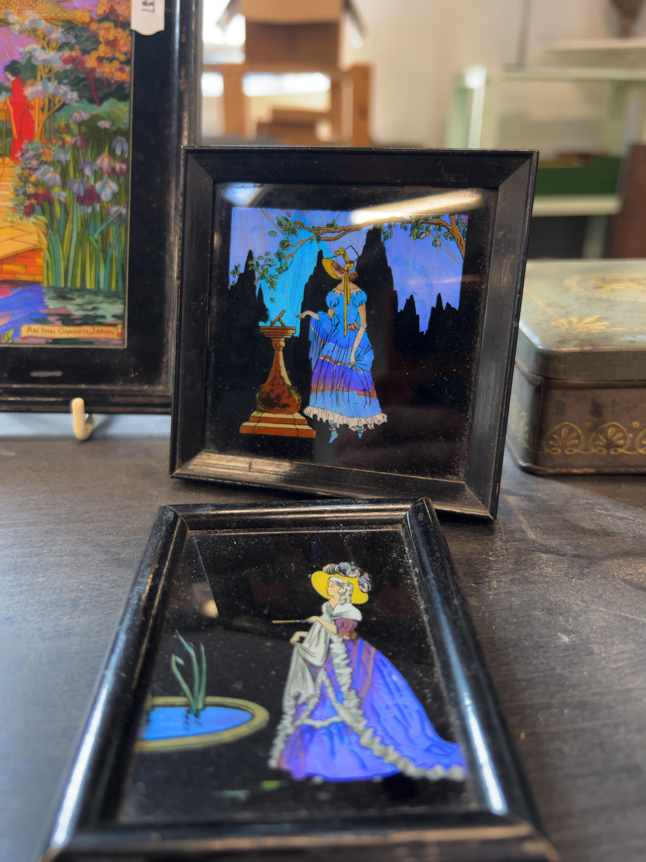 The collection shows signs of age-appropriate wear. There is surface dust and minor scuffing to the wooden frames. The larger picture has a significant crack across the easel-style cardboard backing. The reverse-painted glass and butterfly wing sections appear stable and well-preserved.