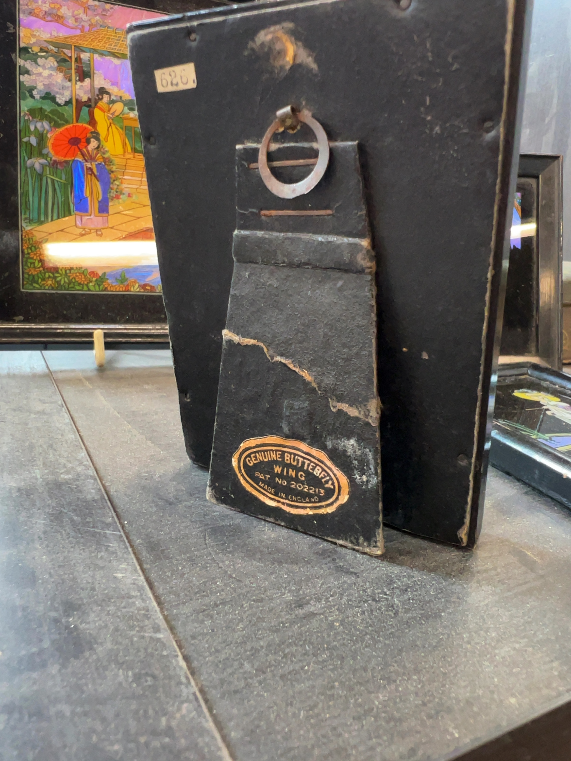 A collection of Art Deco style reverse-painted glass pictures featuring backgrounds of genuine butterfly wing, set within black-painted wooden frames. One item retains an original paper label on the reverse with the inscription GENUINE BUTTERFLY WING, PAT NO 202213, and MADE IN ENGLAND.