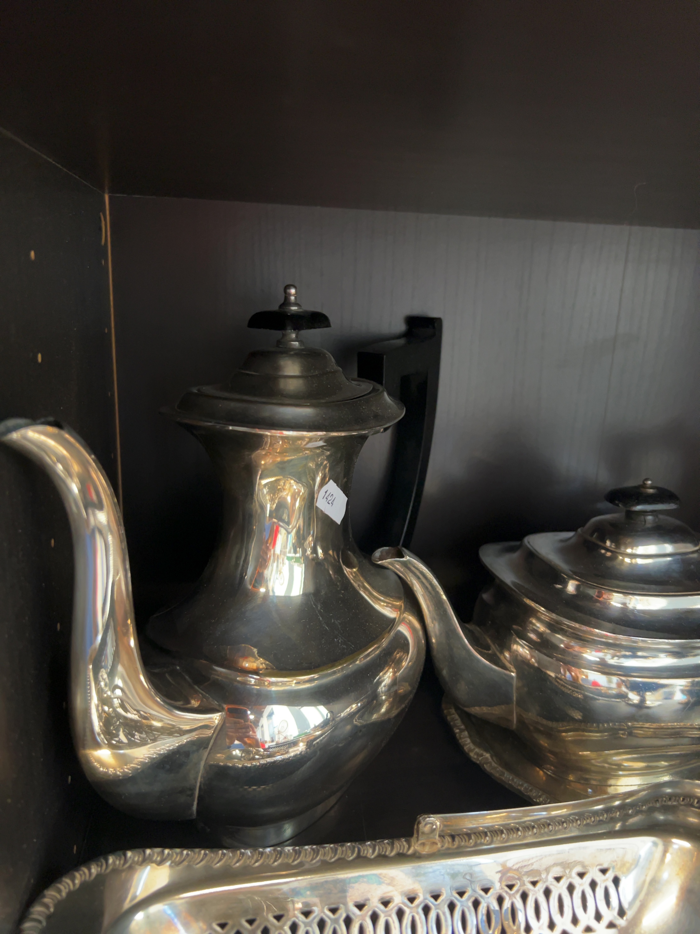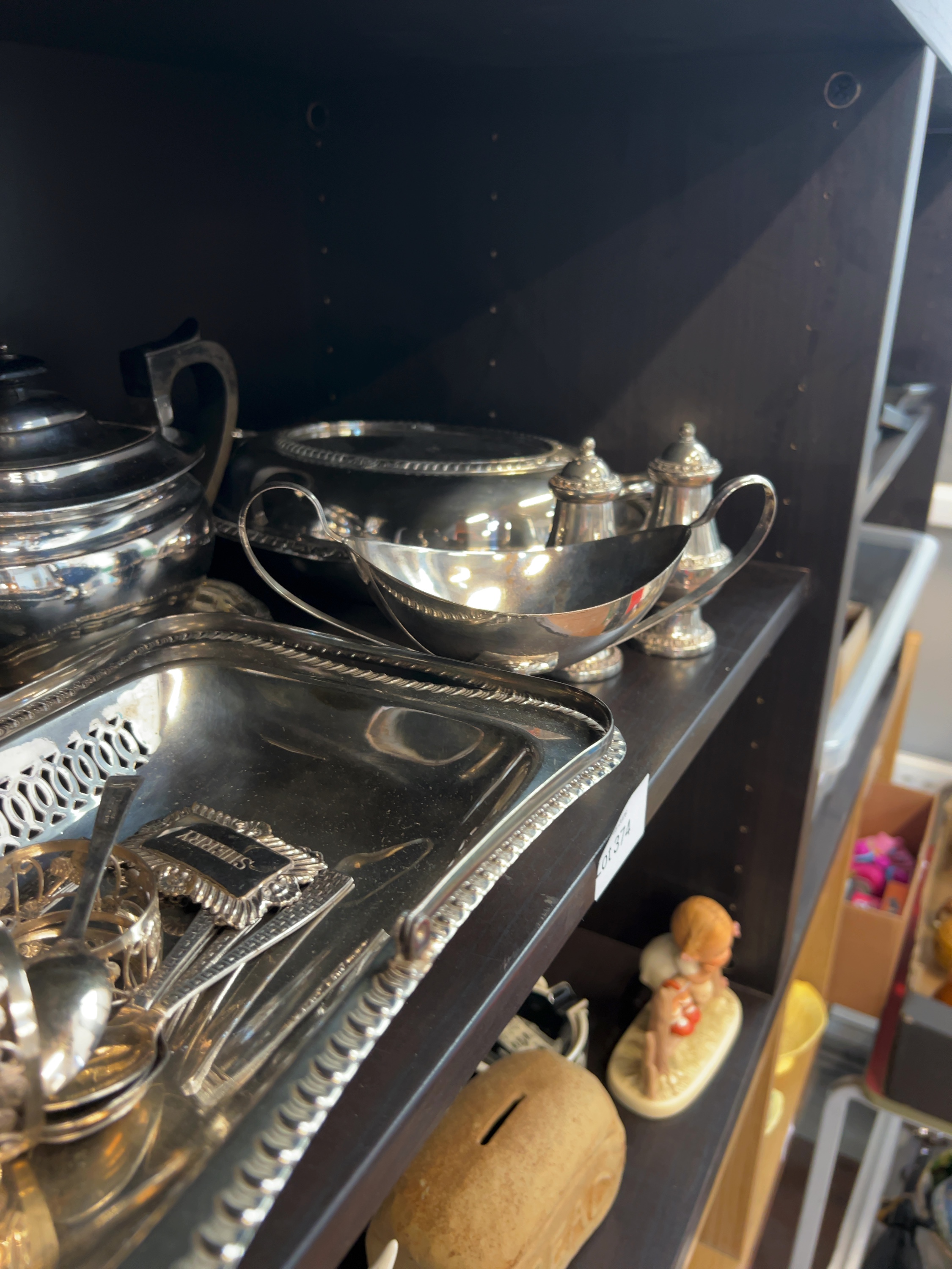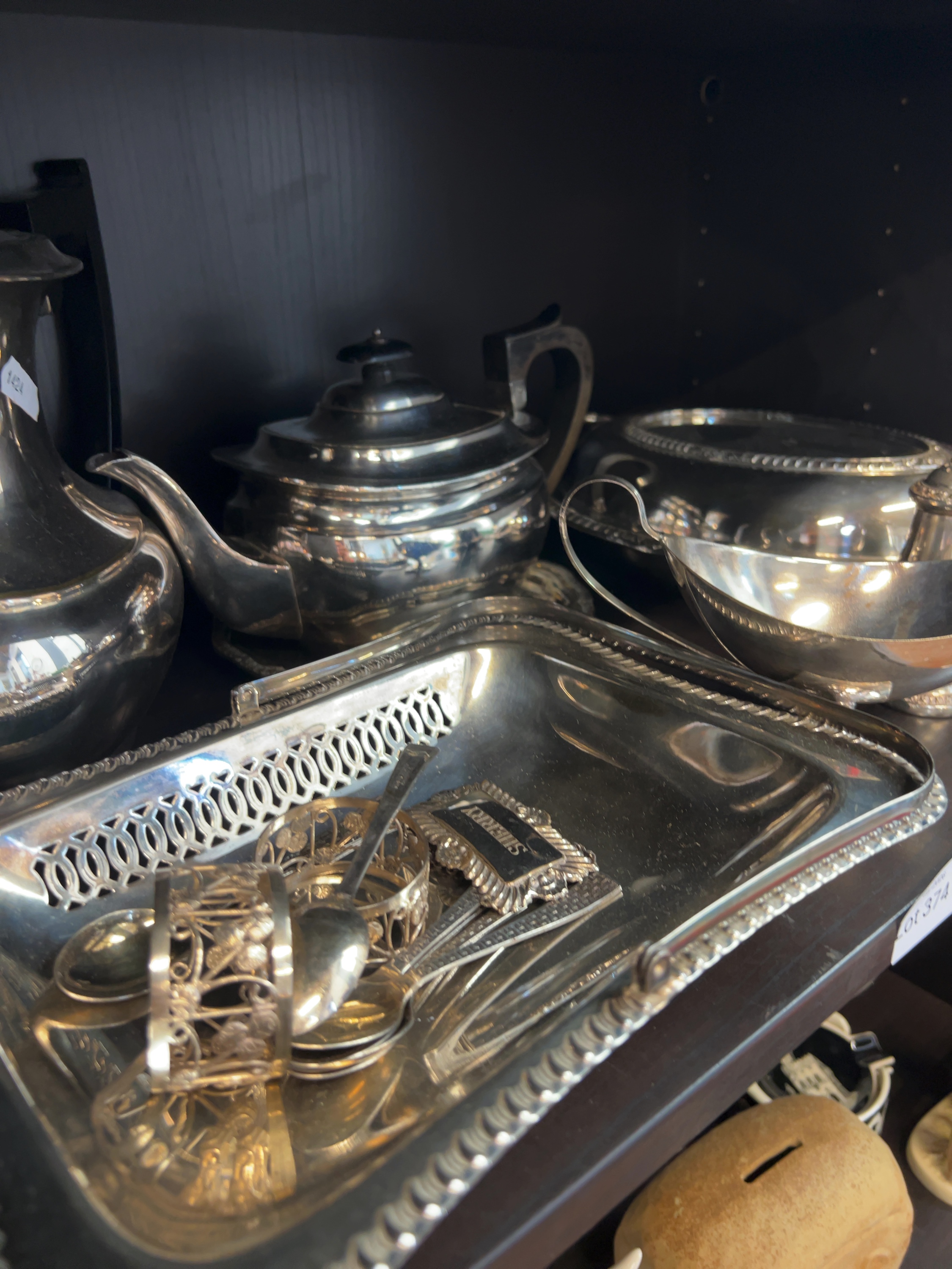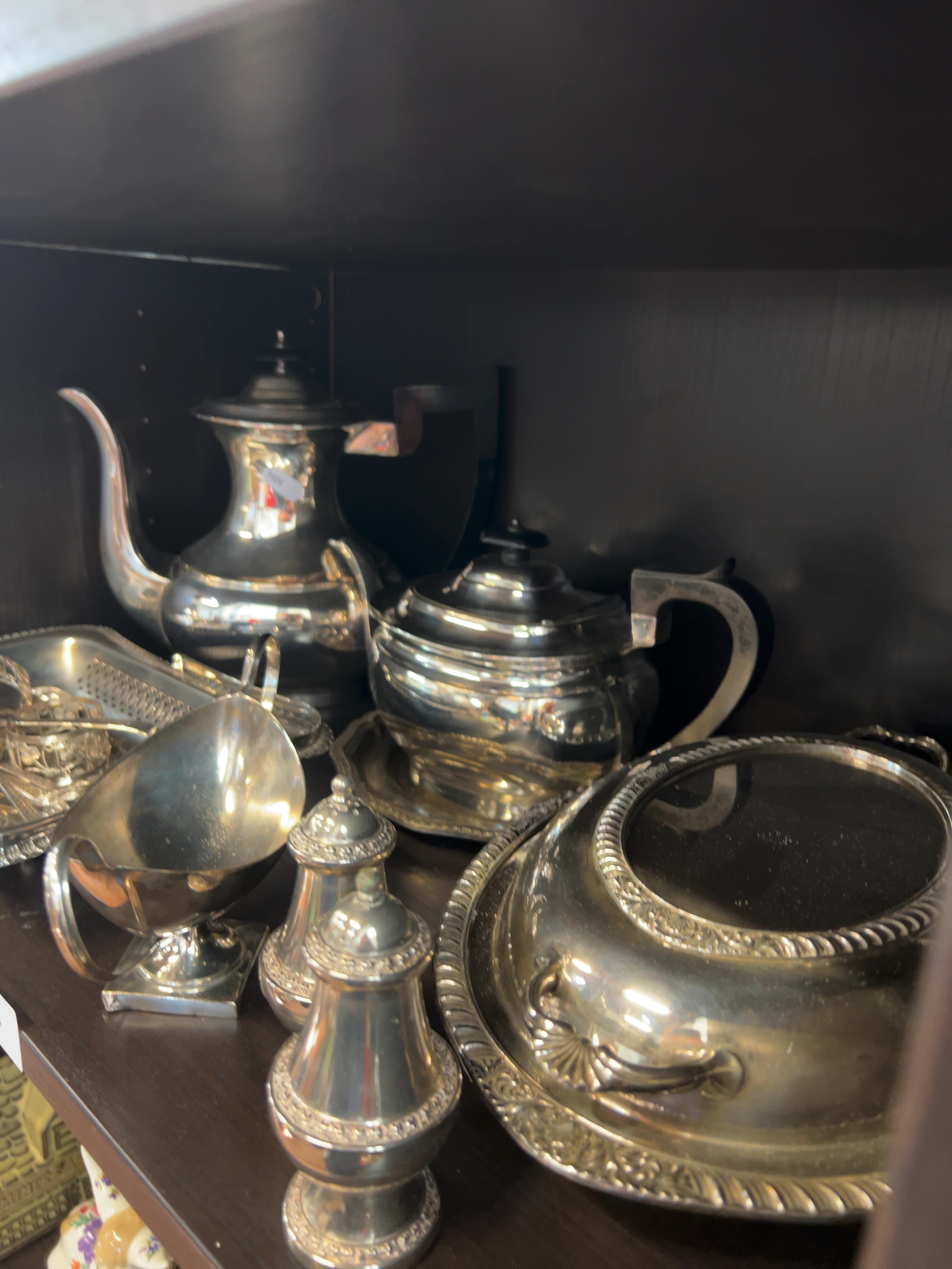 A collection of silver-plated tableware and decorative objects, predominantly of electroplated nickel silver (EPNS) construction. The assortment includes a tall coffee pot, a teapot with ebonised fittings, a circular lidded vegetable dish, a double-lipped sauce boat, and a pair of baluster-shaped salt and pepper shakers. Also included is a rectangular gallery tray containing several napkin rings, assorted spoons, and a rectangular decanter label inscribed SHERRY. No hallmarks or maker’s marks are visible in the provided images.