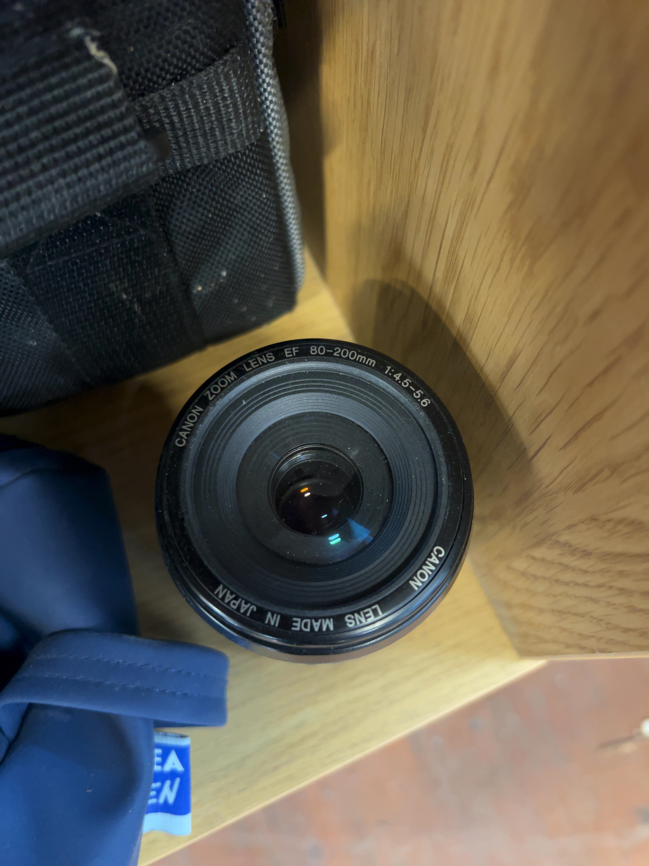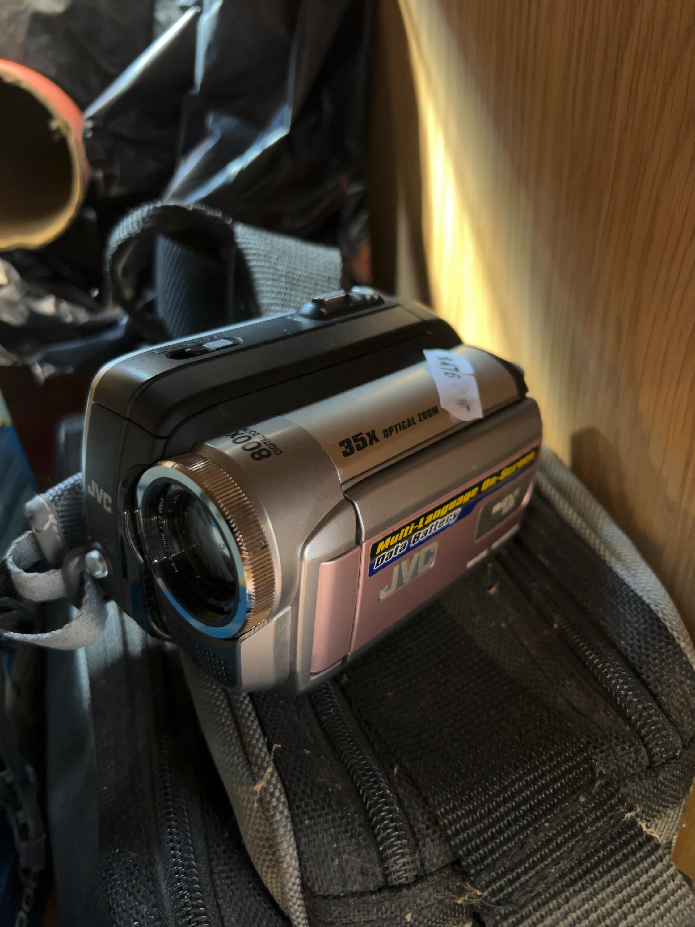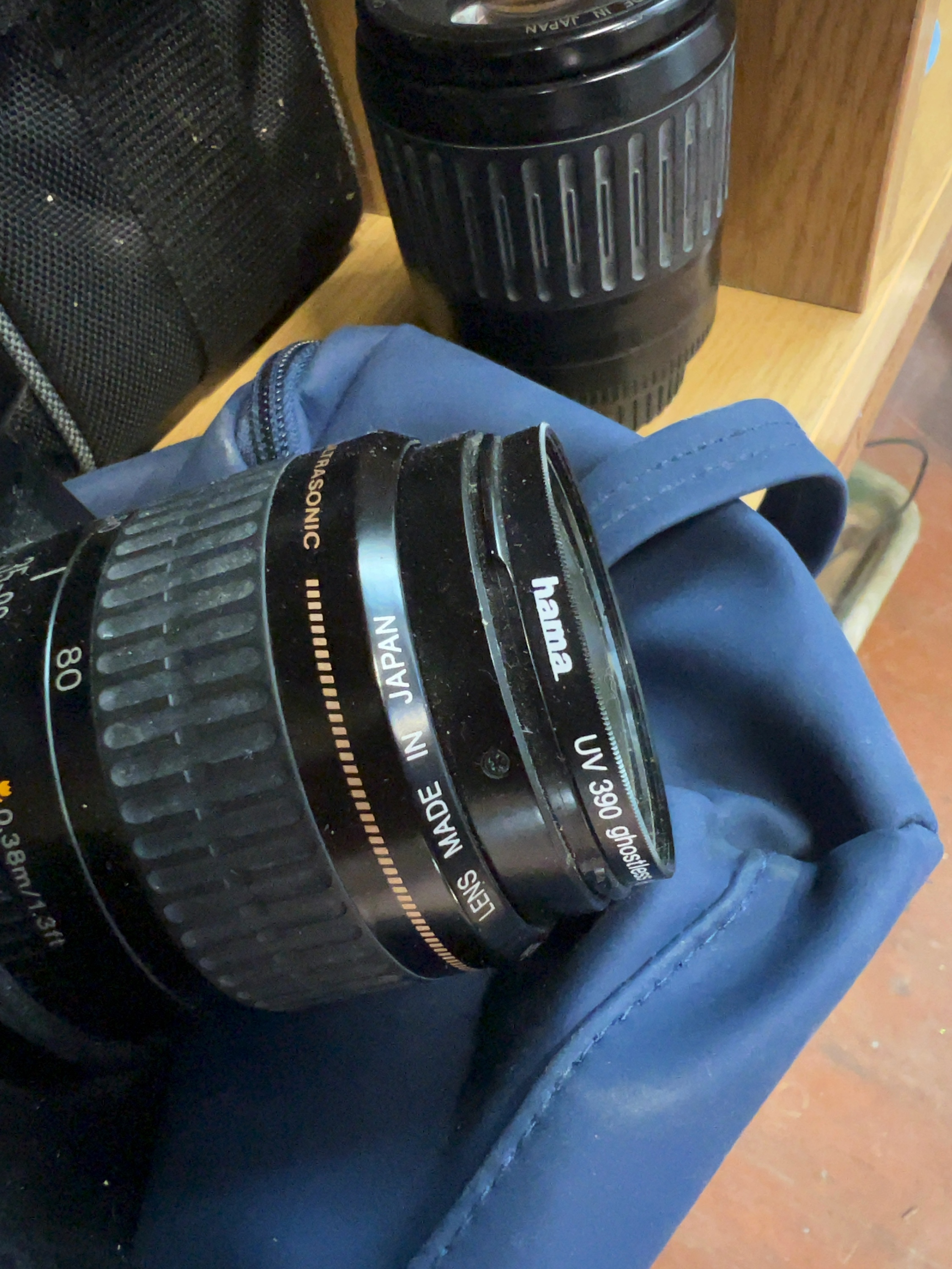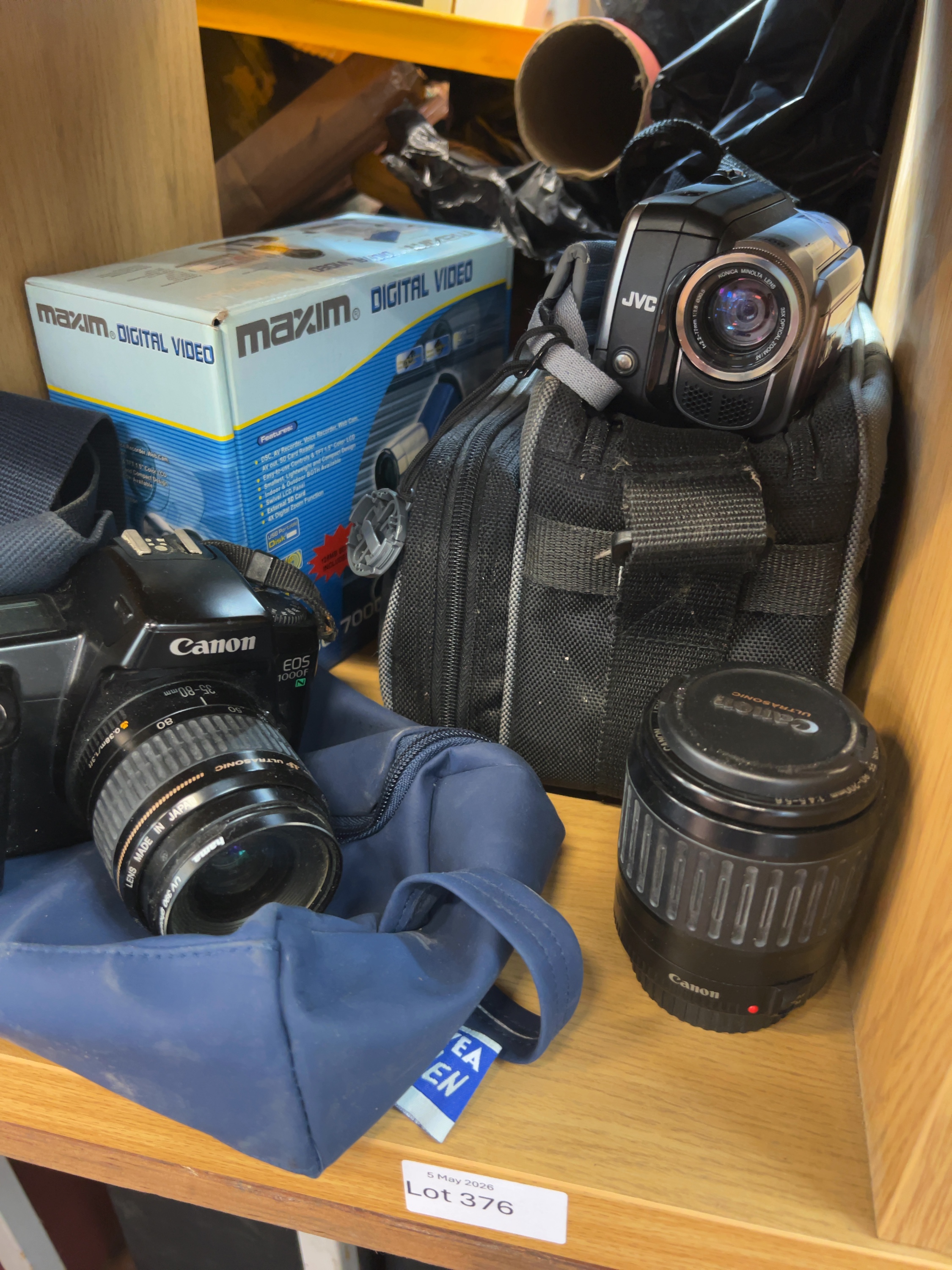An assortment of photographic and video equipment. The collection includes a Canon EOS 1000N 35mm SLR film camera with a black polycarbonate body. Attached is a Canon EF 35-80mm f/4-5.6 III Zoom Lens featuring gold Ultrasonic lettering, marked Lens Made in Japan and fitted with a Hama UV 390 ghostless filter. Also included is a Canon EF 80-200mm f/4.5-5.6 Zoom Lens, marked Canon Zoom Lens EF 80-200mm 1:4.5-5.6 and Lens Made in Japan. Video equipment comprises a JVC compact digital camcorder with a silver and pink-toned body, marked with 35x optical zoom and 800x digital zoom. A Maxim Digital Video camera is present in its original retail box, which lists features including a 1.5 inch colour LCD and SD card reader.