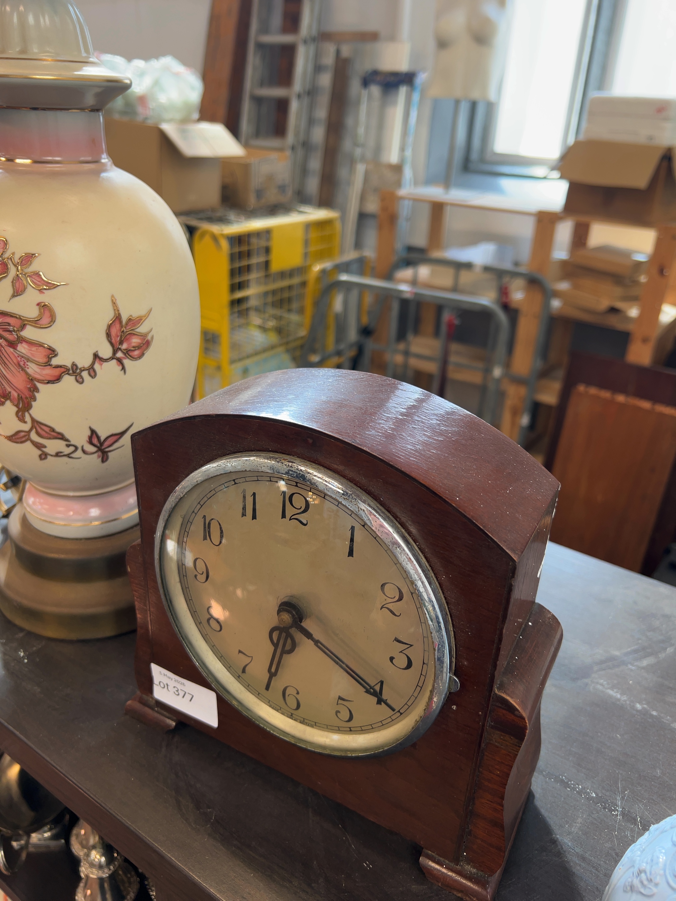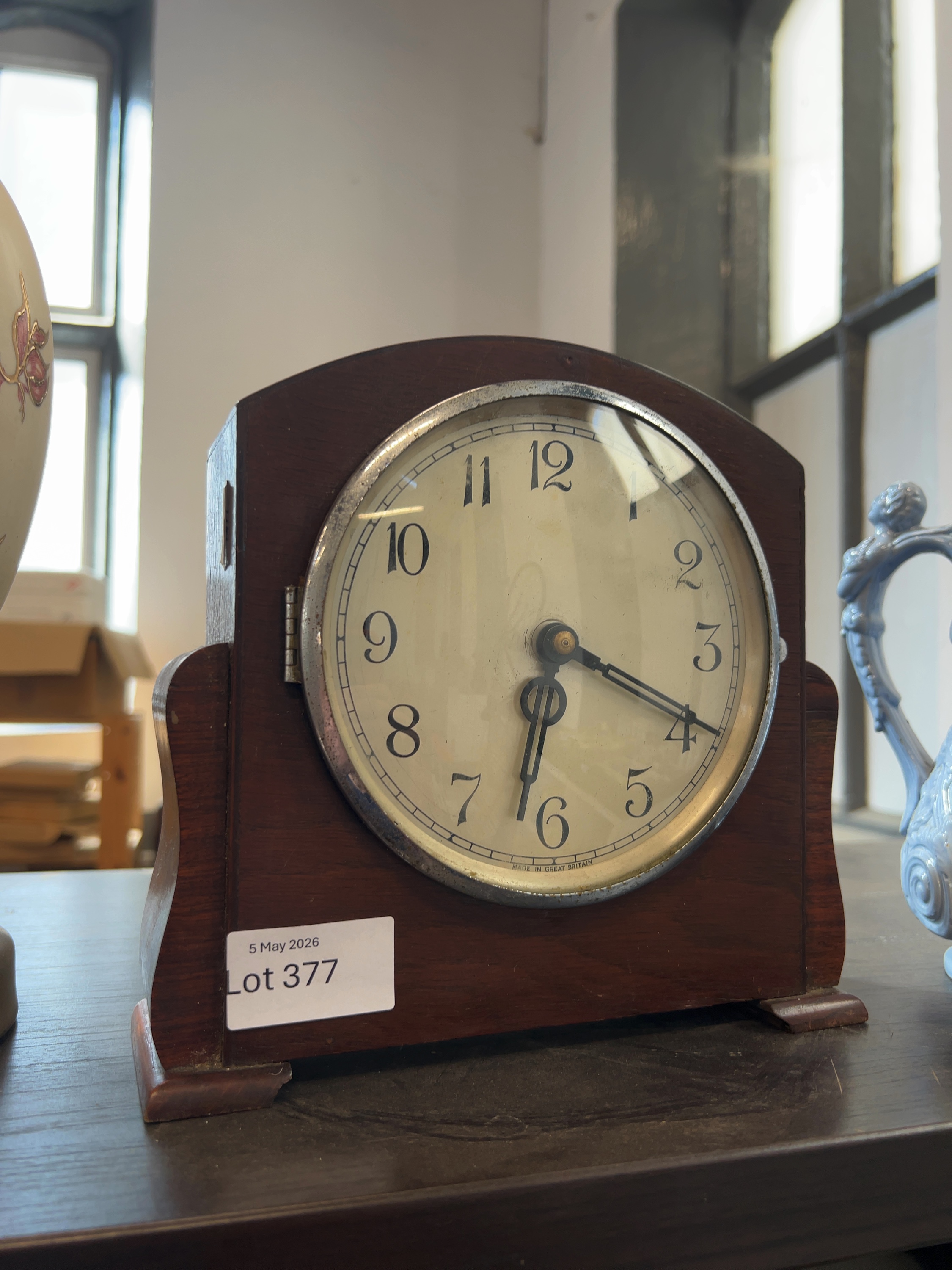 The wooden case shows minor surface wear, scuffs, and age-related marks throughout. The dial and hands are in good order, with some light tarnishing to the chrome bezel. The internal movement appears complete, though it remains untested for timekeeping or striking functionality.