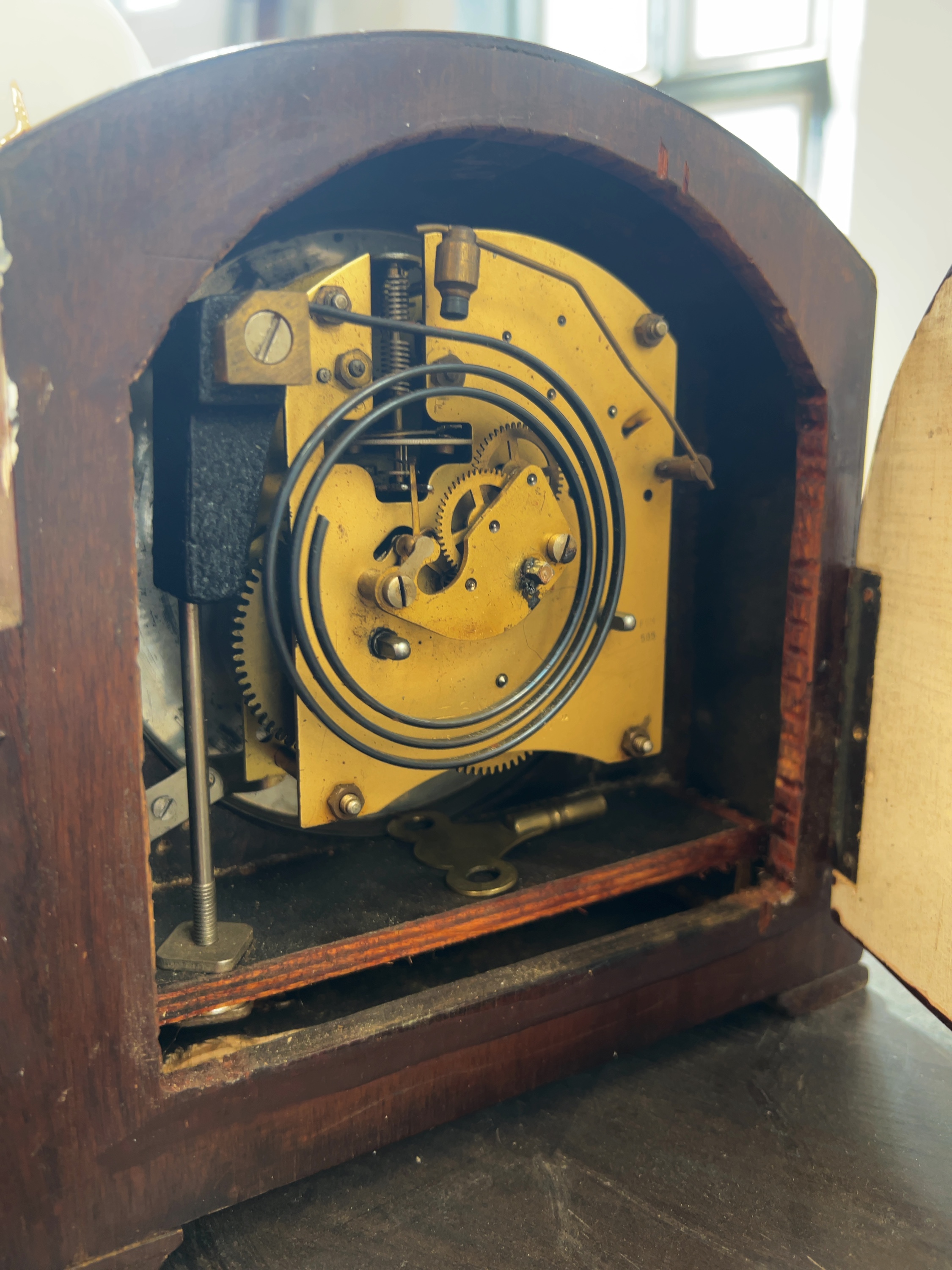 A mid-20th century mantel clock housed in a dark-stained wood case with a characteristic Napoleon hat profile and stepped base. A brass winding key is included.