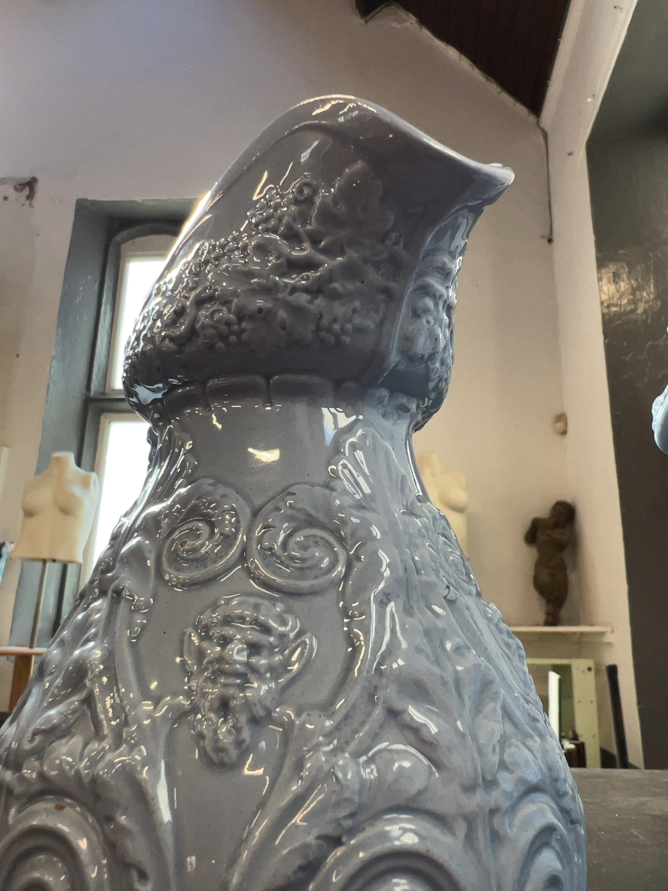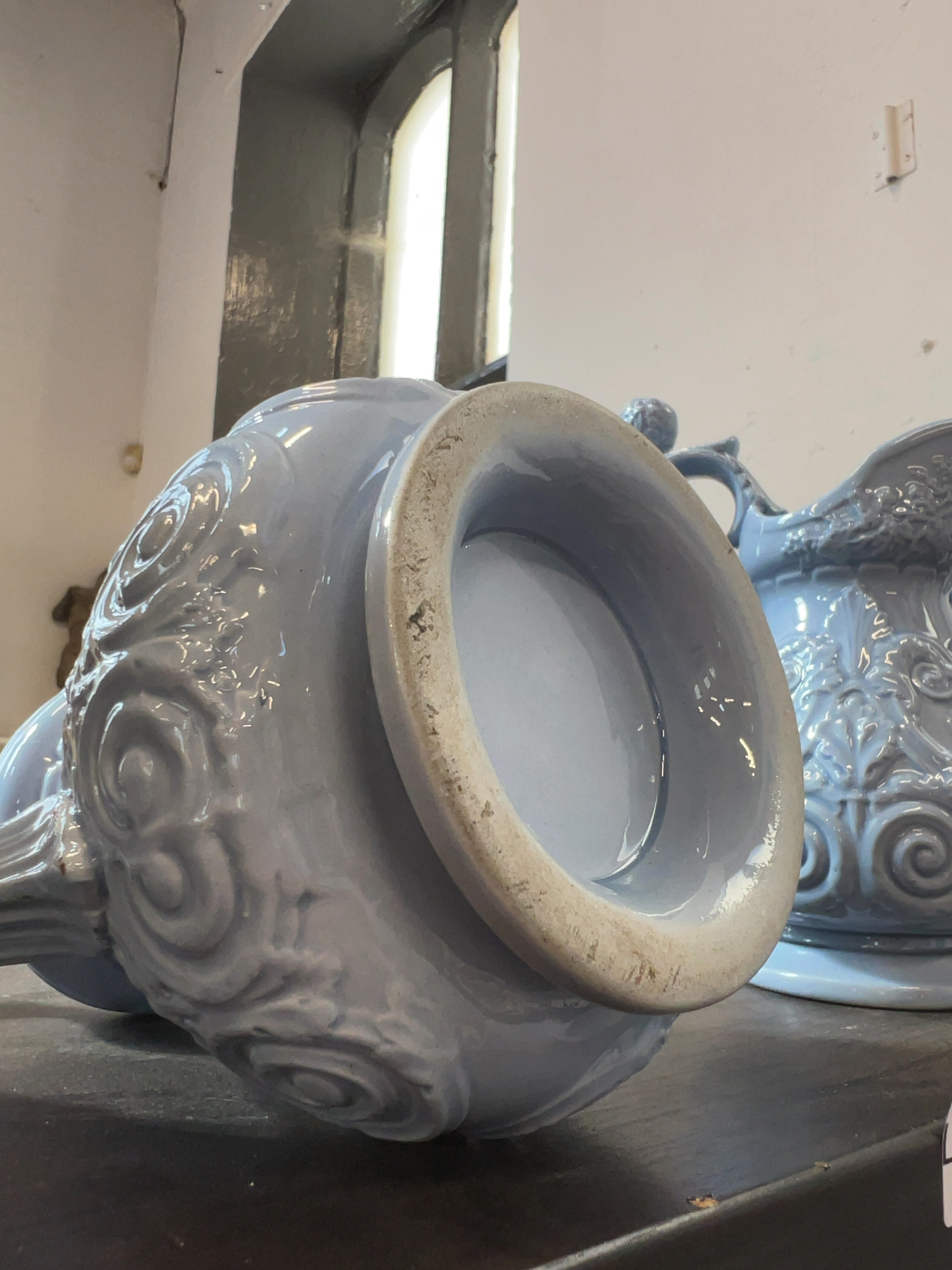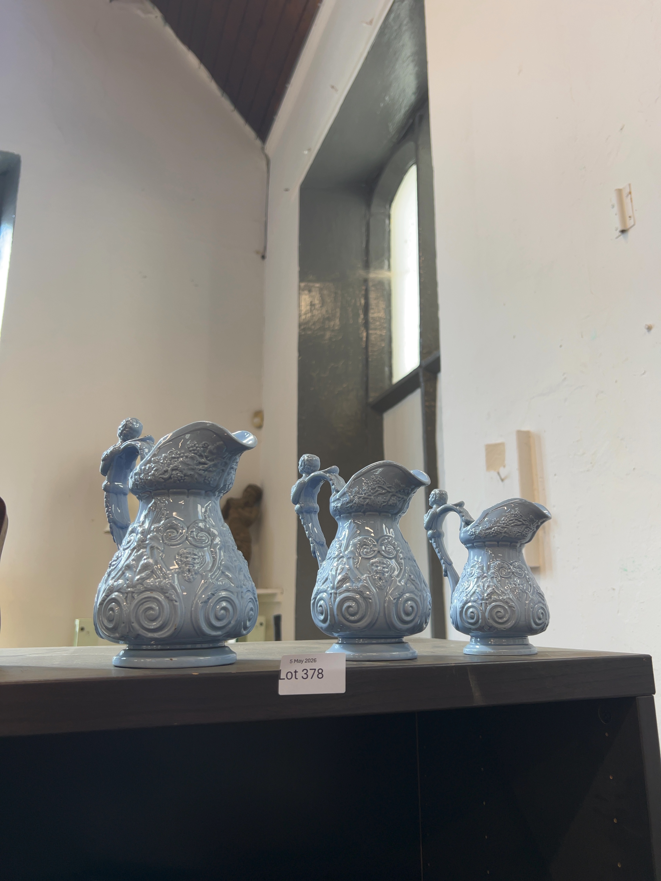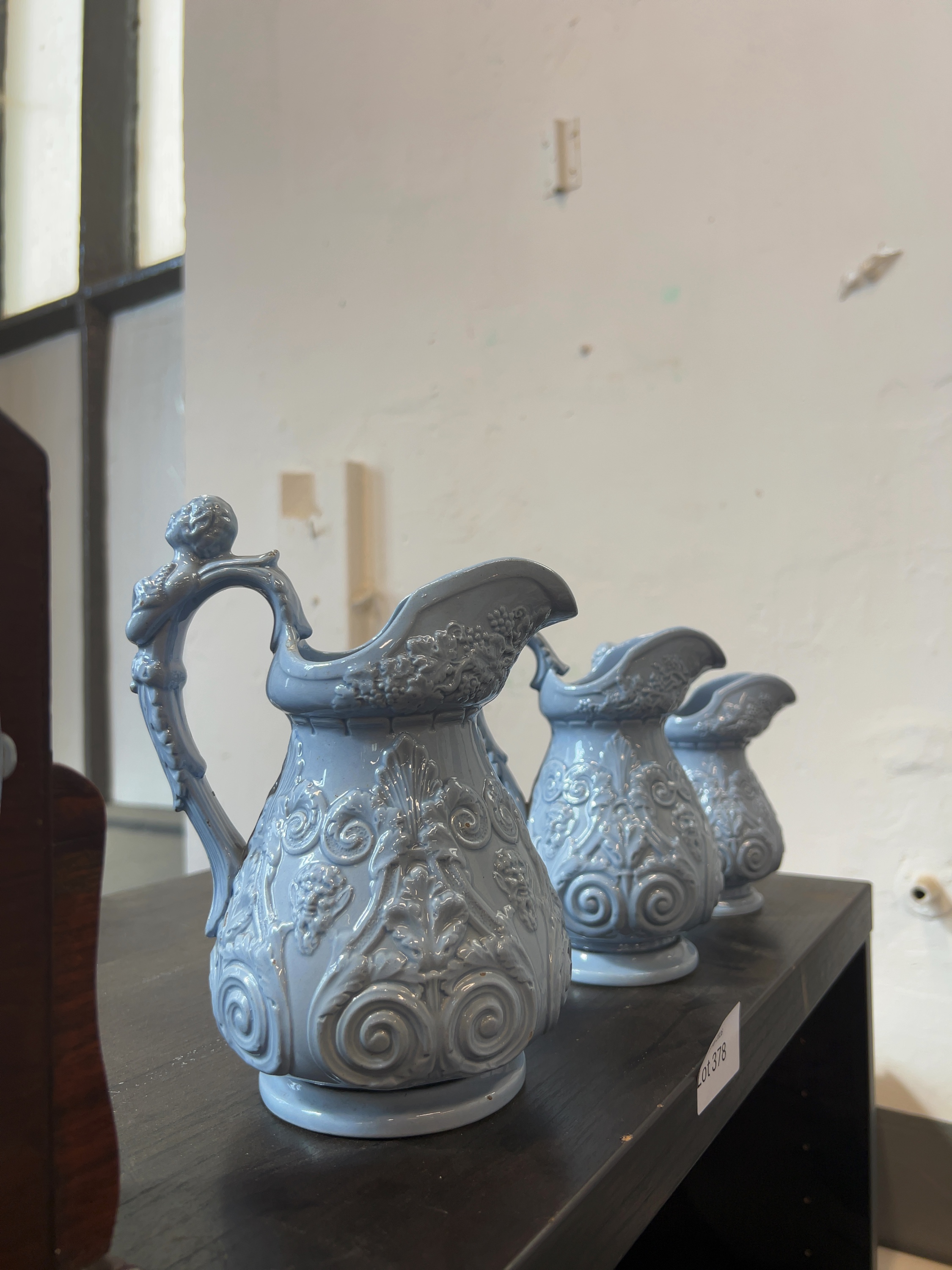 A graduated trio of Victorian relief-moulded ceramic jugs, dating to the mid-19th century. The jugs are finished in a monochromatic glossy pale blue glaze over a white earthenware or stoneware body. No maker marks or factory stamps are visible on the unglazed undersides.