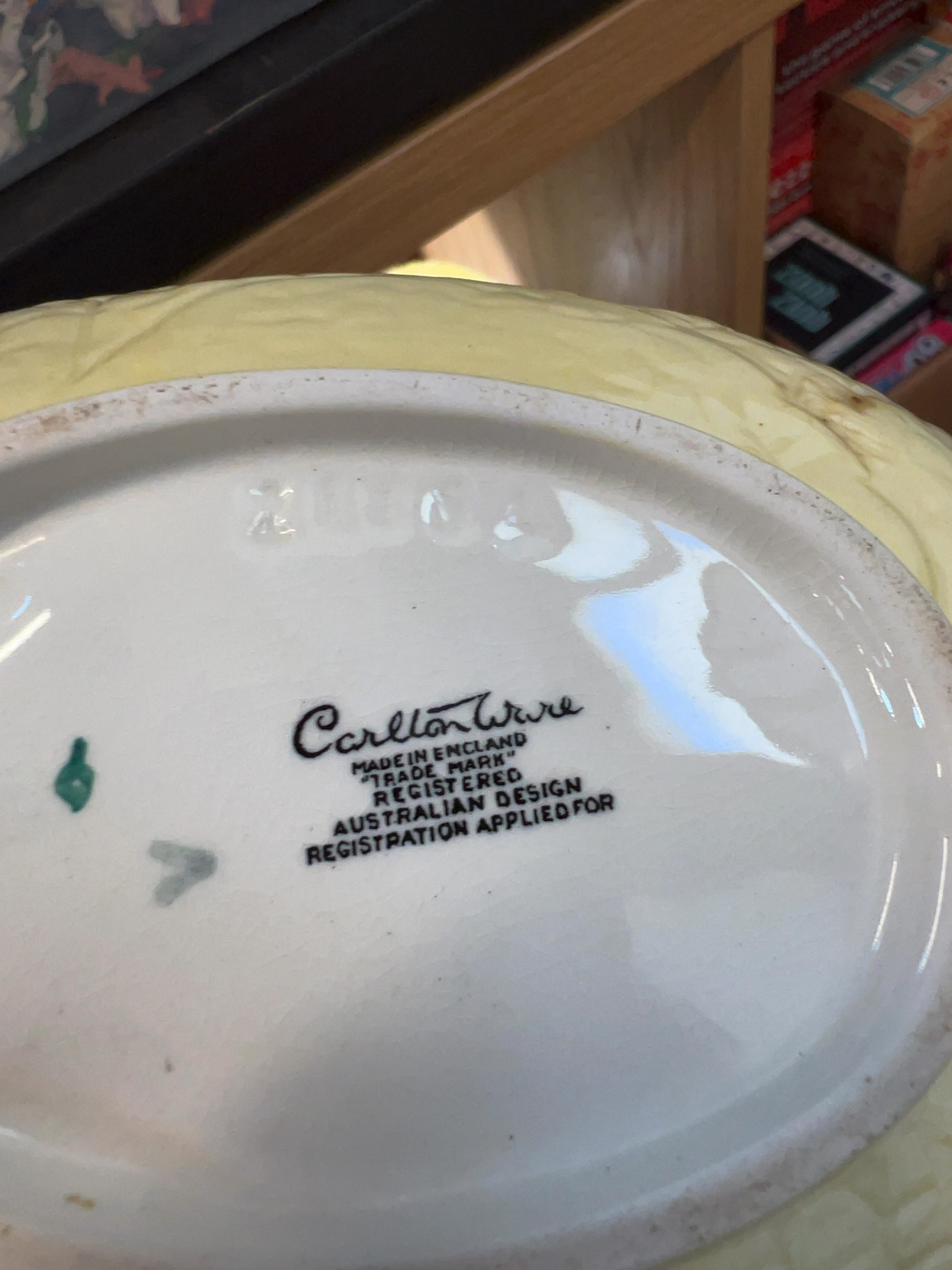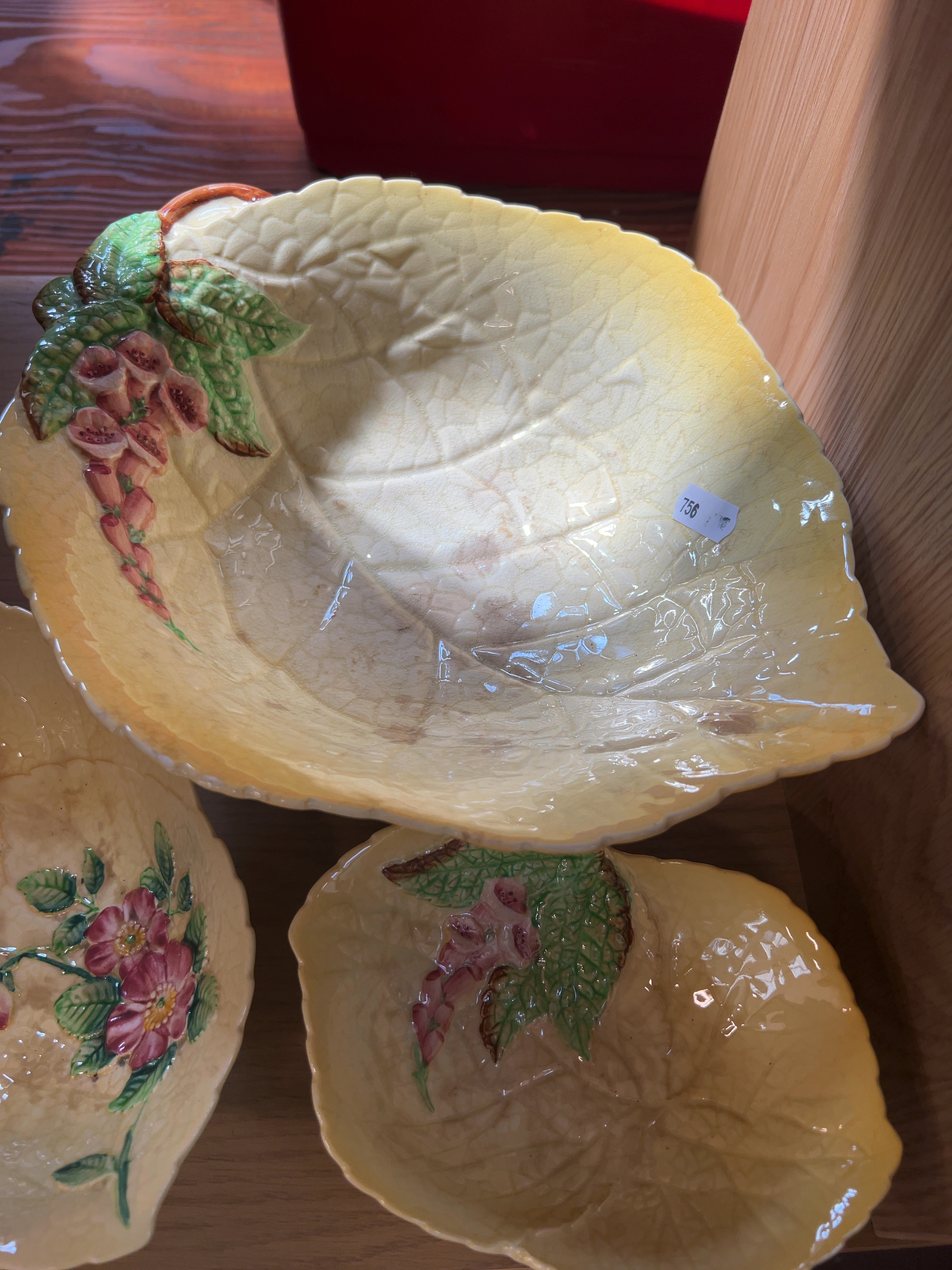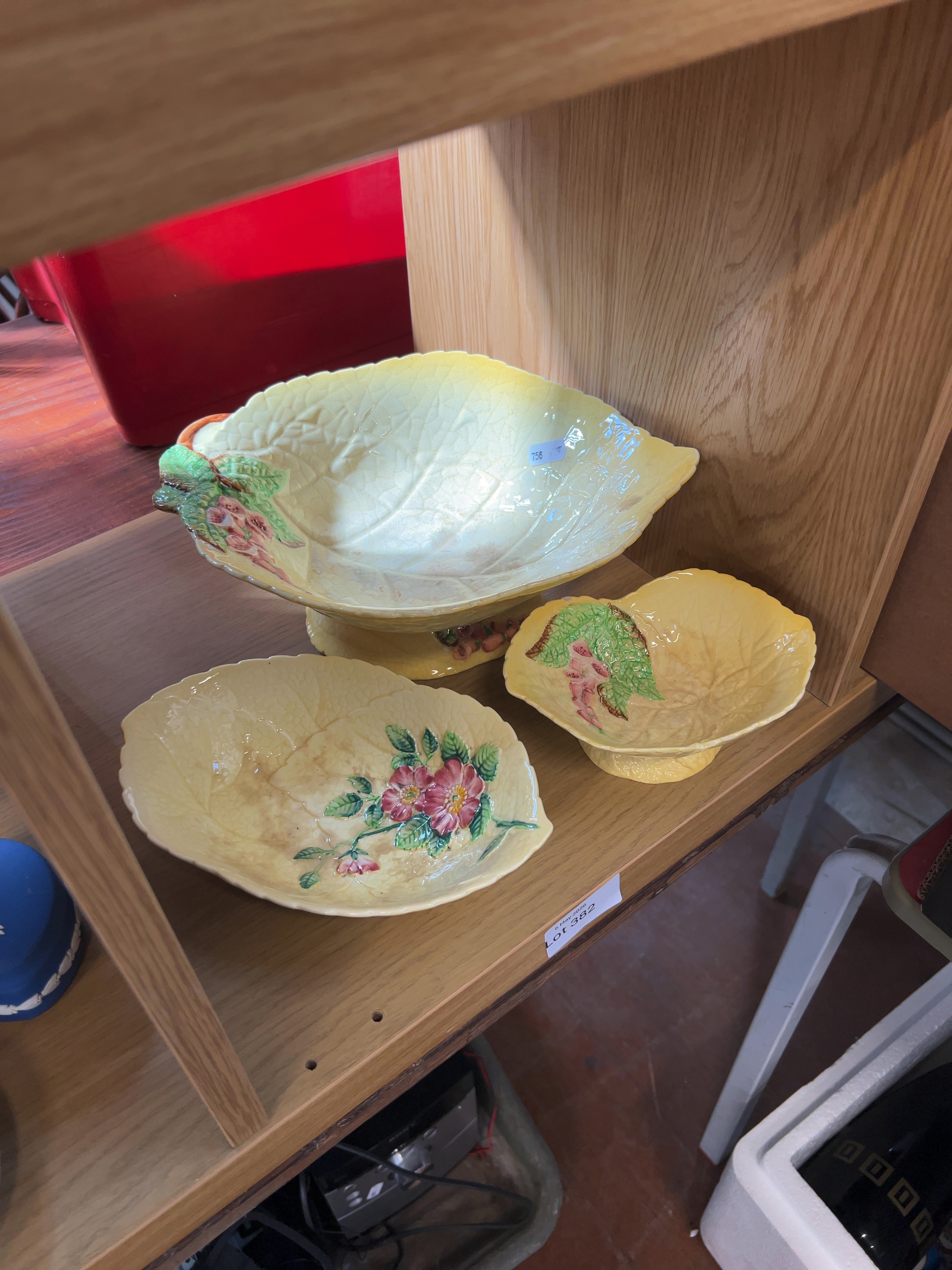 A trio of Carlton Ware earthenware pieces from the Australian Design series, manufactured by Wiltshaw & Robinson Ltd, Stoke-on-Trent including a large footed bowl of leaf-form, a smaller footed leaf-form bowl, and a shallow leaf-shaped dish.