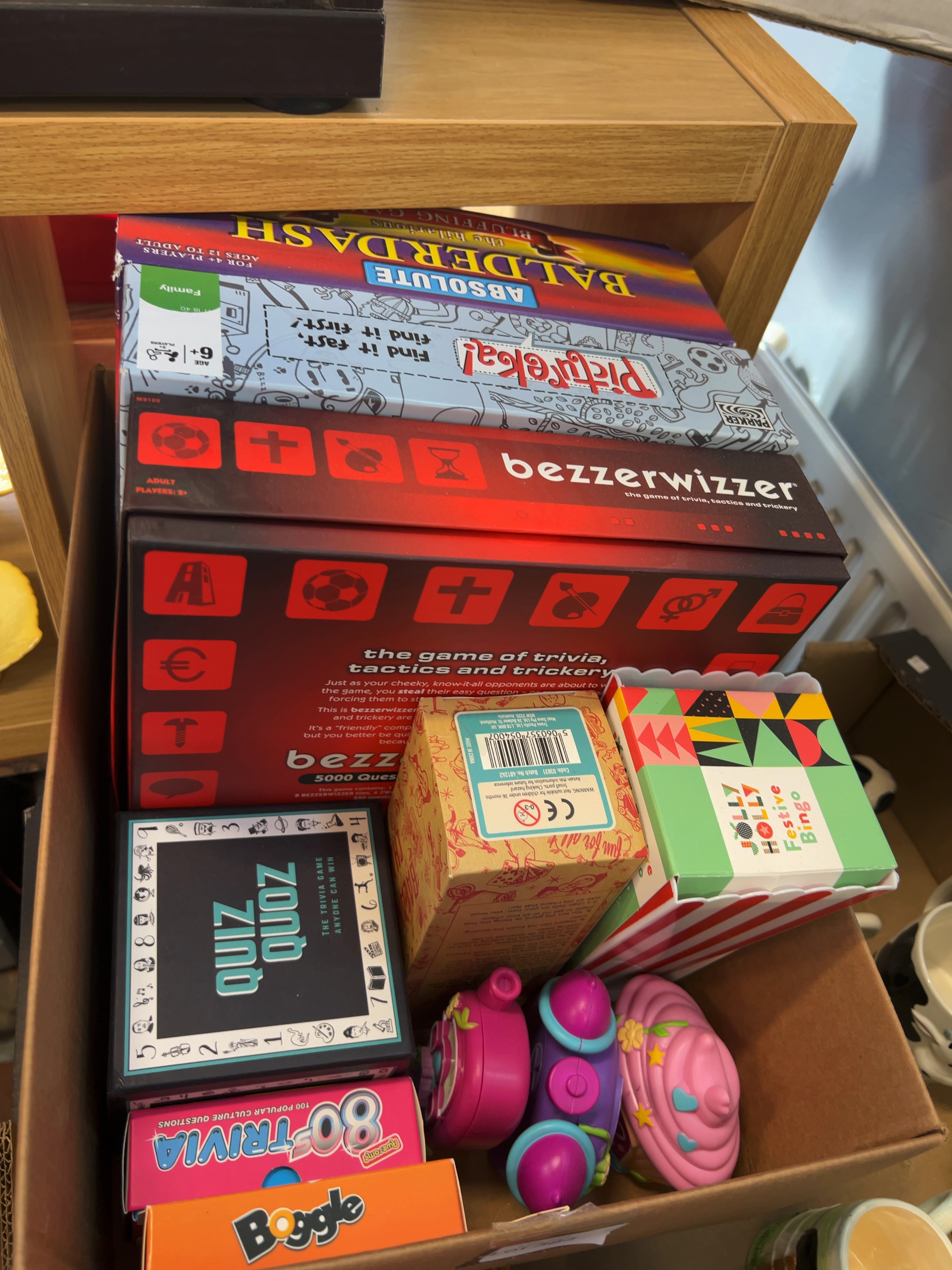 The board games are housed in original packaging which shows various degrees of shelf and storage wear, including edge rubbing, corner scuffing, and light creasing. The contents of the boxes have not been verified for completeness or functional order. Loose plastic toys exhibit signs of previous play wear.