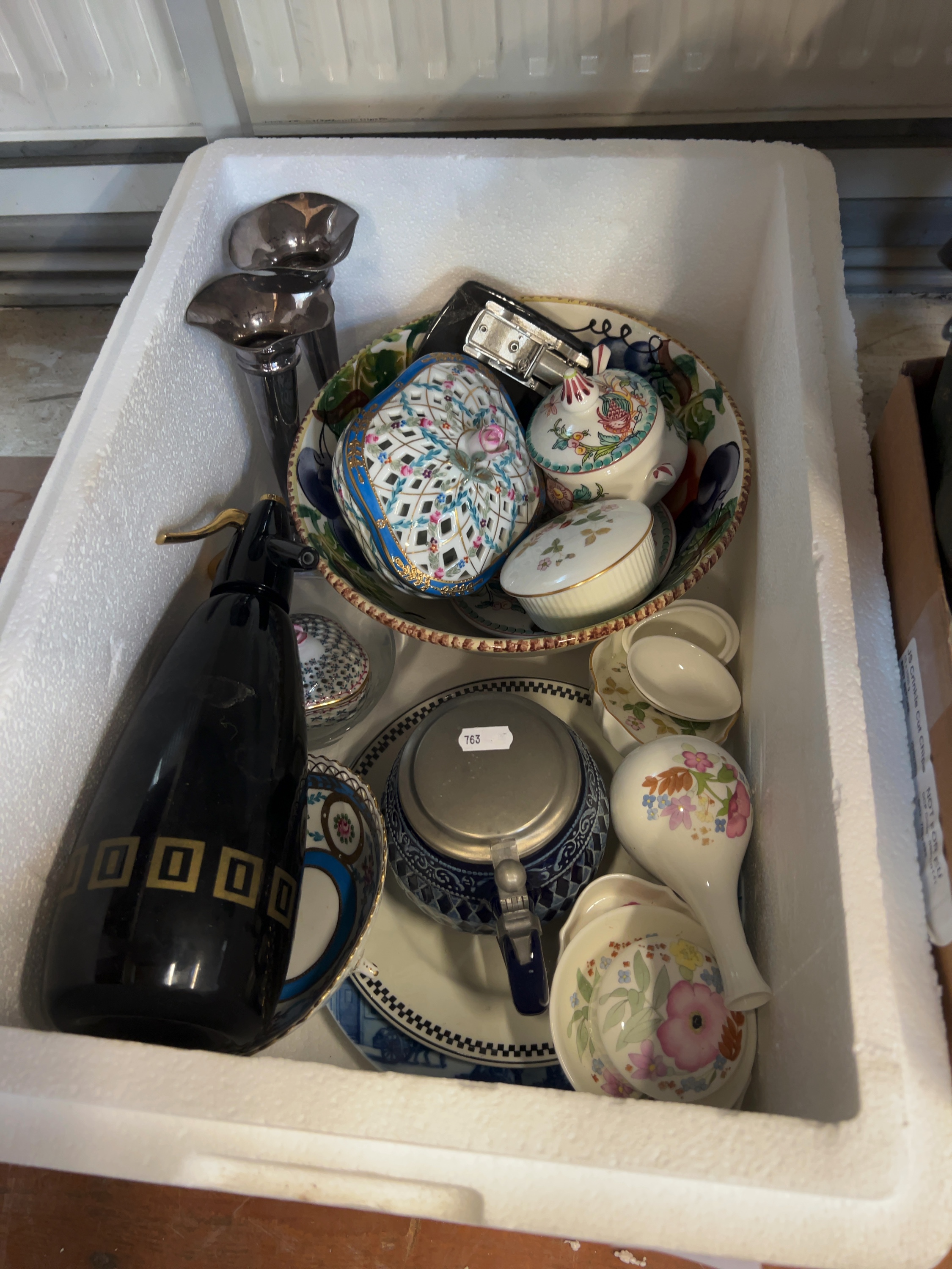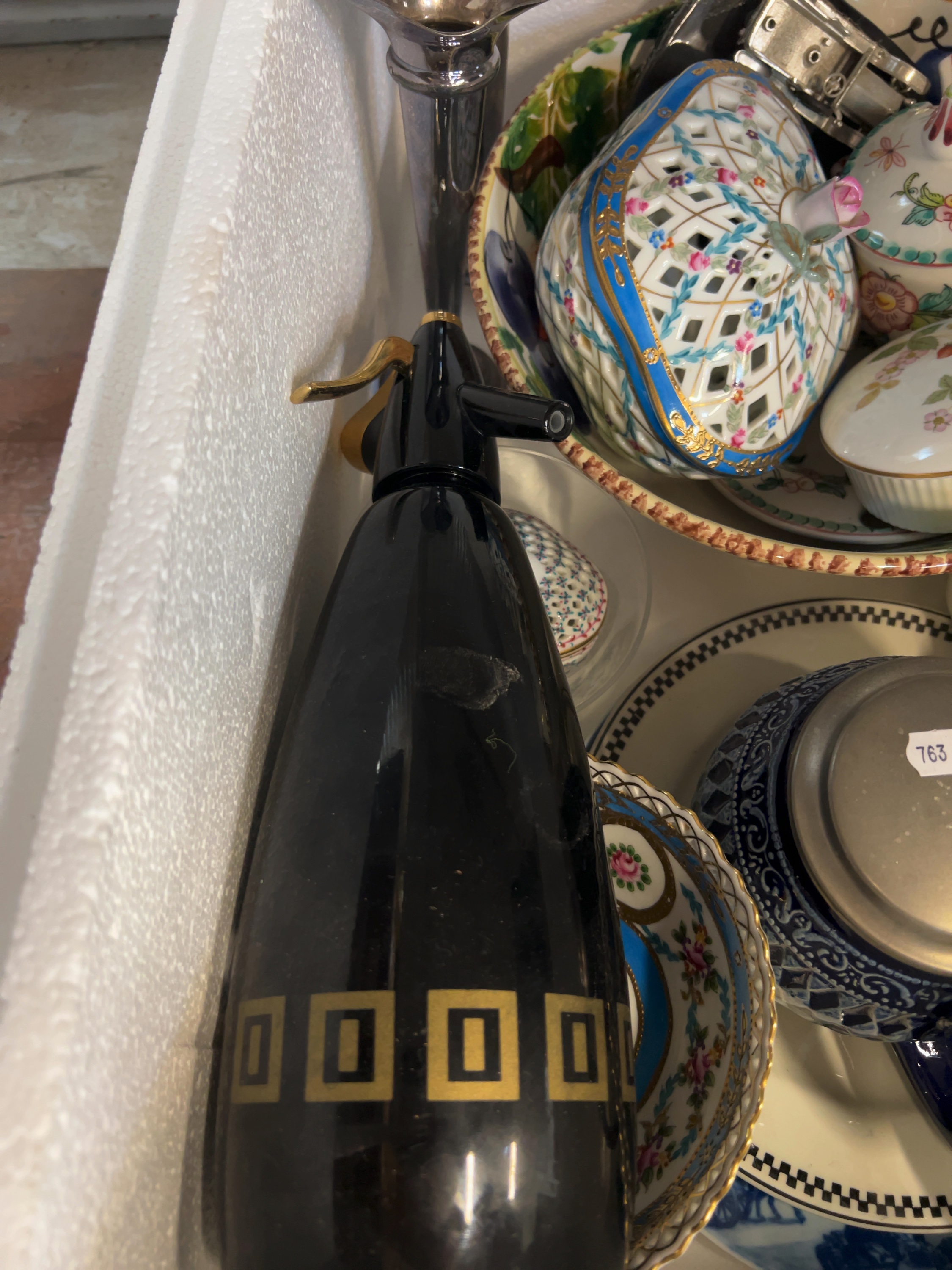 The items generally appear to be in used condition. There is visible wear to the gilded bands on the soda syphon. Across the collection, some items show minor surface scratches and rubbing to the decoration consistent with age and handling.