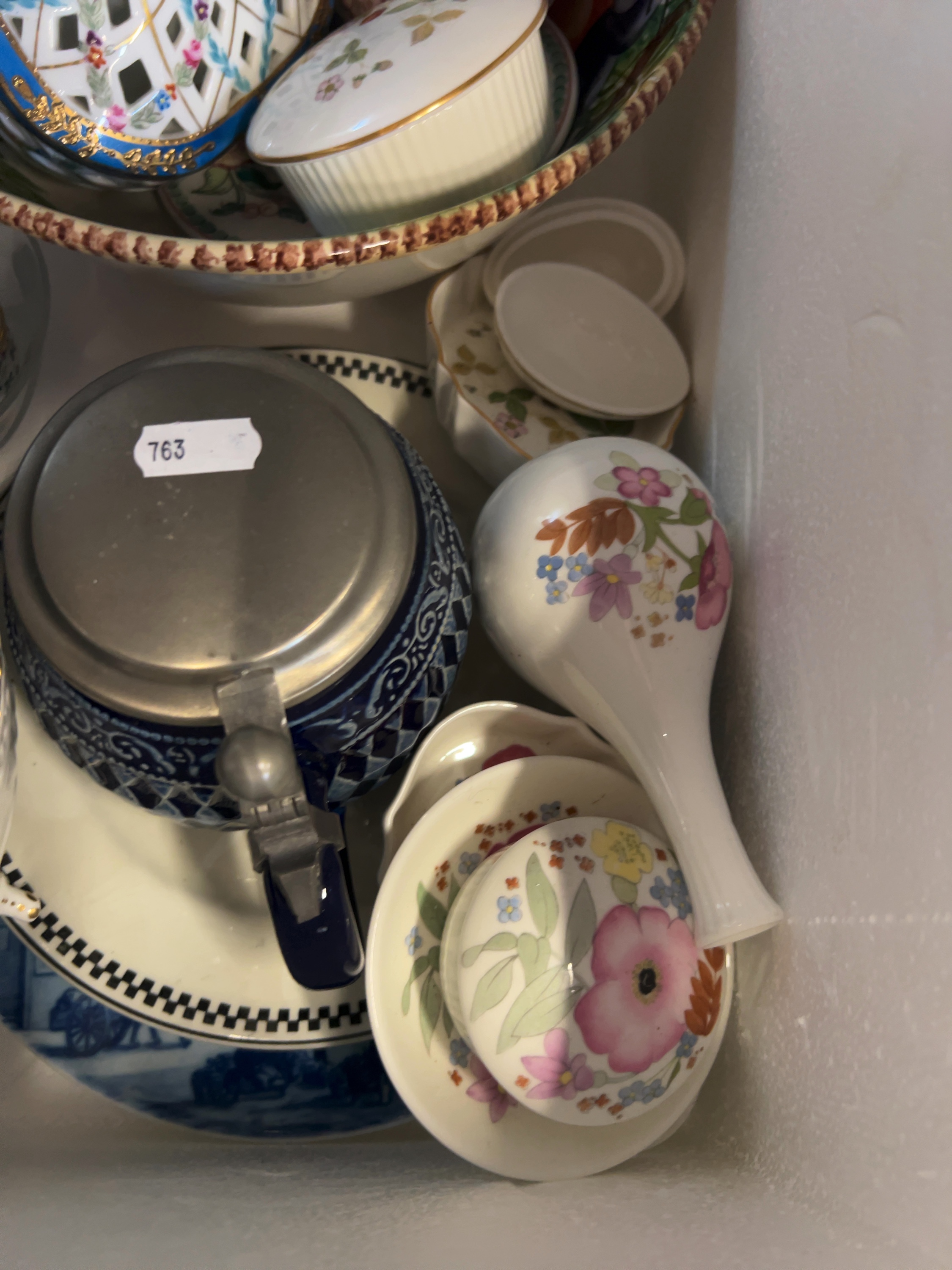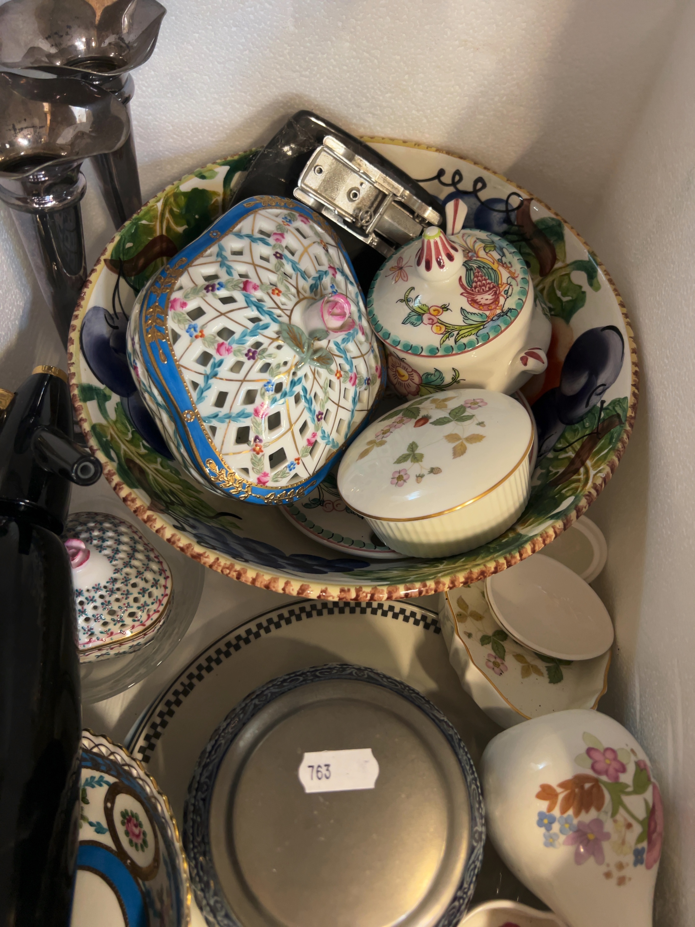 A collection of various decorative objects and tableware comprising glass, porcelain, and metal items.