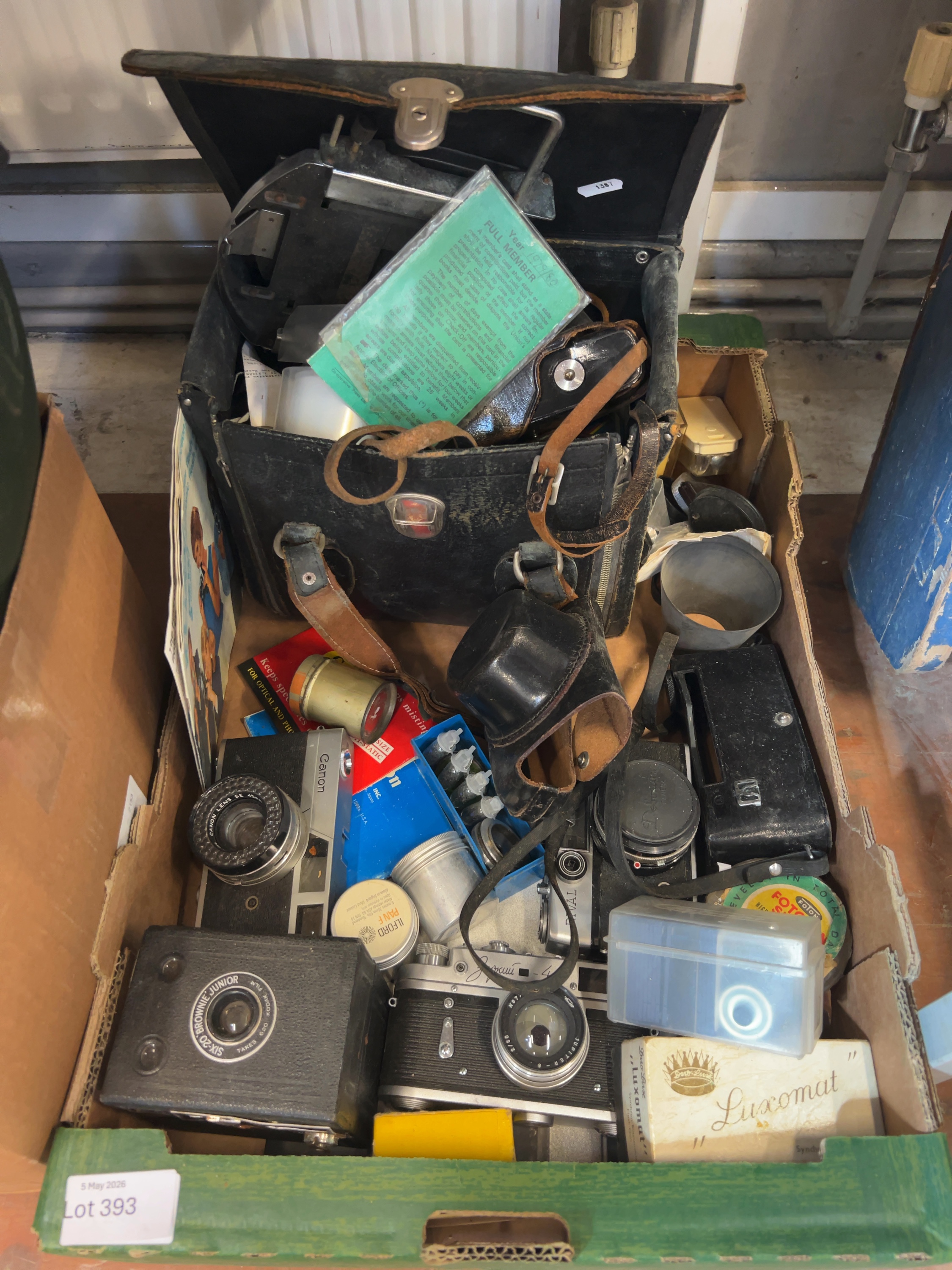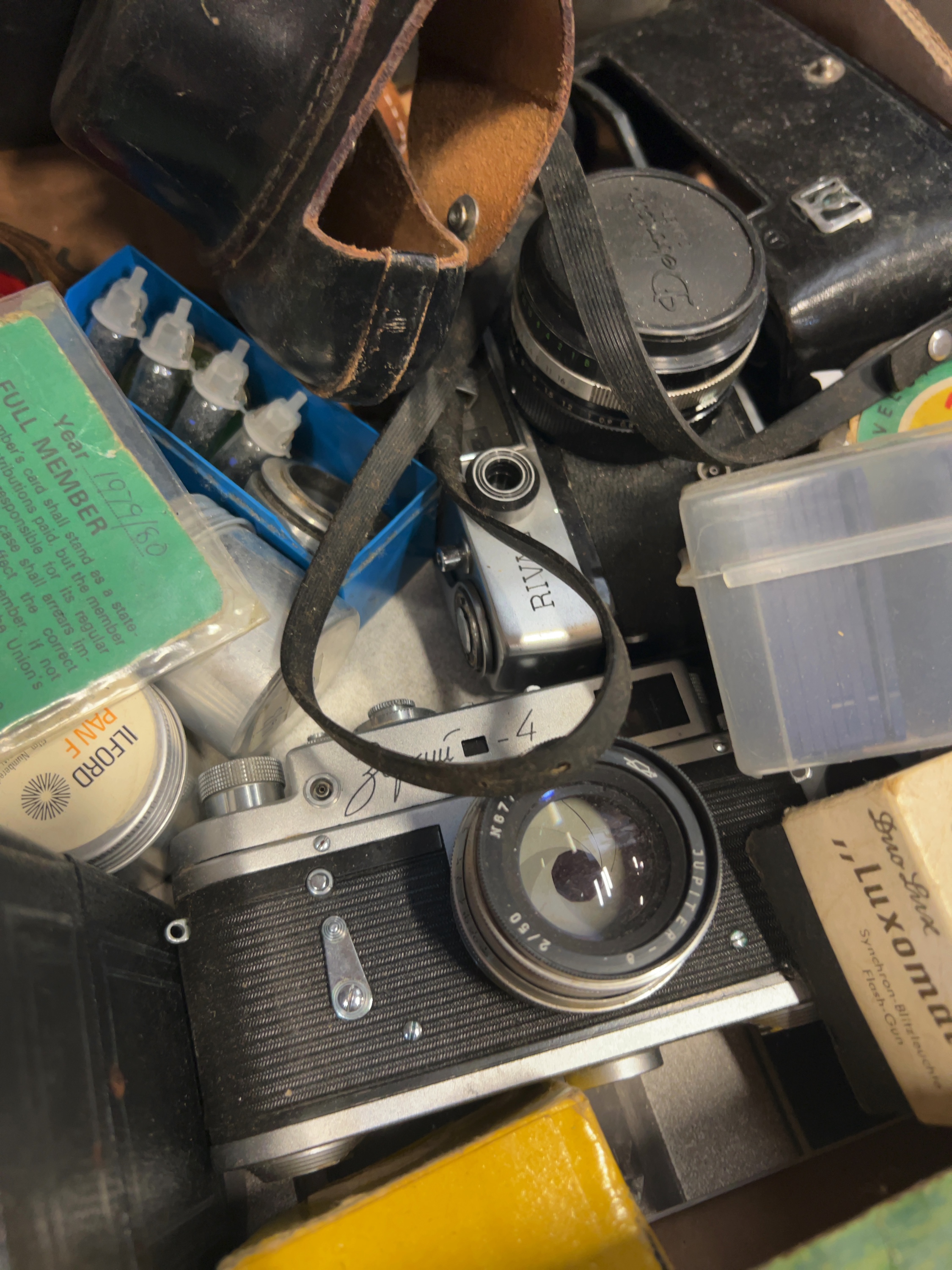 An assortment of mid-20th-century cameras and photographic equipment, contained within a vintage black leatherette camera bag and a green cardboard crate. Notable camera bodies include a Soviet Zorki-4 35mm rangefinder camera with Cyrillic script markings, fitted with a Jupiter-8 2/50 lens; a Kodak Six-20 Brownie Junior box camera produced in England; and a Canon 35mm camera with a Canon Lens SE; a Riva compact camera and a black camera body fitted with a Pentax lens cap. Associated accessories include a boxed Duo-Lux Luxomat Synchron-Blitzleuchte flash-gun, an Ilford Pan F film tin, several leatherette camera cases, and various lens filters and canisters. Ephemera includes a green membership card holder for a photographic organisation or club, dated 1979/80.