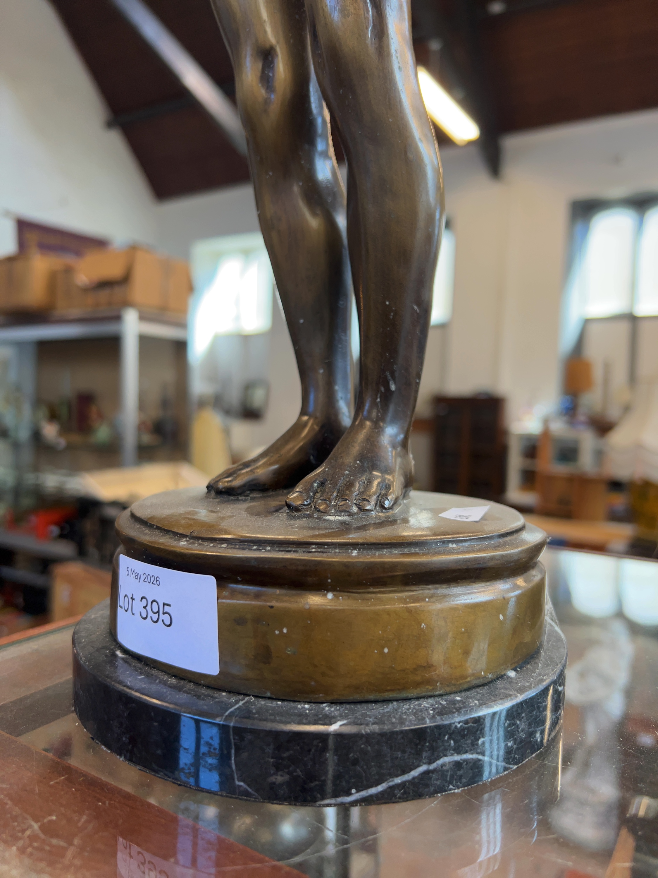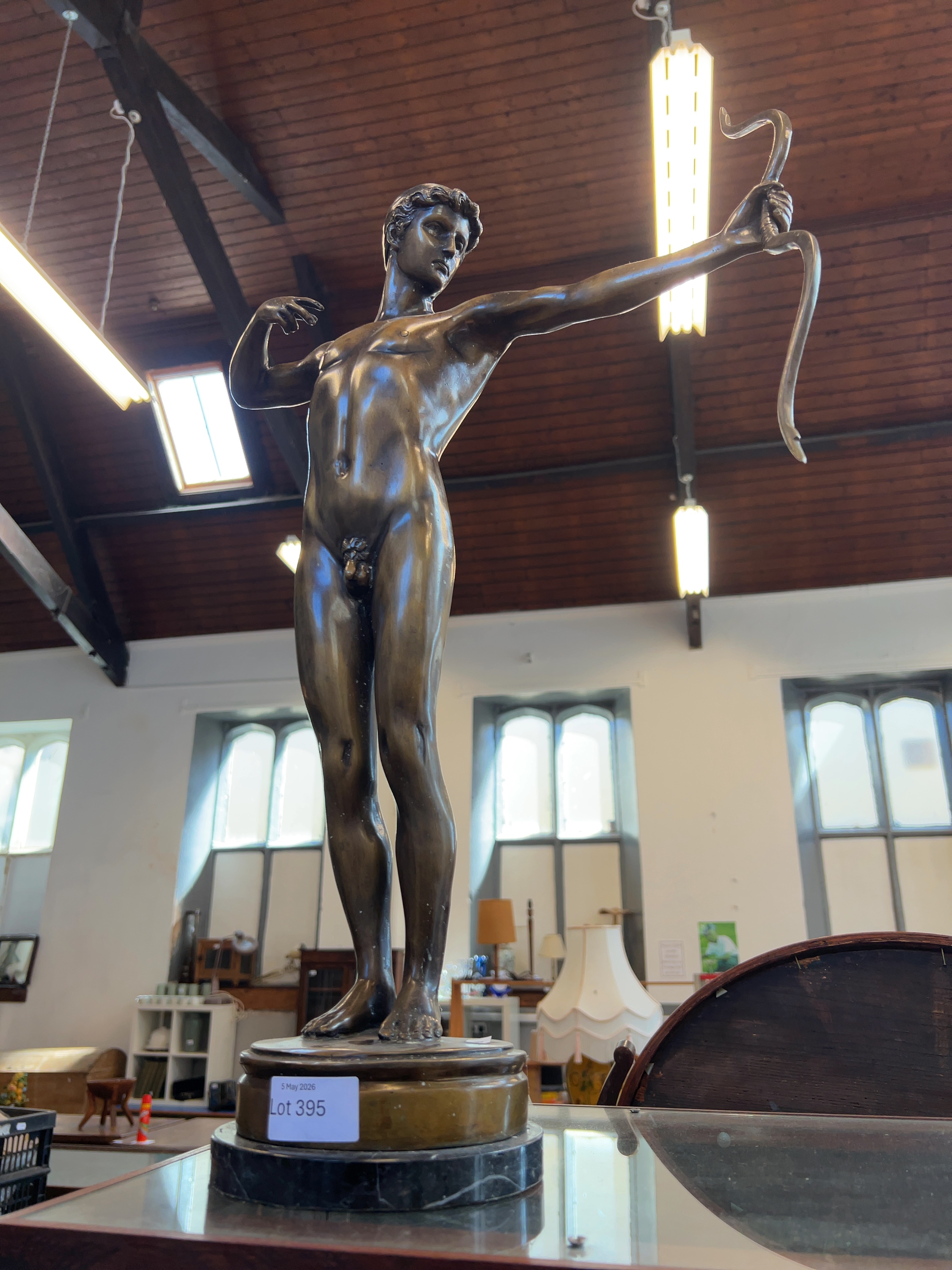 A cast bronze sculpture depicting a slender nude male youth in the guise of an archer, standing in a classical pose with his left arm extended holding a bow and his right arm retracted. The work features athletic proportions and stylised, tightly curled hair. The bronze is finished with a medium-to-dark brown patina. The figure is positioned upon an integrated circular stepped bronze base, further mounted on a polished circular black marble plinth with light white veining. No signatures, foundry marks, or edition numbers are visible. The bow is present, however, the wire string is absent.