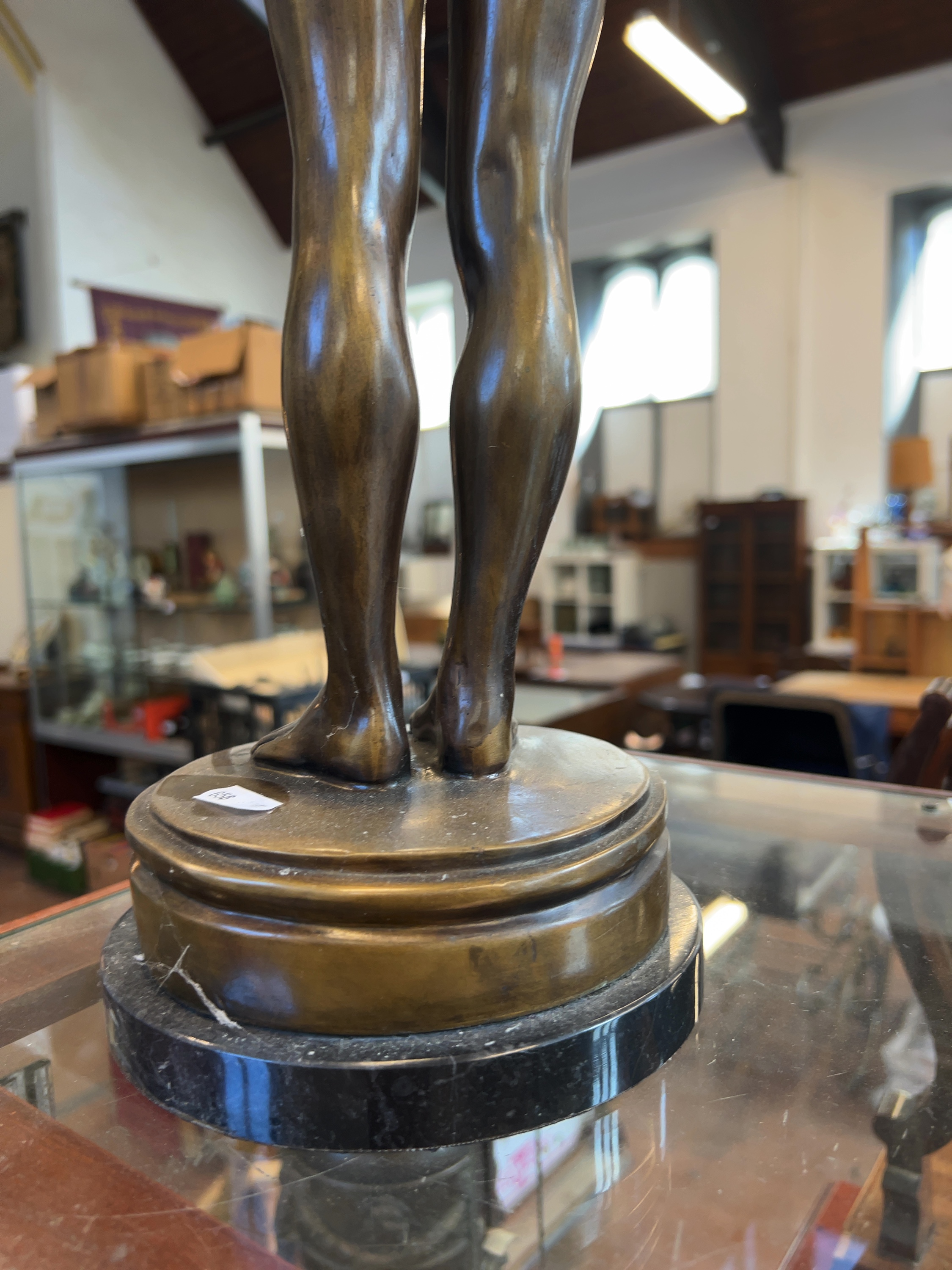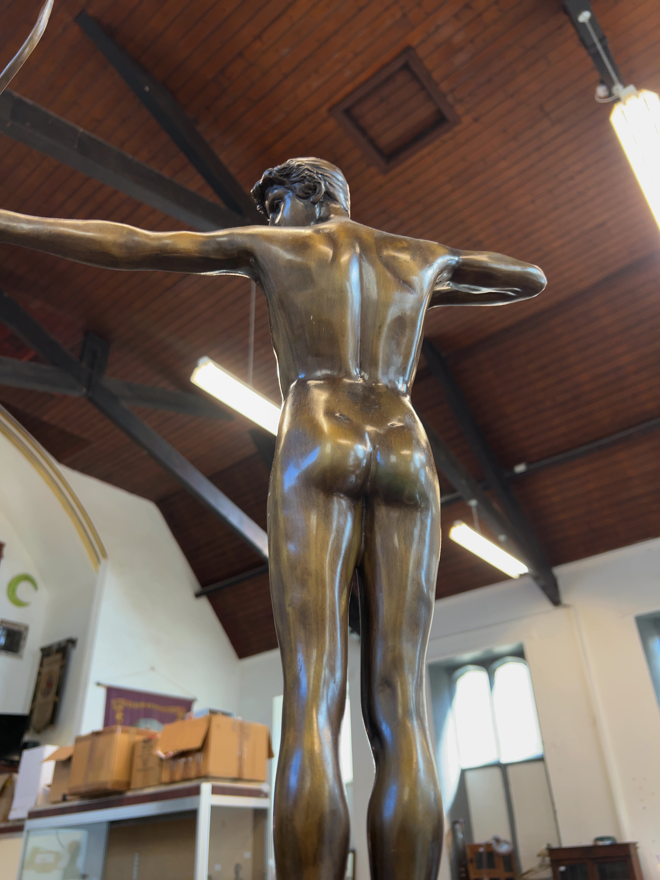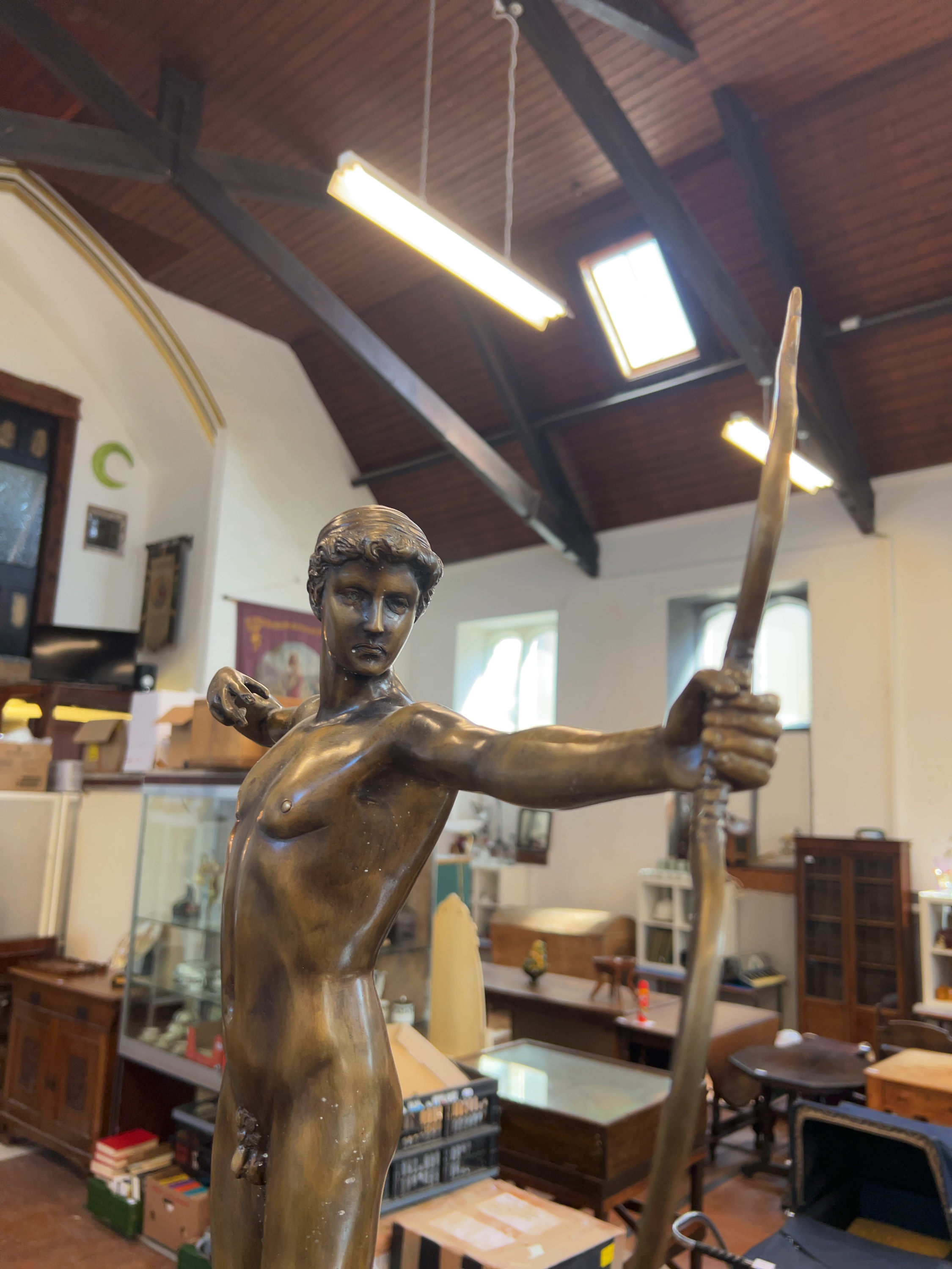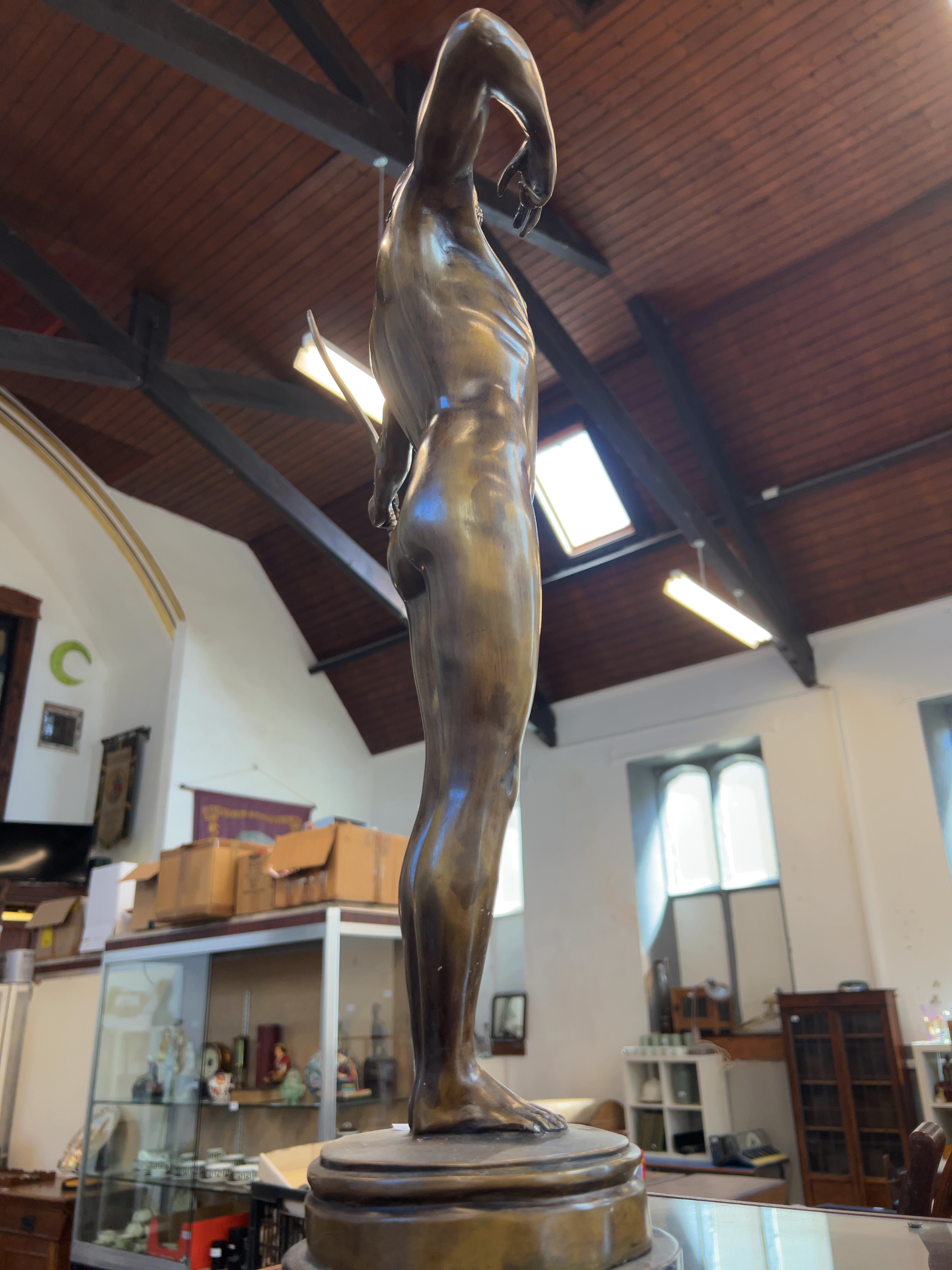 The sculpture is in good overall condition. There are scattered white speckling and surface deposits visible, primarily on the lower legs and base. Minor surface dust is present throughout. The wire bowstring is missing.